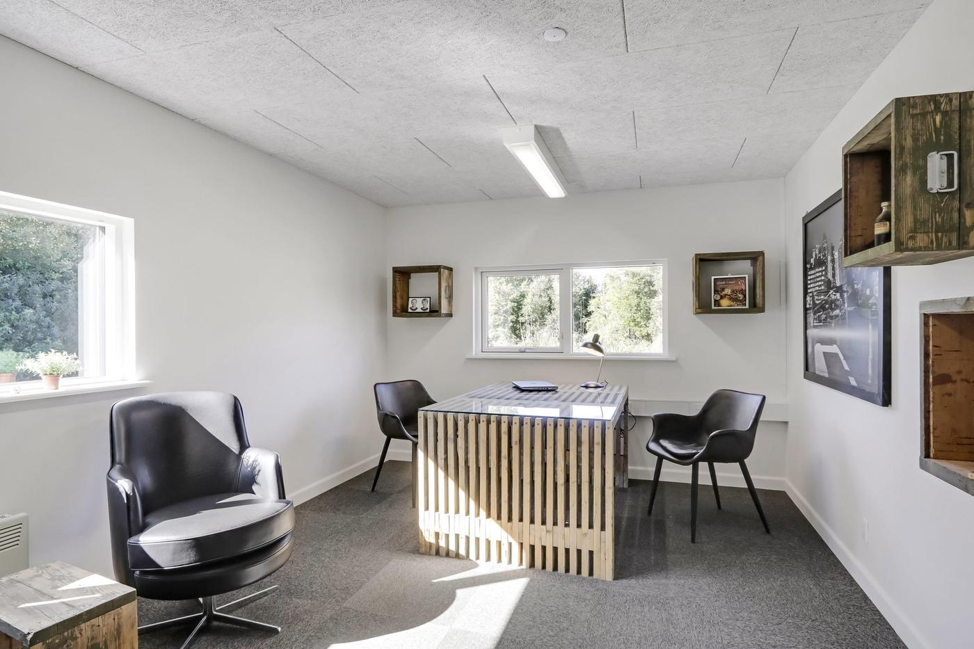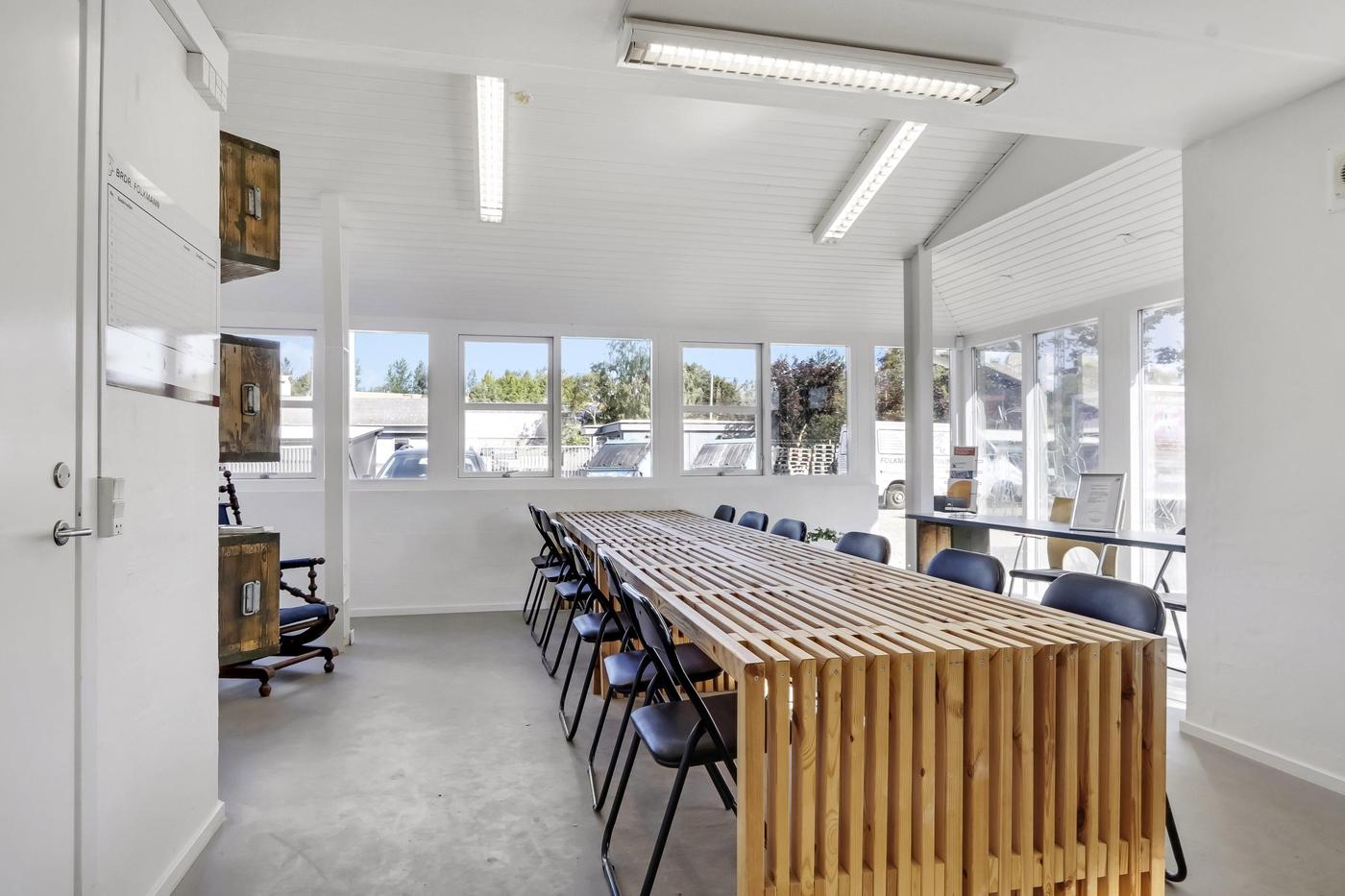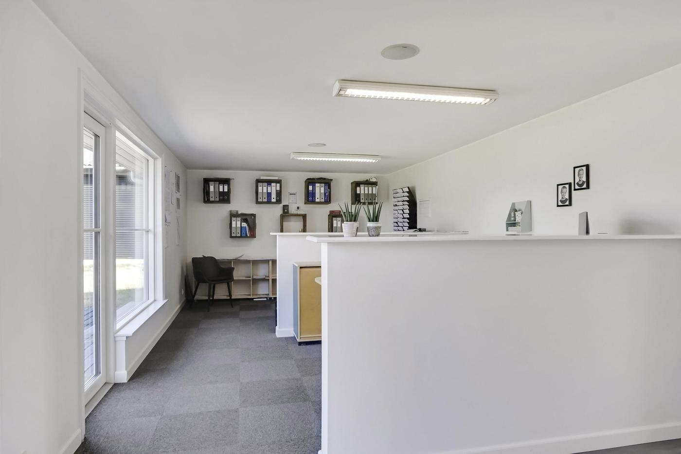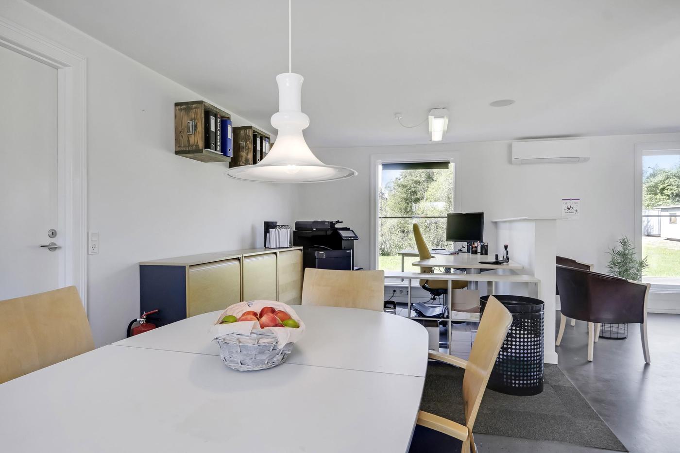 Udover værkstedsbygningen findes separat ejendom, der anvendes til kontor. Bygningen er indrettet med entre med badeværelse med brus, stort åbent kontorlandskab med pt. 3 arbejdspladser. I åben forbindelse med kontorområdet findes køkken med spiseplads. Herudover separat kontor og depotrum.