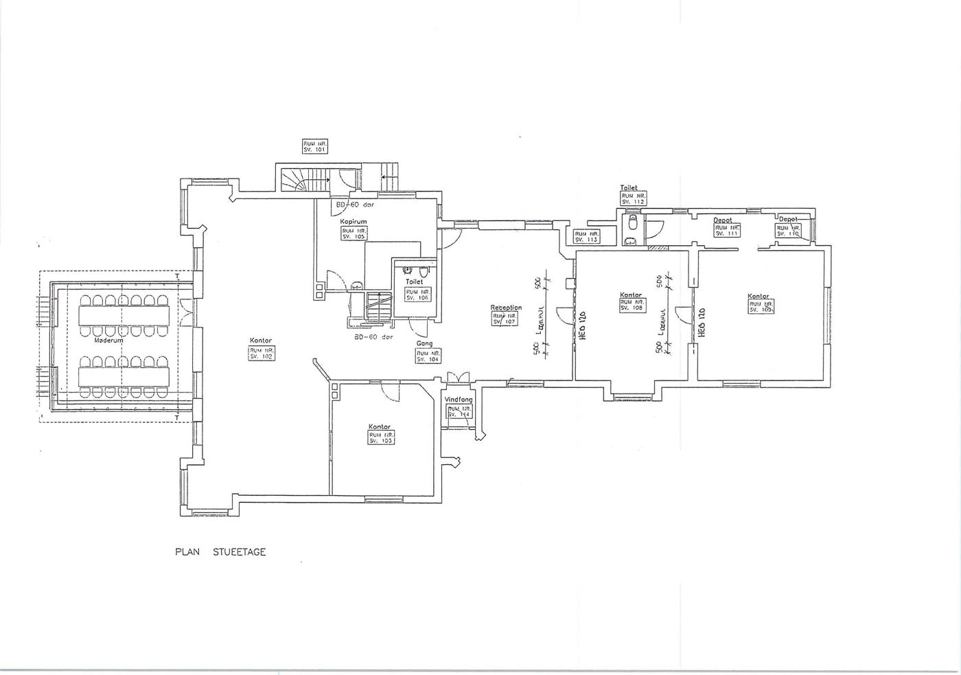 Ejendommen entreres fra det småstensbelagte parkeringsareal. Man får hurtigt fornemmelsen af at træde ind i en velholdt, rummelig og indbydende ejendom, med dejlige højloftede rum, flere med imponerende stuklofter. Stueetagens 360 m² er indrettet med receptionsafsnit midt i ejendommen. Derudover er stueetagen indrettet med 3 kontorer, et åbent kontormiljø samt printerrum. Etagen er forsynet med 2 toiletter. Ejendommen er i 2005 blevet tilført et flot og lyst mødelokale med loft til kip på ca. 40 m² med udgang til have og parkeringsarealet. Samlet set vil ejendommen, afhængigt af anvendelsen, have kapacitet på op til 18 arbejdspladser i stueetagen. En velindrettet og rummelig stueetage i flot og velholdt stand.