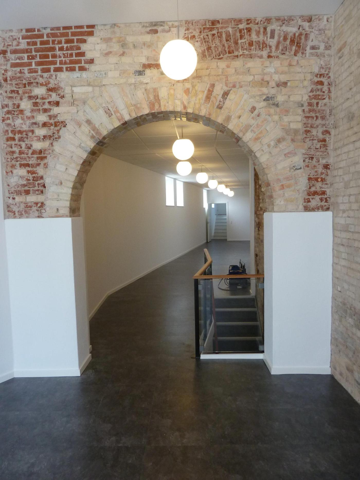 Samtlige gulve er støbt på ny, og der er opsat nyt loft med ny grundbelysning. Væggene fremstår delvist med gips og mursten, hvor lejemålets forreste del fremstår med rå murstensvægge.