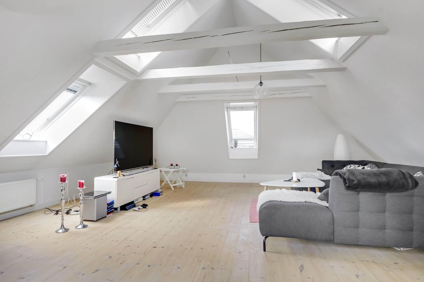 Lejligheden på 1. sal er indrettet stort set som stuelejligheden. 1. sals lejligheden har derudover adgang til et stort lyst lokale med fritlagte hanebånd i tagetagen. Endvidere har de eget depotrum i kælderen, hvor der er plads til vaskemaskine.