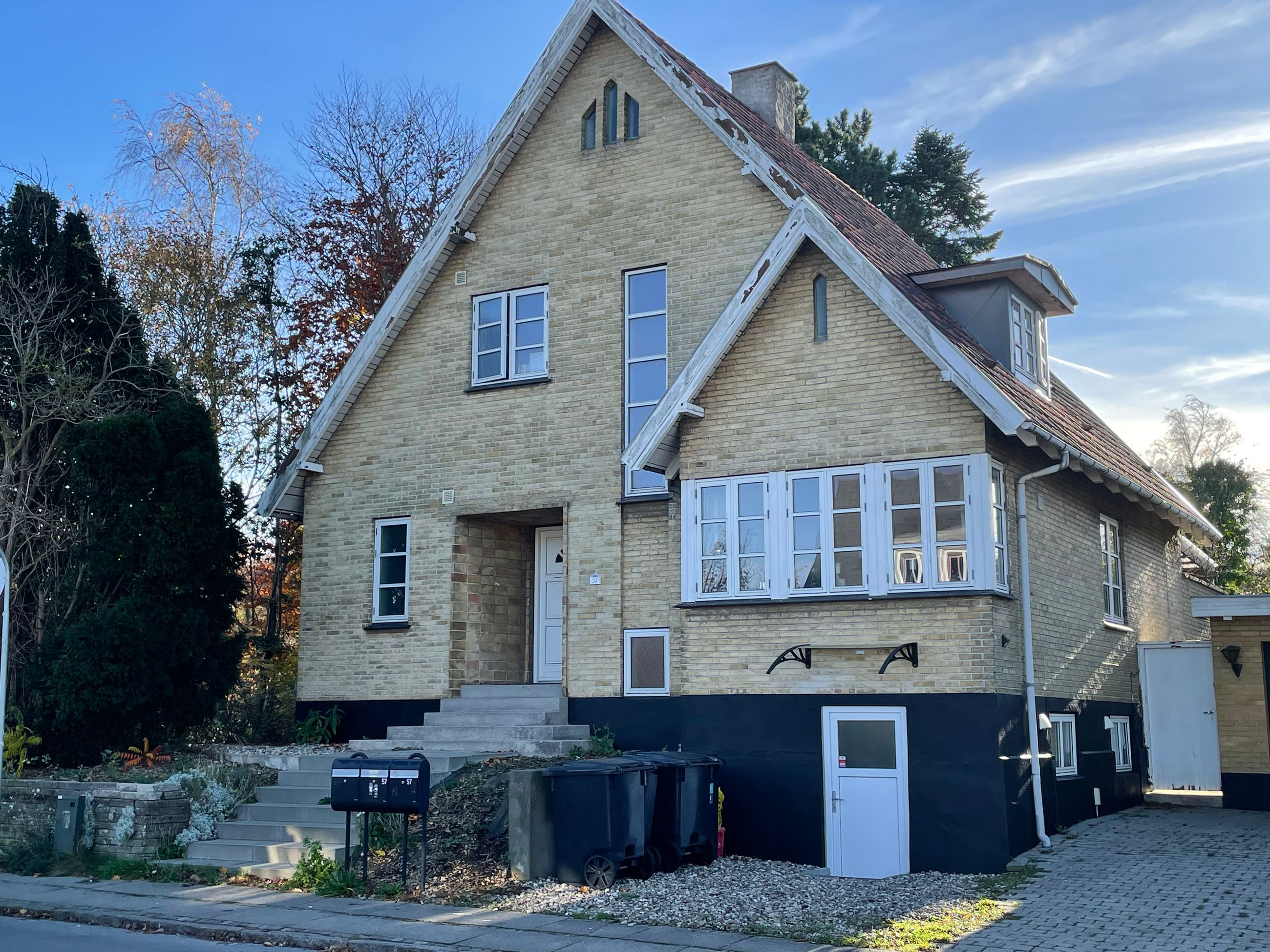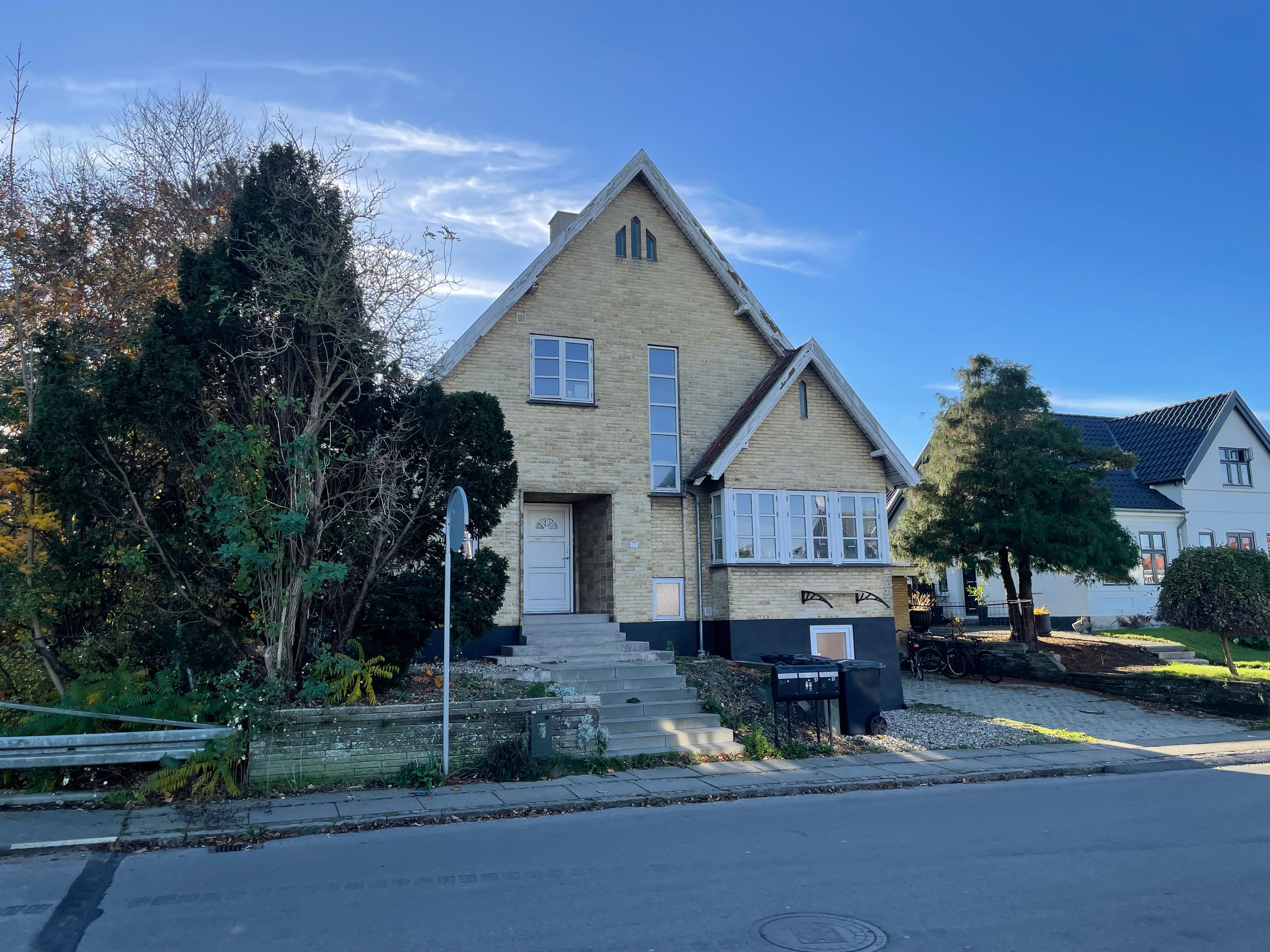 Ejendommen er opført i gule mursten og tagdækket med tegltag.