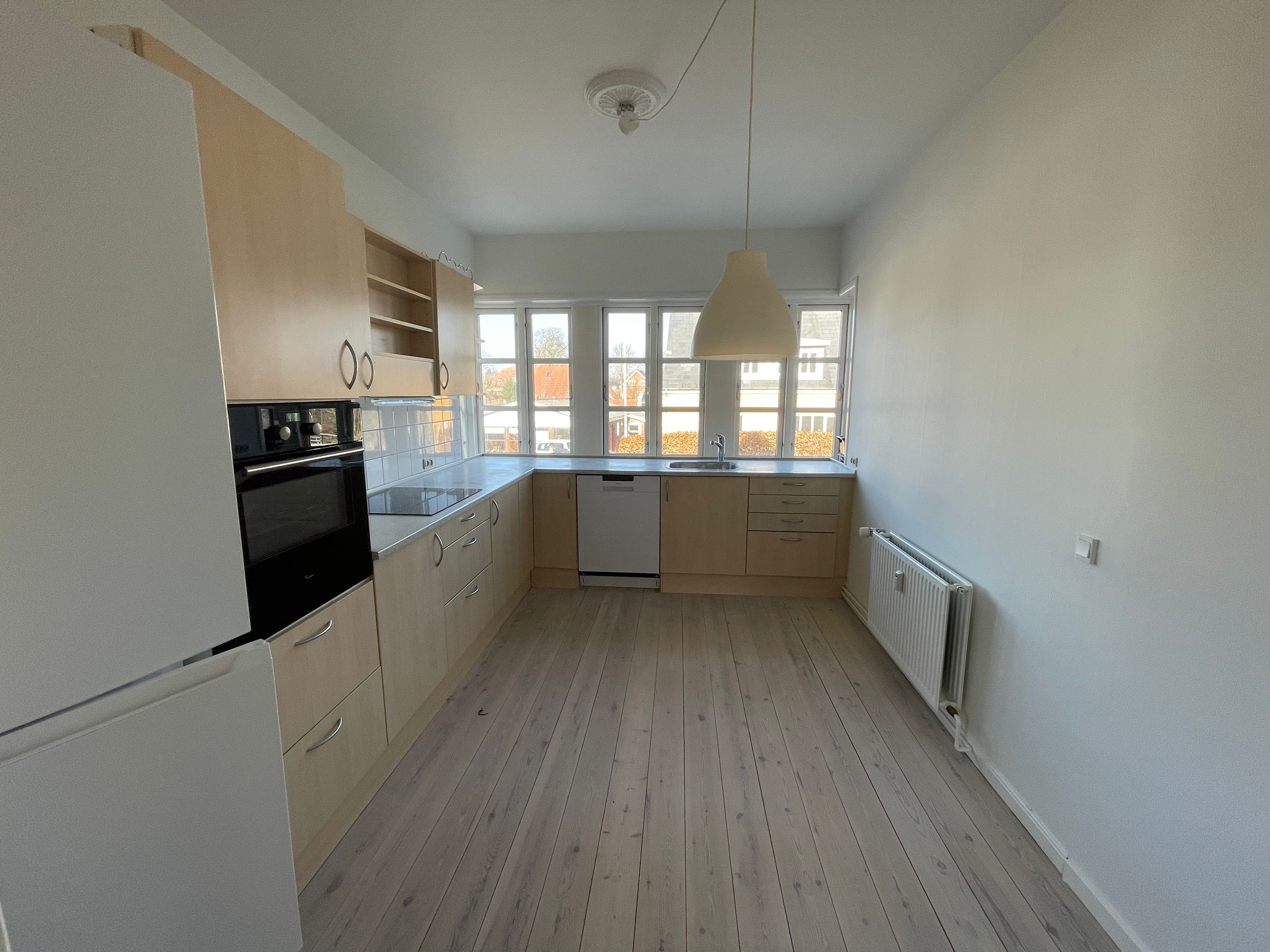 Lejligheden på 1. sal har lille entre i stueplan med trappe til 1. sal. Her findes repos, badeværelse med brusekabine, soveværelse, stort køkken/alrum med udgang til lille altan. Derudover 2 værelser og et lille depotrum.
