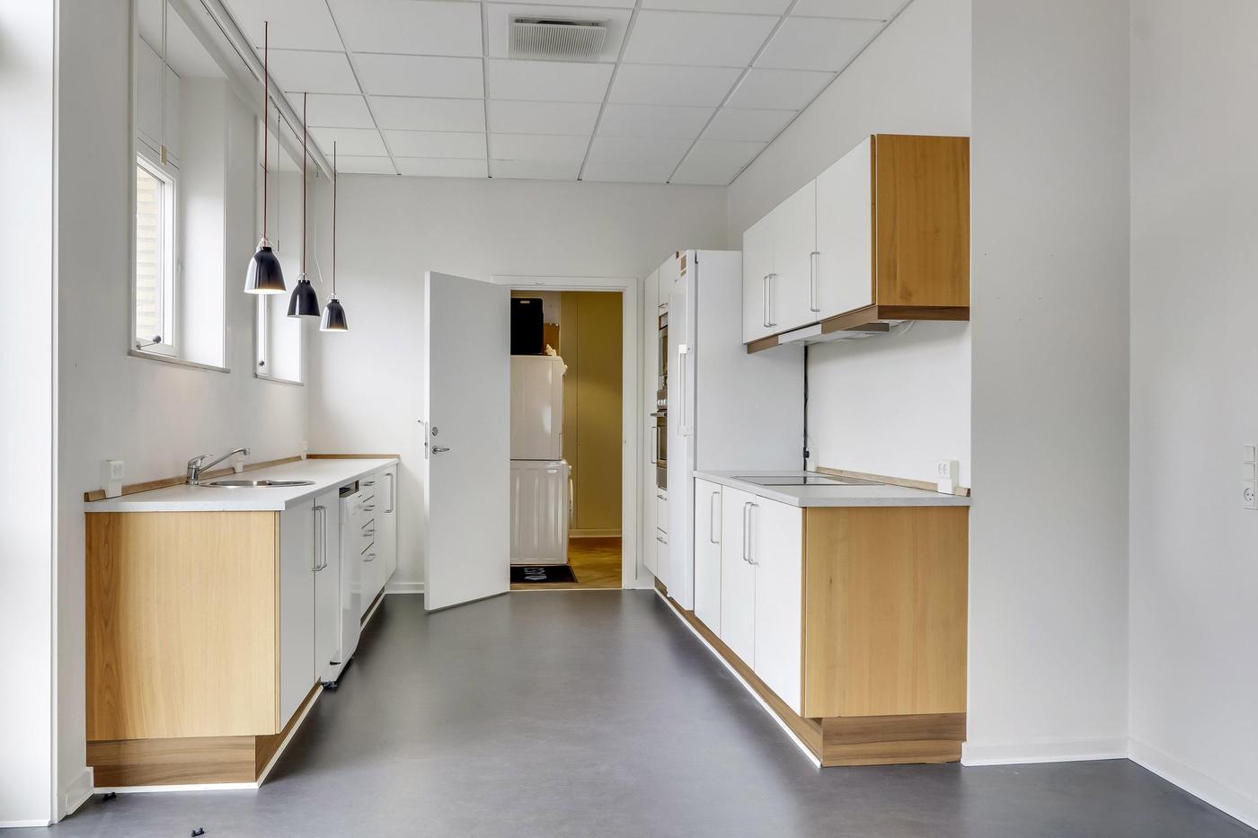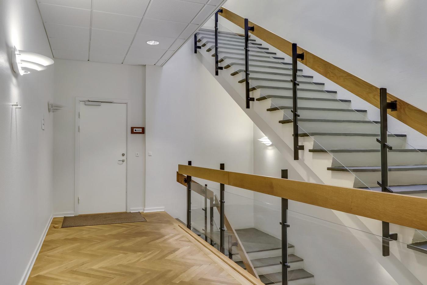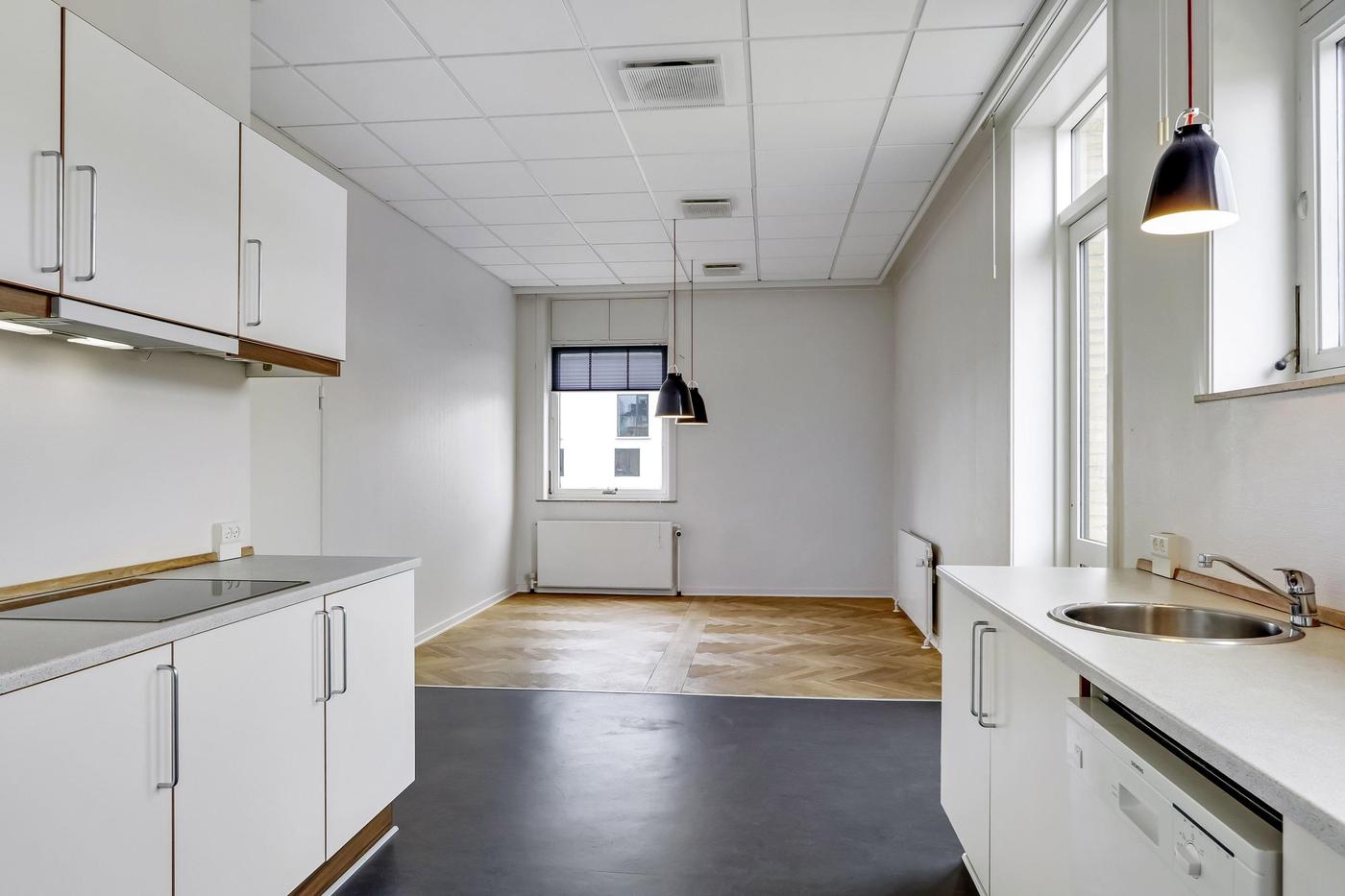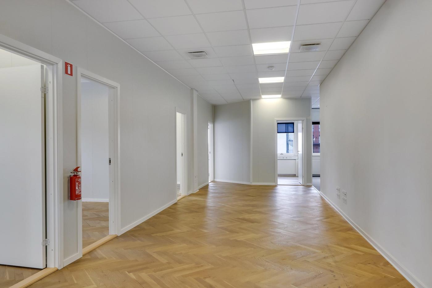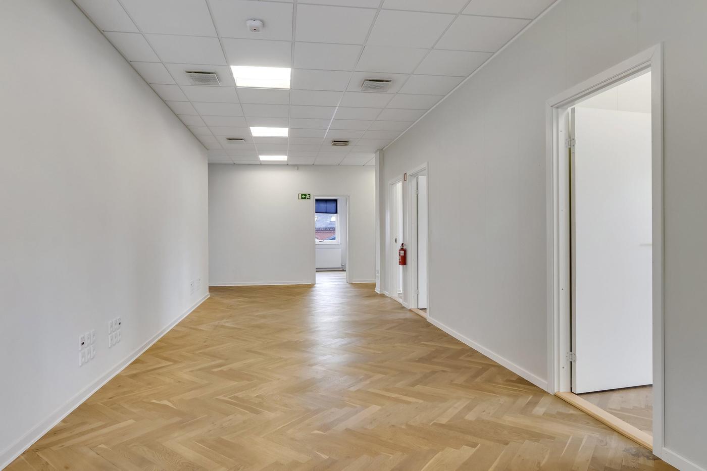 Der findes akustiklofter med grundbelysning samt pæn sildebensparket i den overvejende del af lejemålet.