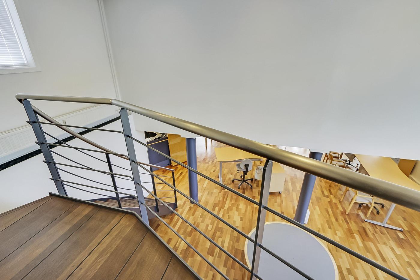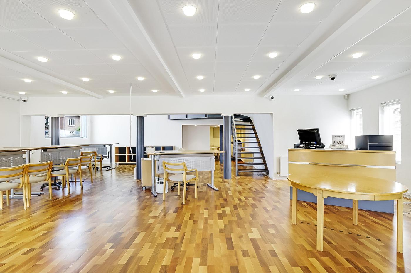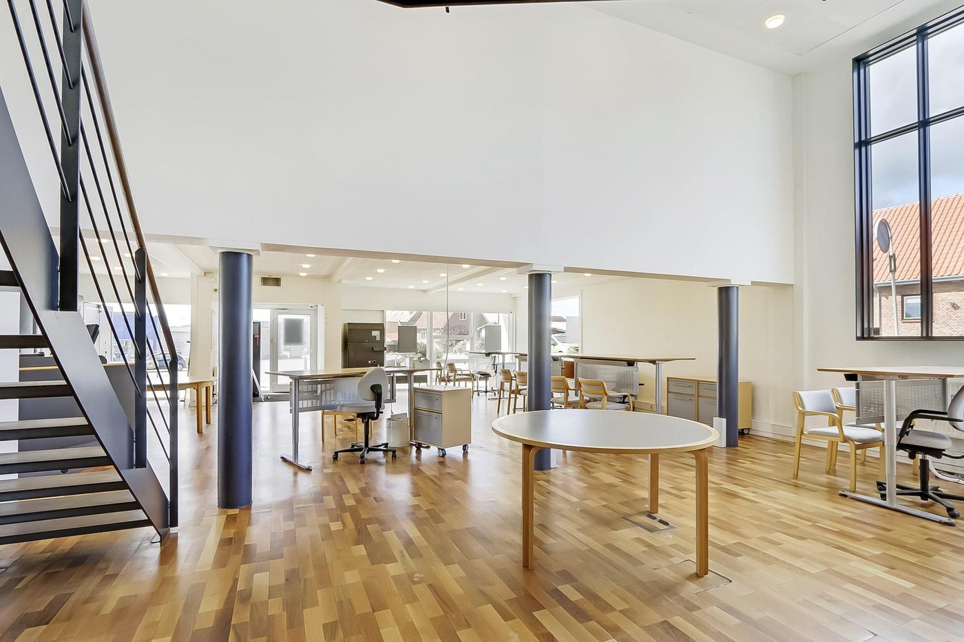 Fra ekspeditionslokalet er der etableret en intern trappe til den overliggende etage. Her er der repos, mødelokale, køkken samt toilet.