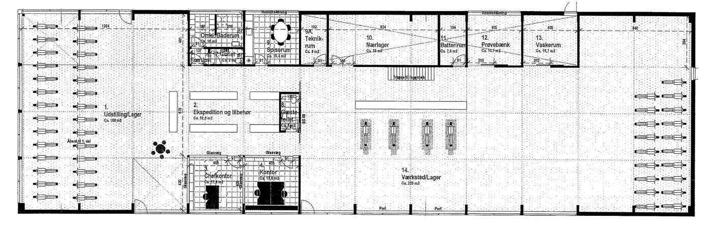 Det første afsnit med glasfacade er indrettet med udstillings- og ekspeditionsafsnit på ca. 240 m², mødelokale og kontor med glaspartier og velfærdsfaciliteter i form af frokoststue og omklædning/bad.
