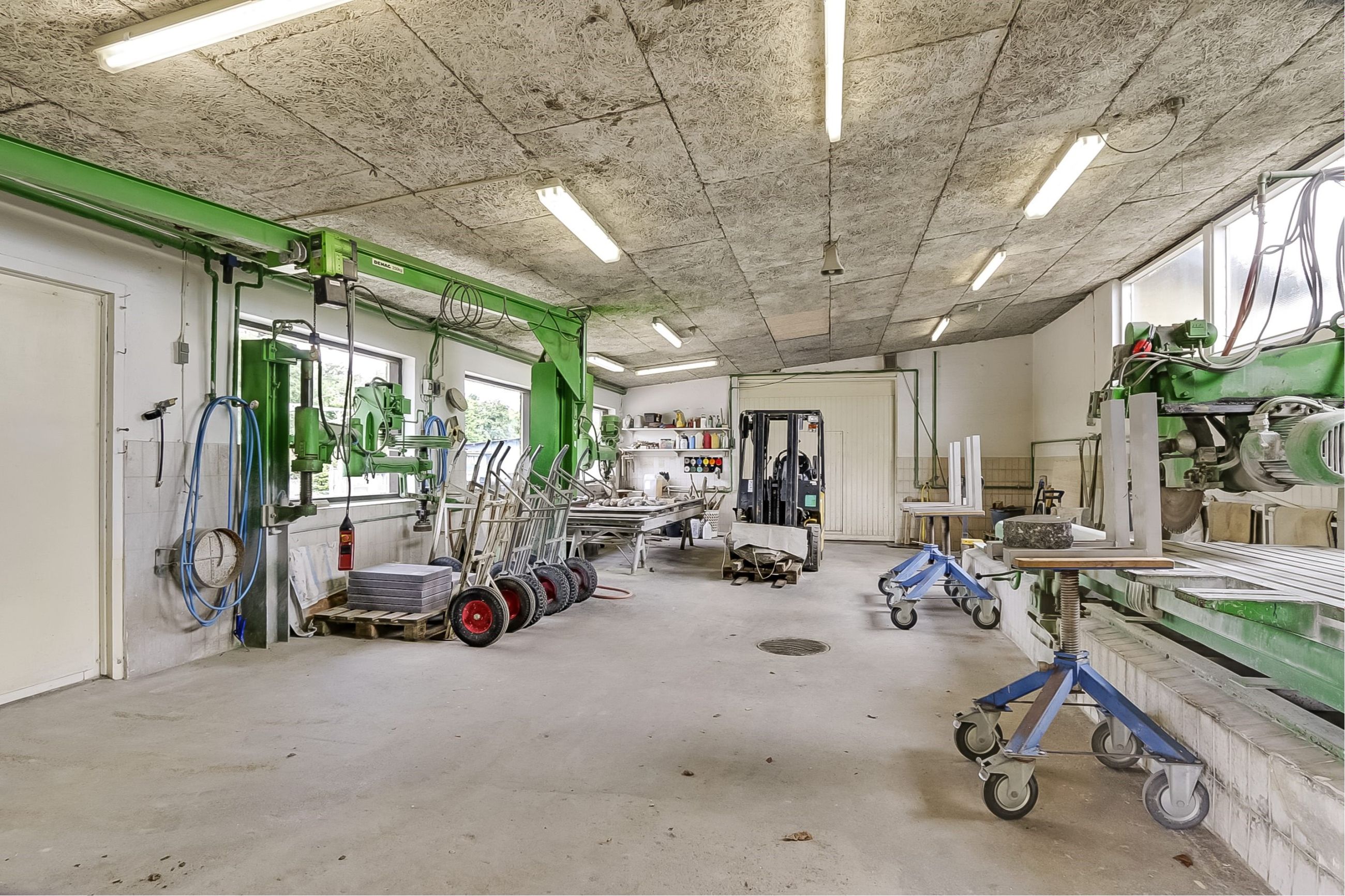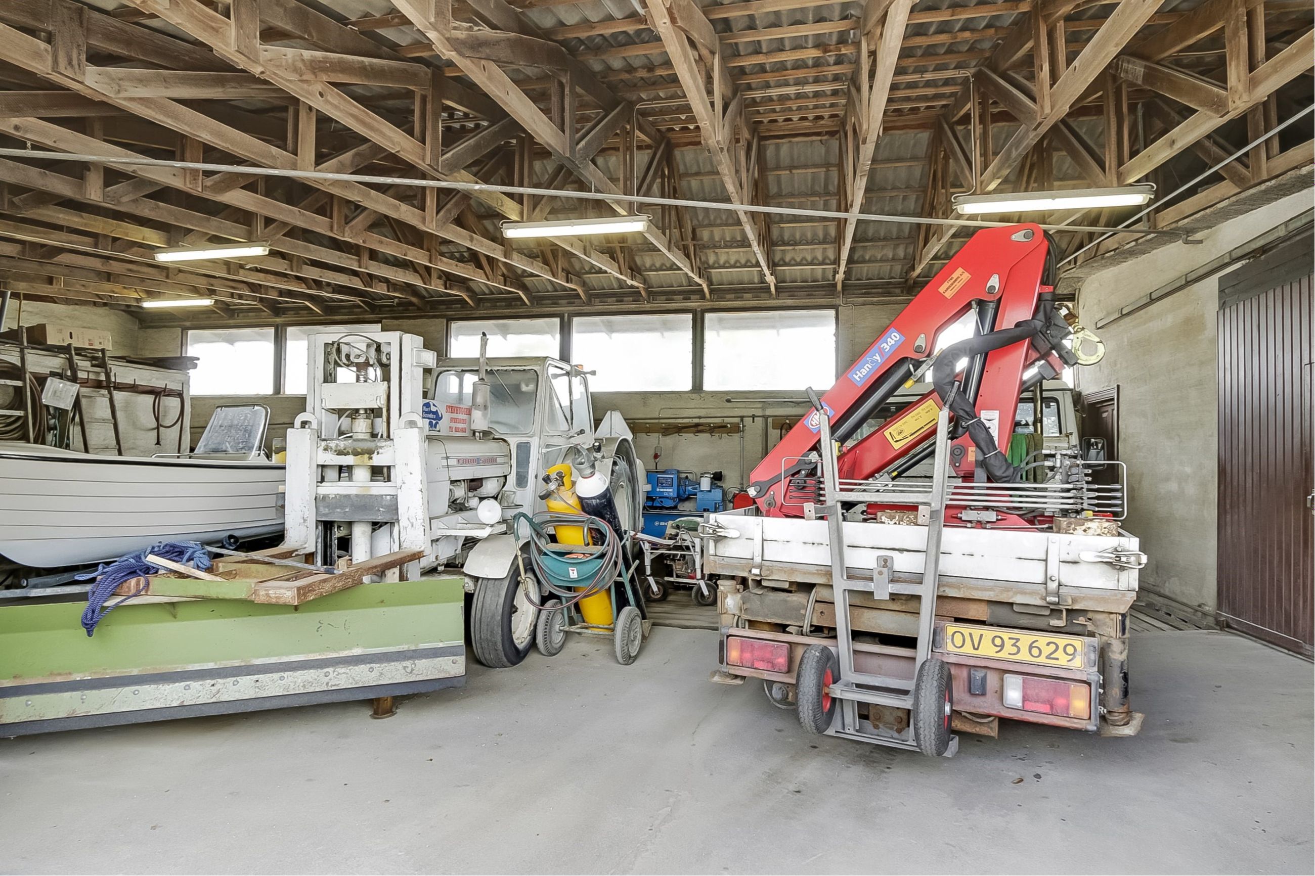 Værkstedet er blevet opført af 2 omgange og indrettet med 2-delt værkstedsafsnit med støbte gulve, skrå lofter med troltex loftsplader samt med lysindfald fra vinduespartier. Denne del er opvarmet ved kalorifere tilsluttet oliefyr, og har en loftshøjde på ca. 2,5-3,5 meter i siderne. Fra den opvarmede del er der via skydeport adgang til uopvarmet og uisoleret del, som anvendes til køretøjer og lager. I enden af ejendommen findes lille lavloftet værksted.
