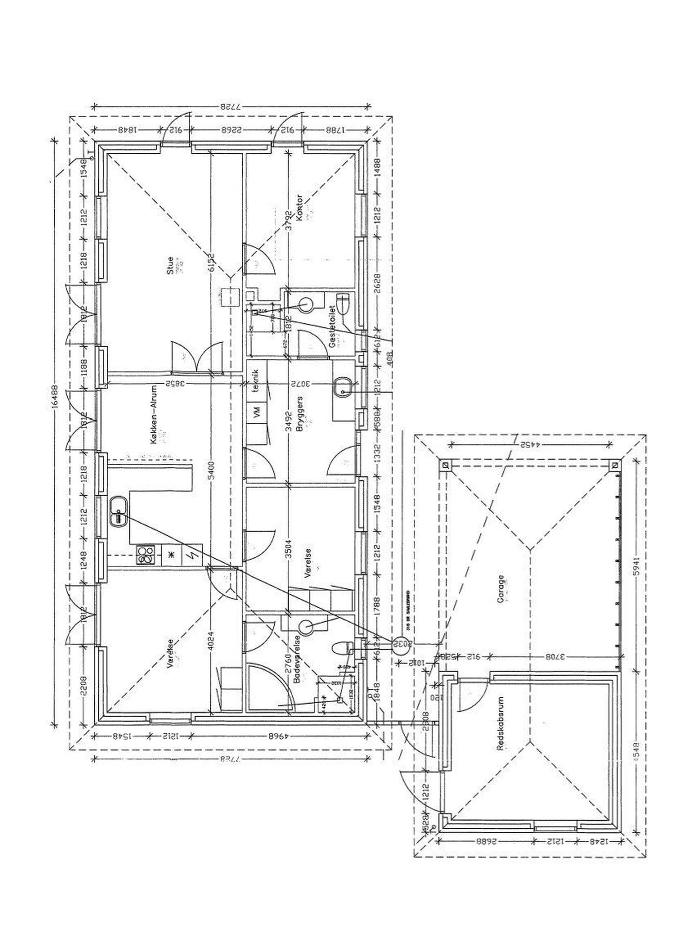 Garagebygningens tagkonstruktion er identisk med beboelsen. Garagen er opført i dels i røde sten og i træ. Garagen er forsynet med elektrisk hejseport. Selve garagen er uisoleret, men det bagvedliggende lager-/fyrrum er isoleret.
