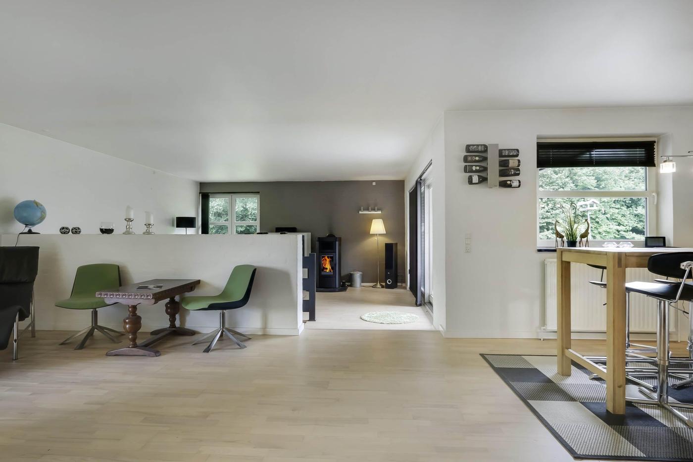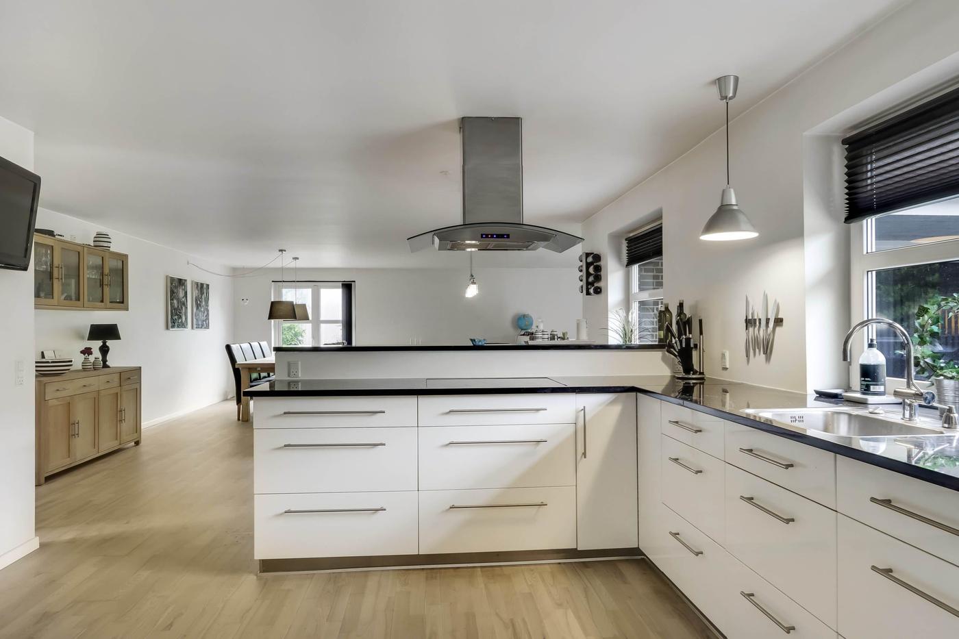 Bygningen er indrettet med entre med gæstetoilet, soveværelse med gennemgang til ældre badeværelse, 3 store værelser samt badeværelse med brus. Køkkenet er blevet åbnet op, således det er fint integreret med spisestue og fjernsynsstuen. I fjernsynsstuen findes ejendommens p.t. eneste varmekilde (pillebrændeovn), da oliefyret er fjernet. Fra stuen er der nedgang til kælder med "gildesal" samt depotrum. Ved gildesalen er grunden udgravet således der er udgang til terrasse fra kælderen.