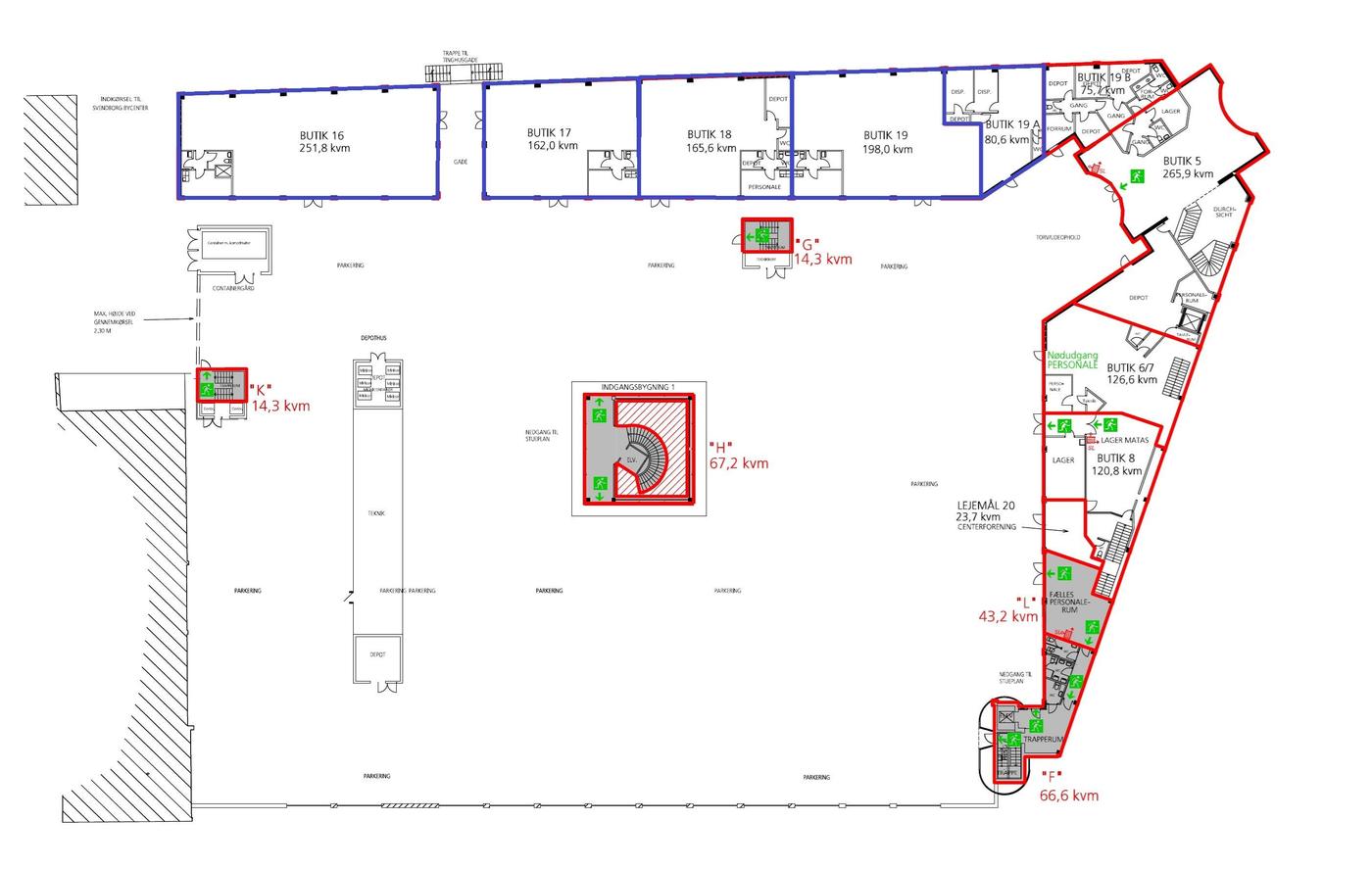På 1. sal med direkte adgang til centrets store parkeringsareal findes flere lejemål, som kan anvendes til forskellige formål.