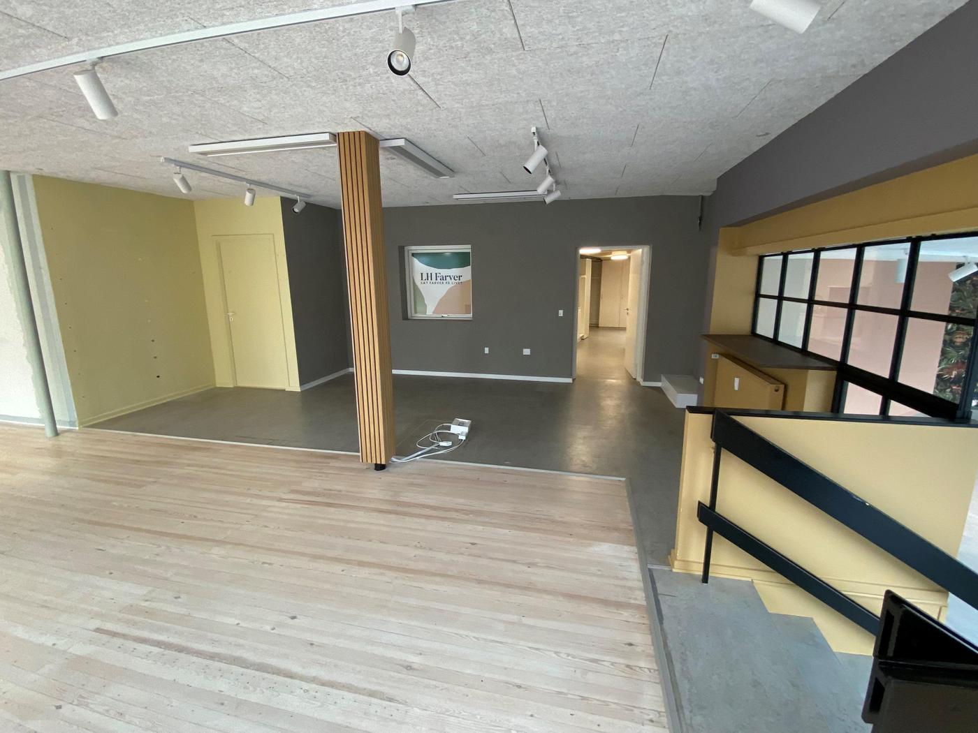 Gulvbelægning er henholdsvis ældre pæne afhøvlede trægulve i det øvre salgsareal samt linoleum i den nedre del. Loftbeklædningen er troldtekt samt ny grundbelysning.