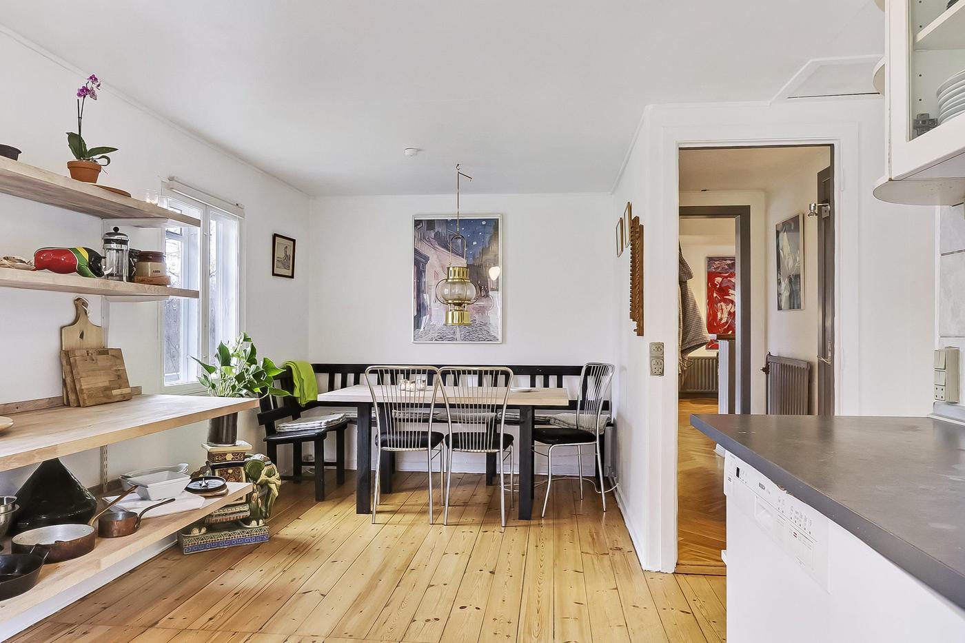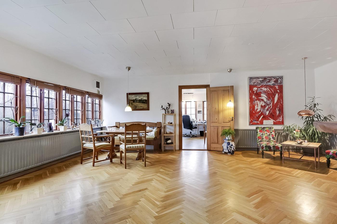 Derudover findes boligdel med hyggelig opholdsstue med sildebensparketgulv, soveværelse samt mindre værelse og køkken og toilet.