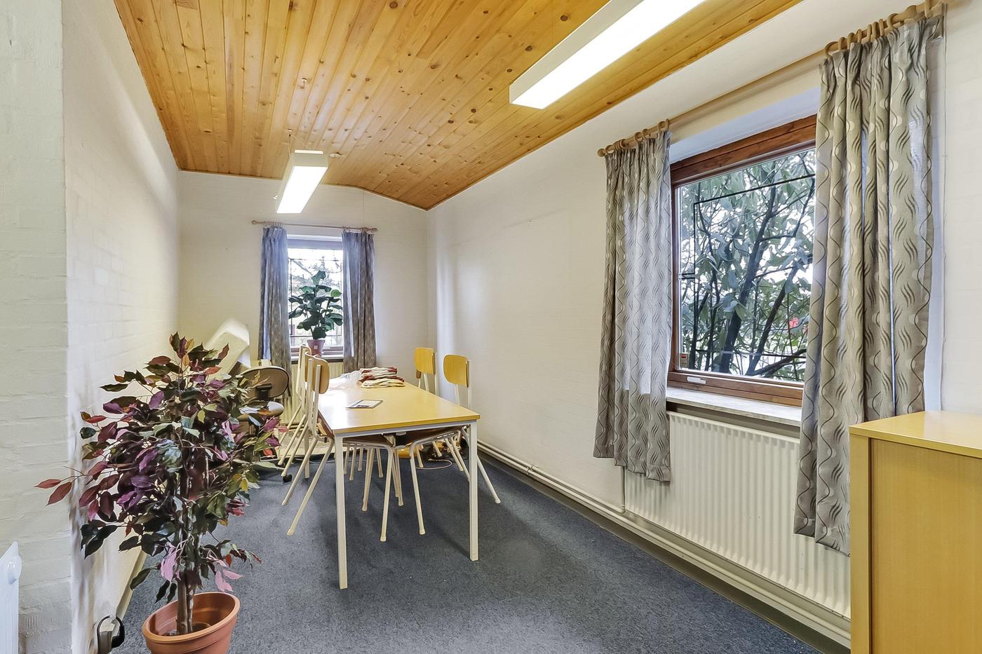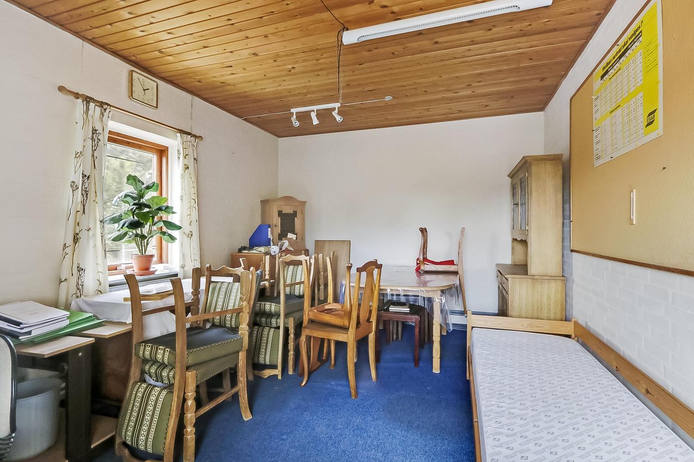 Bygningen er indrettet med fordelergang, 1 kontor, toilet og frokoststue. Herudover depotrum, opsat med let skillevæg til værksted.