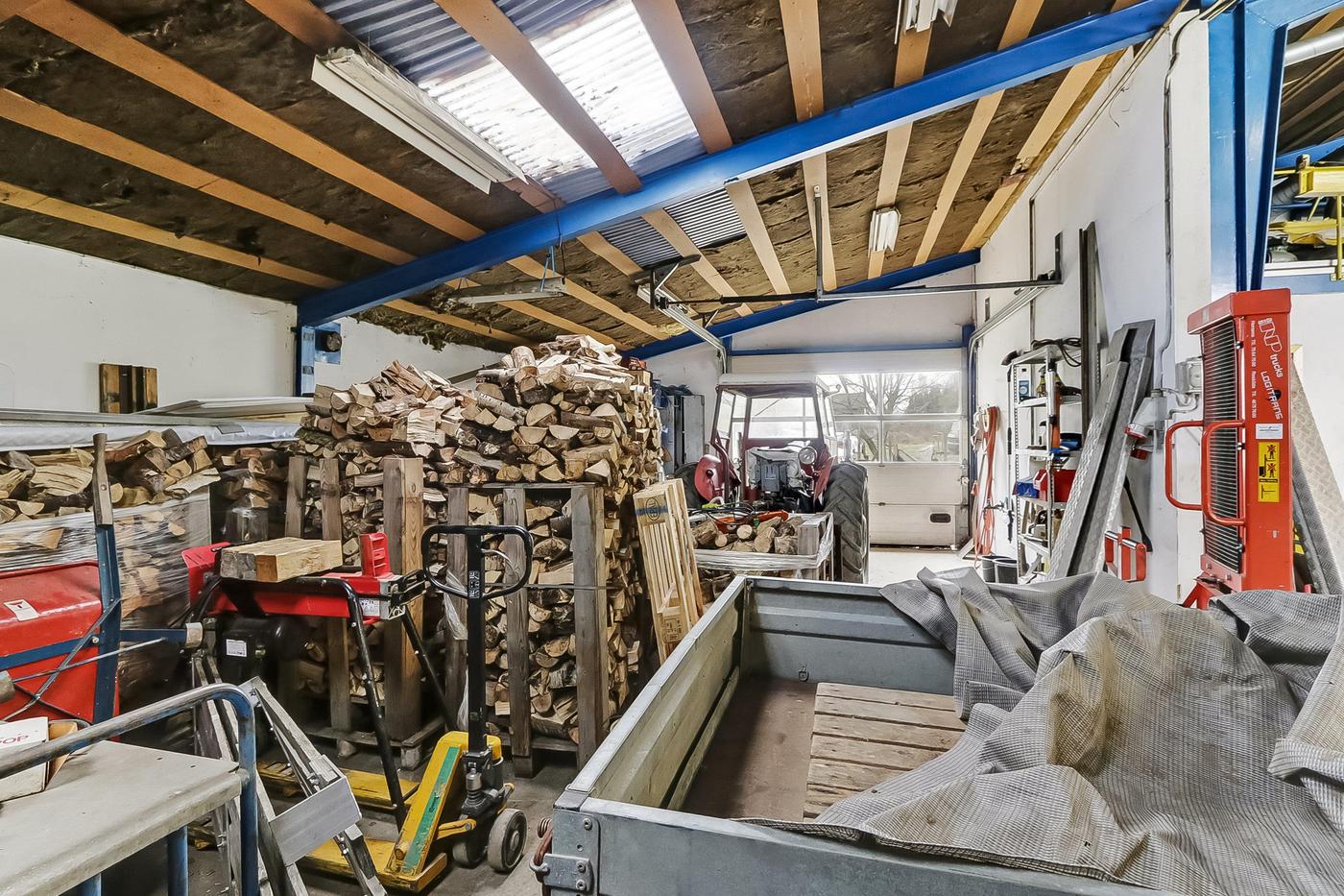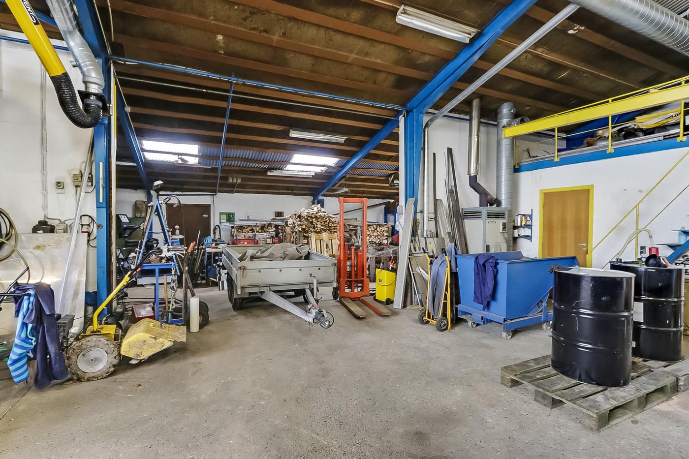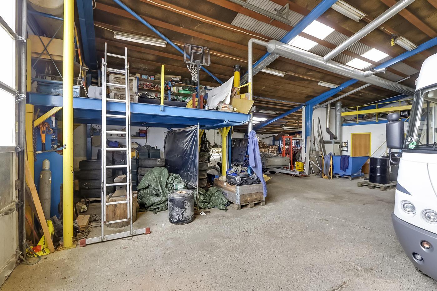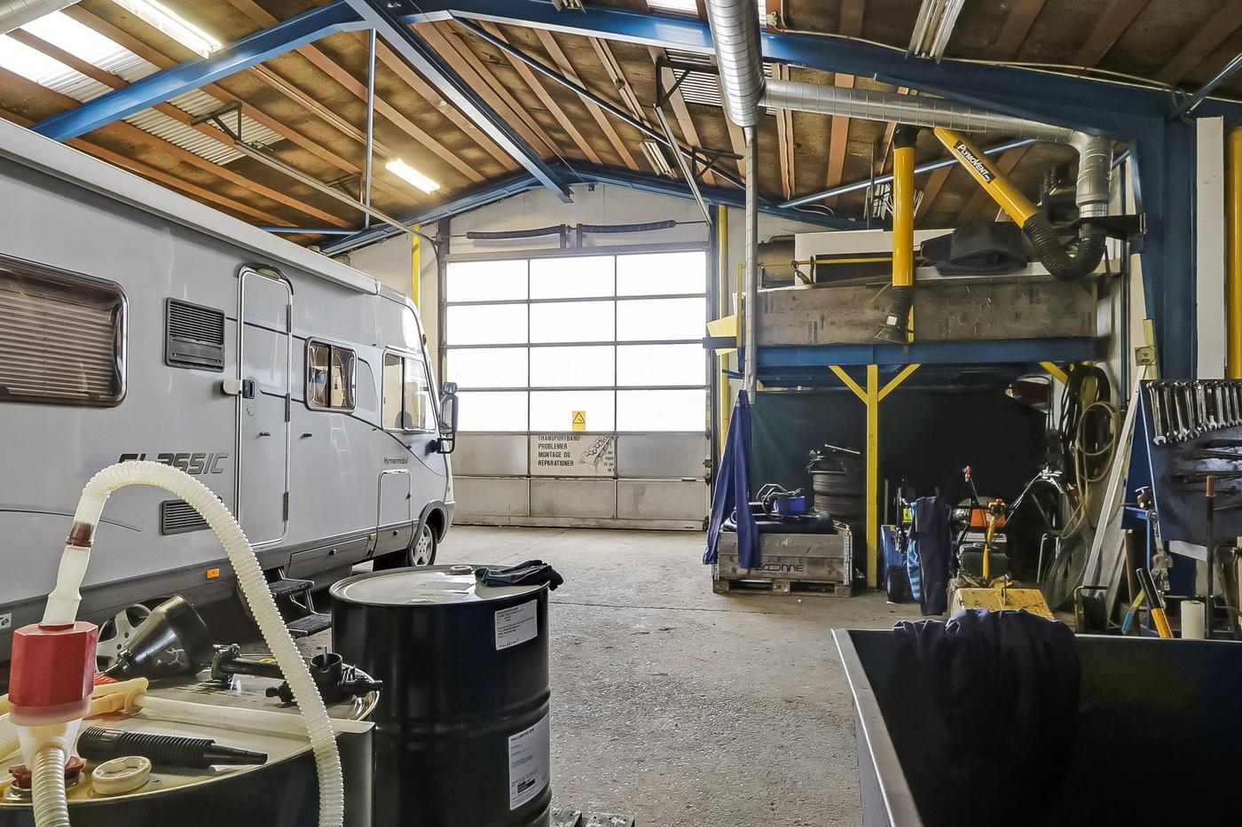 Hallen er med støbte gulve og har en god portdækning, idet der i gavlen mod vejen findes 1 aluhejseporte på ca. 4x4 meter og i gavl mod baggård findes 2 aluhejseporte på hhv. ca. 3x3 meter og ca. 3x2,5 meter.