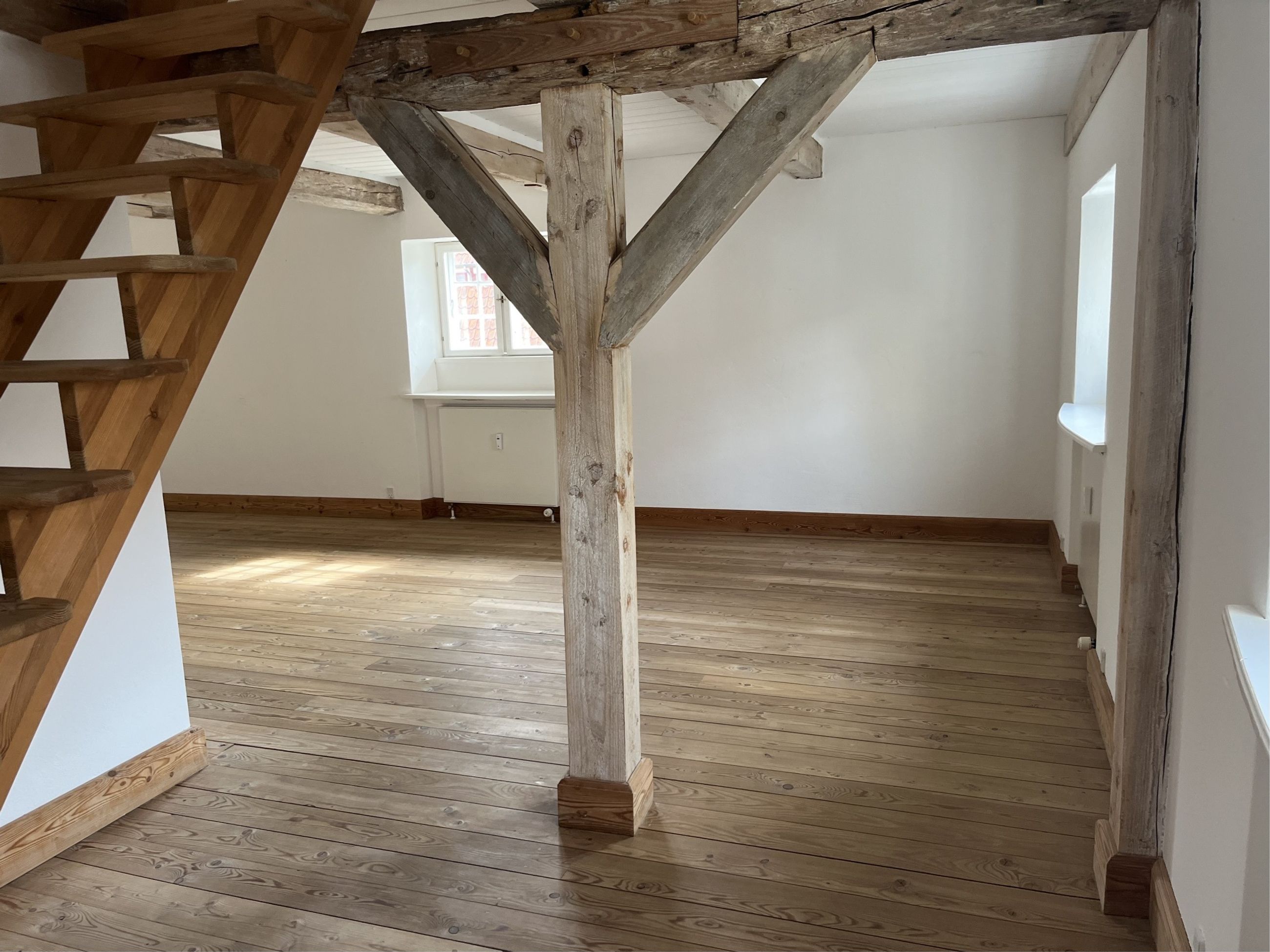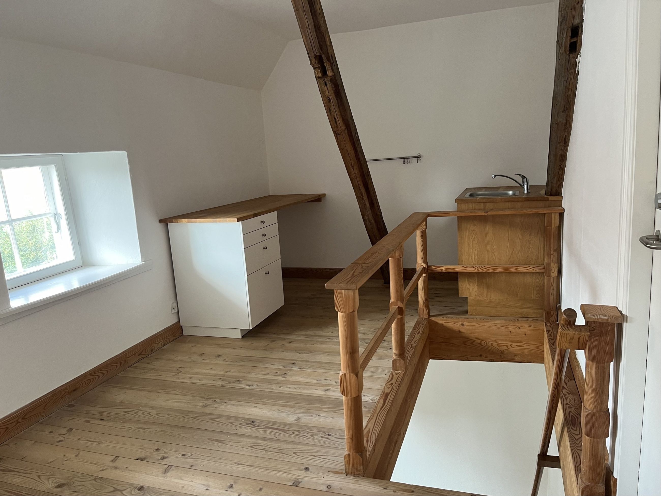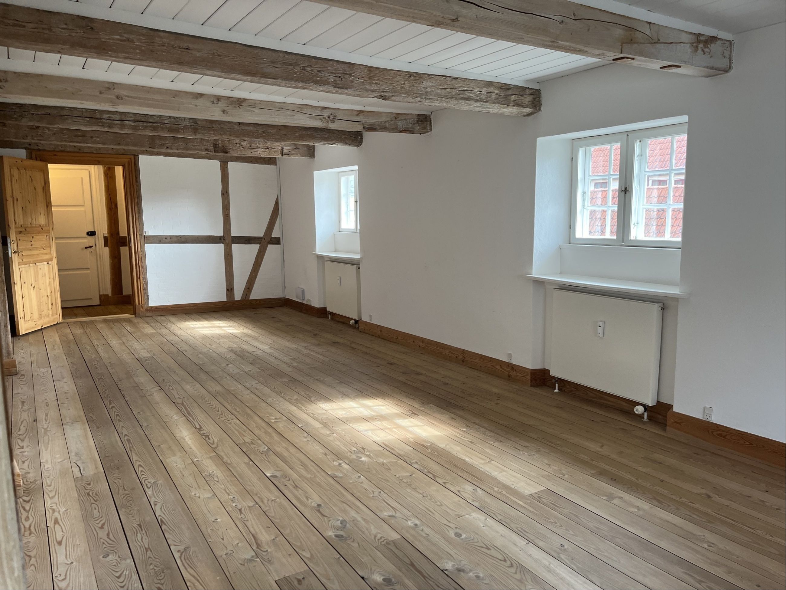 I charmerende ældre bindingsværksejendom, ligger dette fine kontorlejemål på 1. sal. Lejemålet er lyst og indbydende med flotte trægulve, synlige hanebånd og charmerende detaljer.