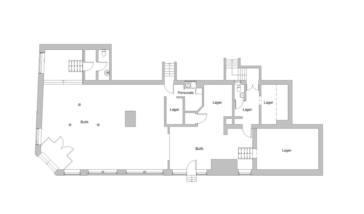 Der er fra butikslokalet adgang til lager, personalefaciliteter og tekøkken.