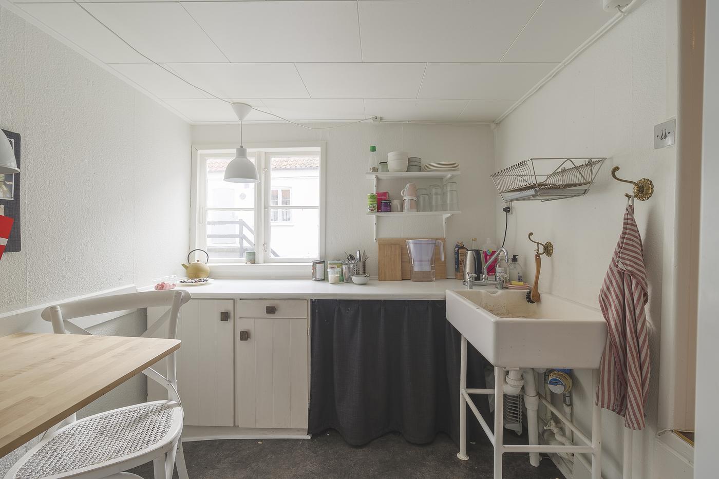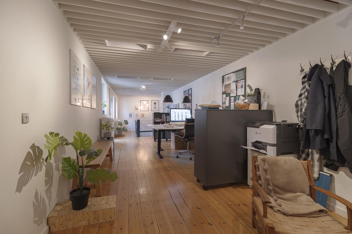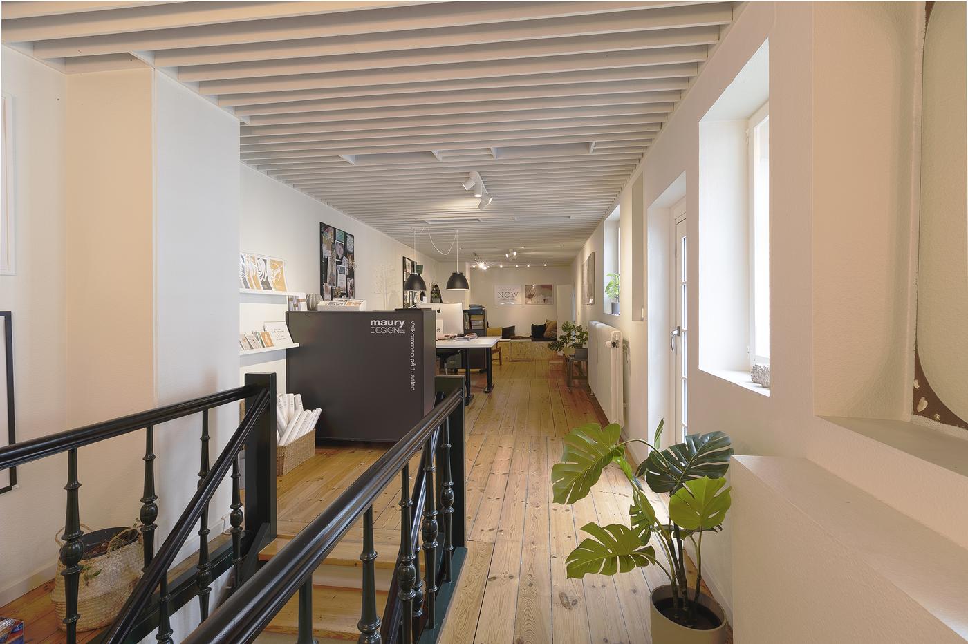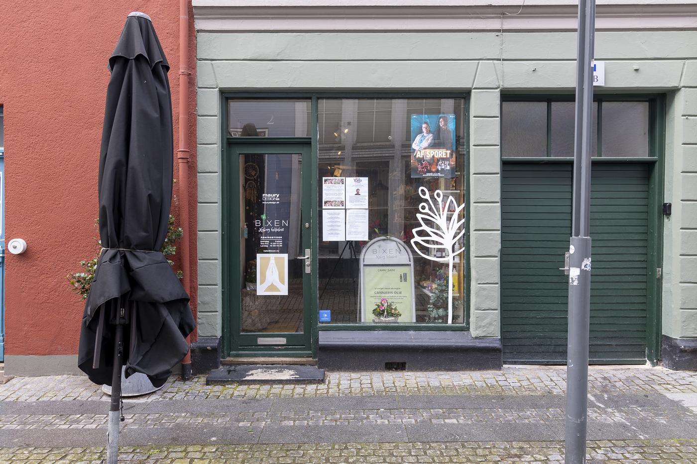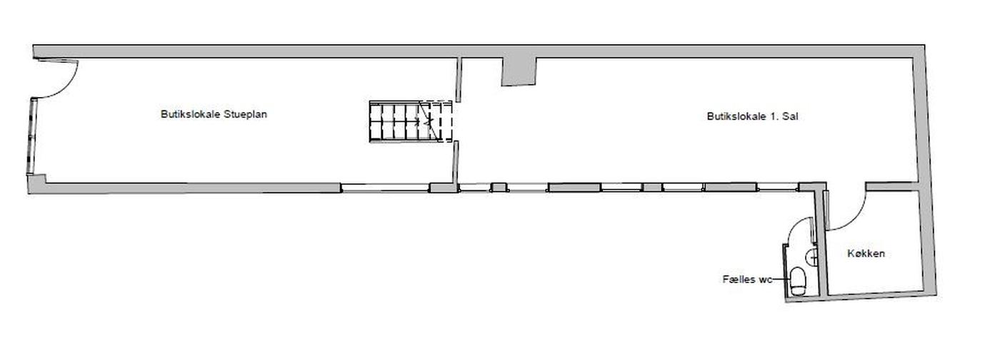 Lejemålet er beliggende i stueetagen i den flotte og velholdte hjørneejendom, og er indrettet som butikslokale. Herfra er der trappe op til butikslokale eller kontor som er beliggende på 1. sal. Endvidere er der lille thekøkken og fælles toilet. Fra køkken er der adgang til loftet, som kan bruges til opbevaring.