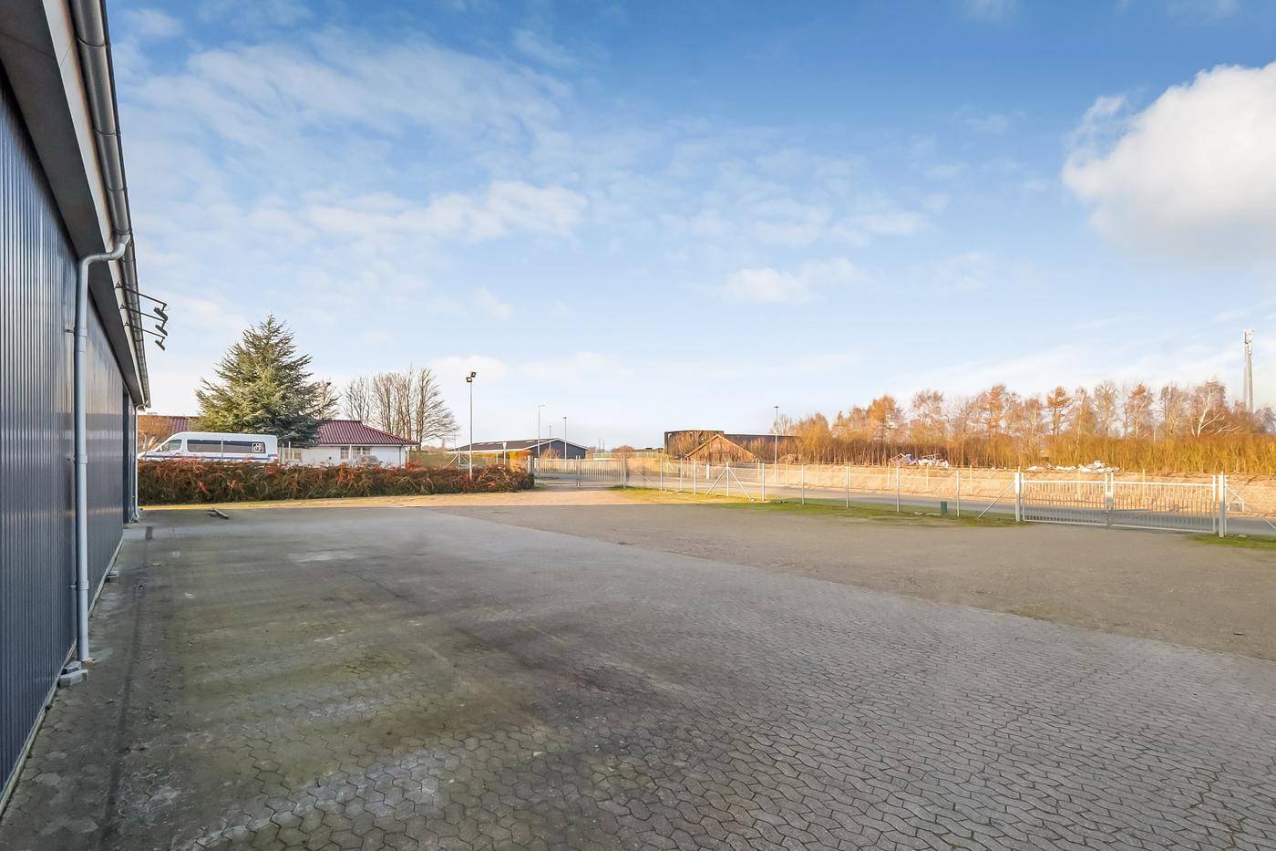 Bygningerne ligger på en stor, regulær og indhegnet grund - befæstet delvis med SF-sten og kørefast belægning. Der er gode parkerings- og oplagringsmuligheder på ejendommen. Der er etableret mast med belysning af pladsen.