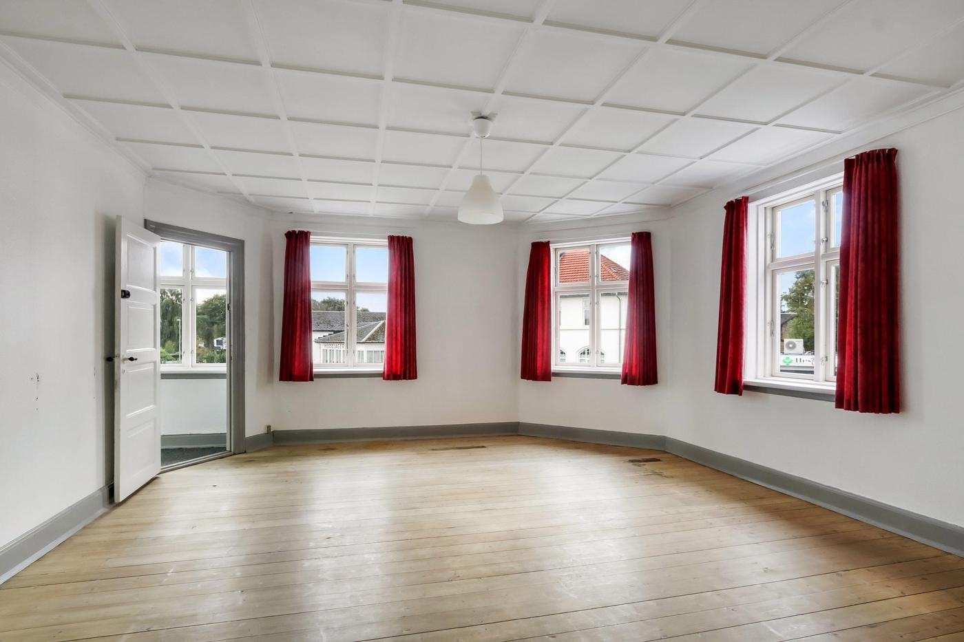 Via separat indgang er der trappe til 1. sal, hvor der findes stor lejlighed på 187 m². Lejligheden er indrettet med repos med udgang til tagterrasse, stort køkken med spisekammer, soveværelse med påklæderrum og adgang til badeværelse, værelse, fjernsynsstue, stue med brændeovn og udgang til balkon samt spisestue.