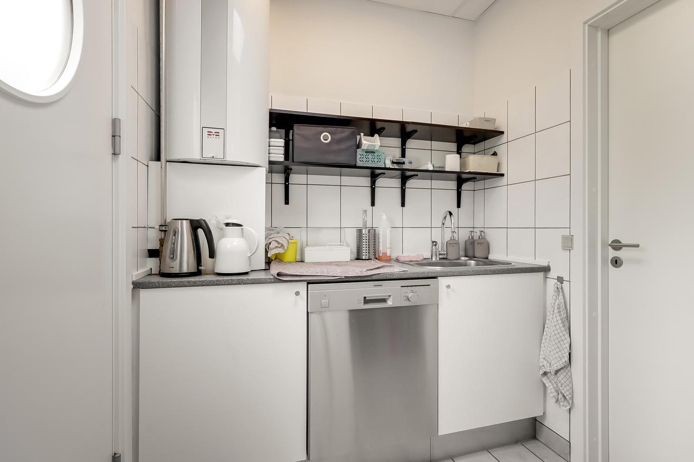 Ejendommen rummer pænt indgangsparti med lille foyer, inden man kommer ind i selve butiksområdet. Der er fint kontor eller mødelokale samt mindre lager. På toilettet er der etableret vaskemaskine og tørretumbler, og i køkkenet er der køleskab og opvaskemaskine. Fra køkkenet er der personaleadgang, som fører direkte ud til det store parkeringsareal tilhørende ejendommen. Udearealet foran indgangspartiet, som vender mod torvet, rummer plads til udstilling af gadevarer.