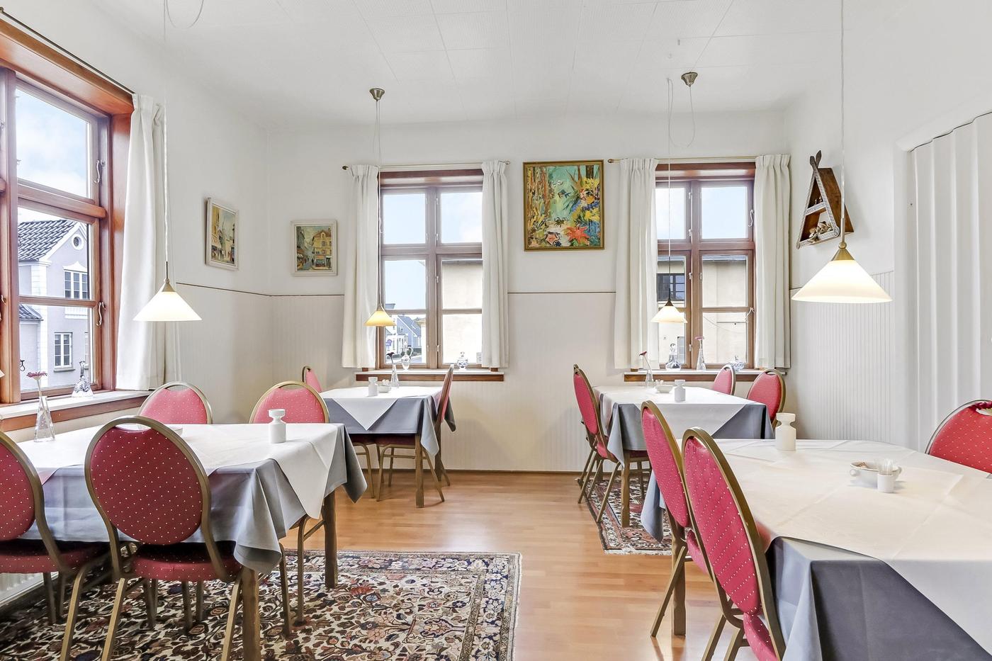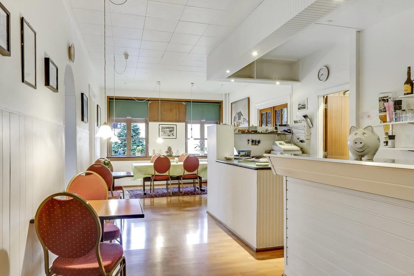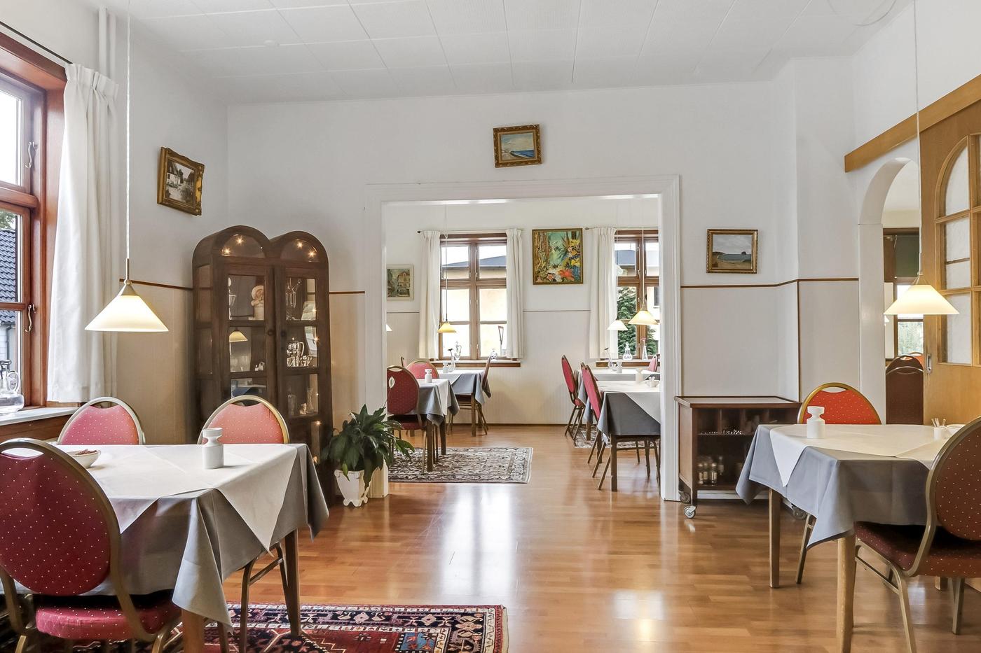Ejendommen er i hovedtræk indrettet med reception, pænt restaurationslokale med plads til ca. 30 spisende gæster, funktionelt køkken samt grovkøkken med køl og frys.