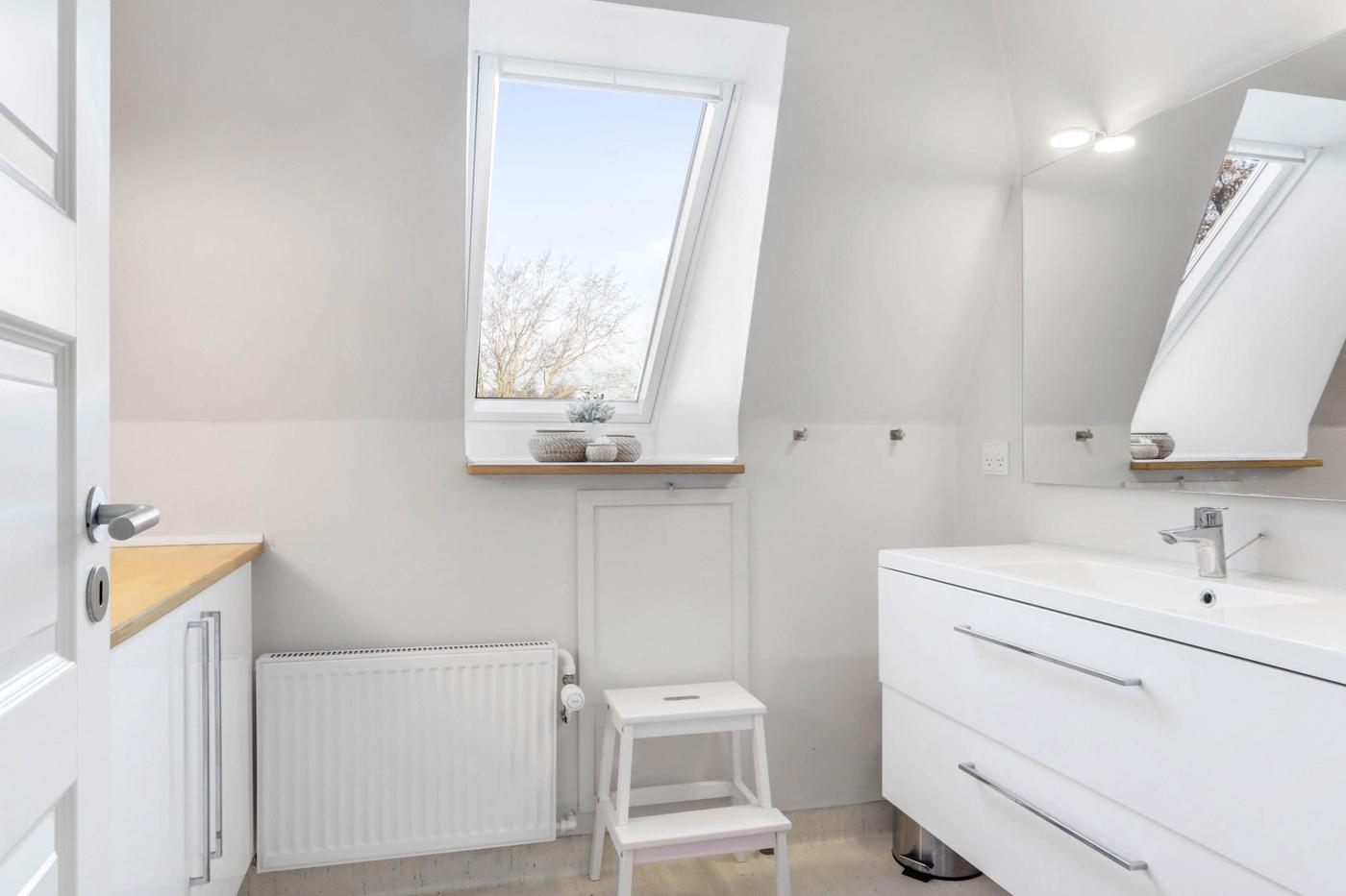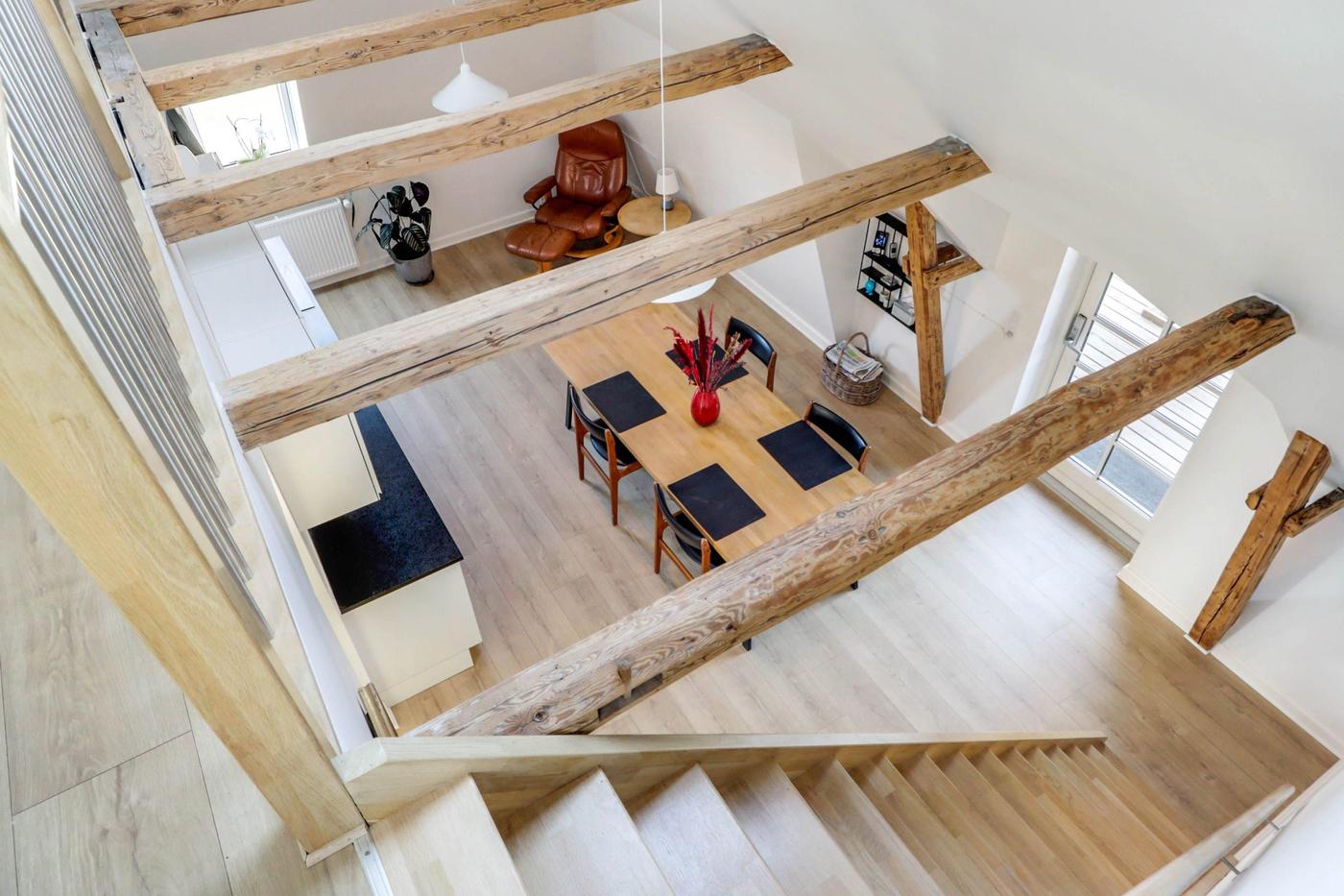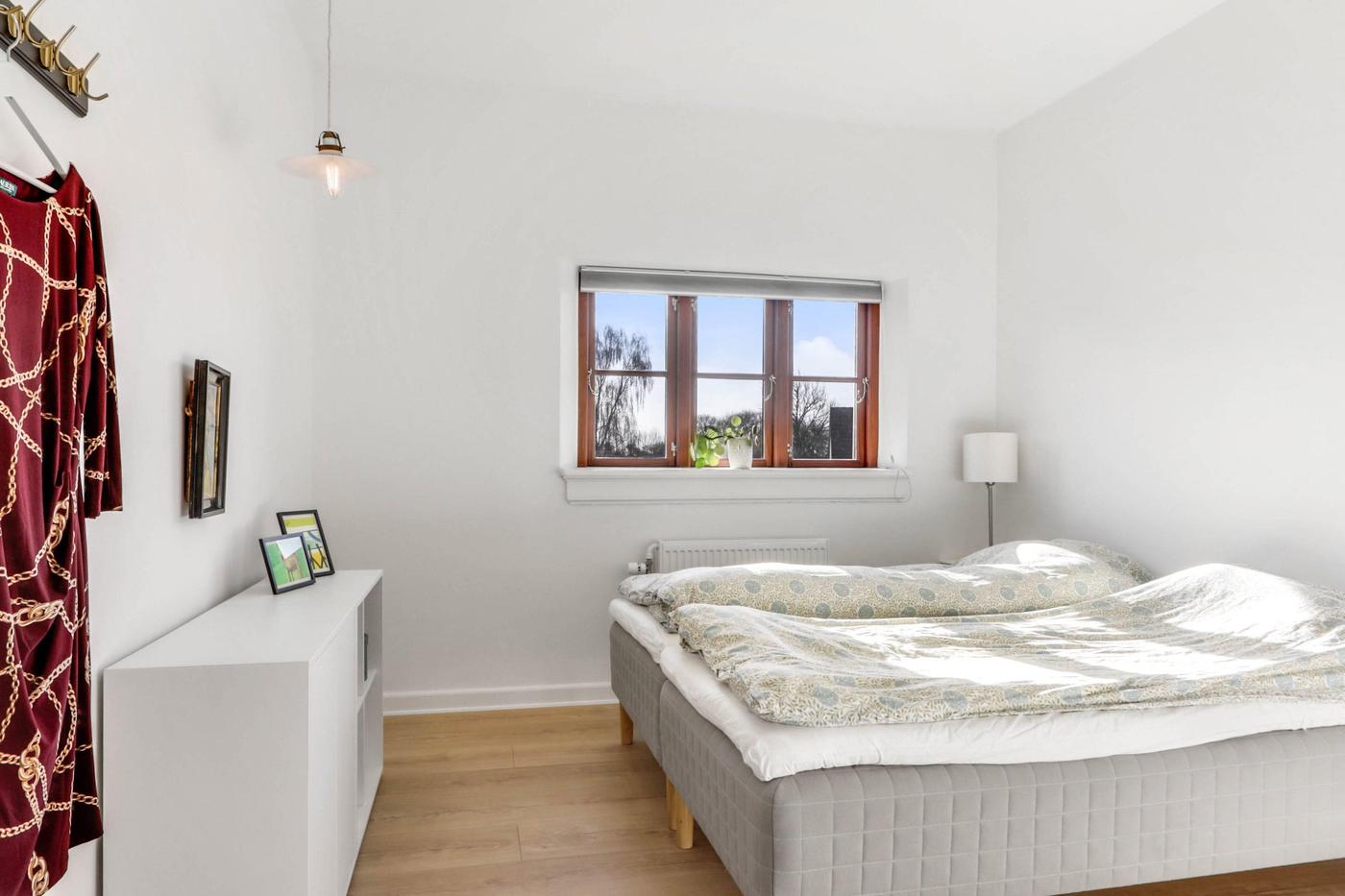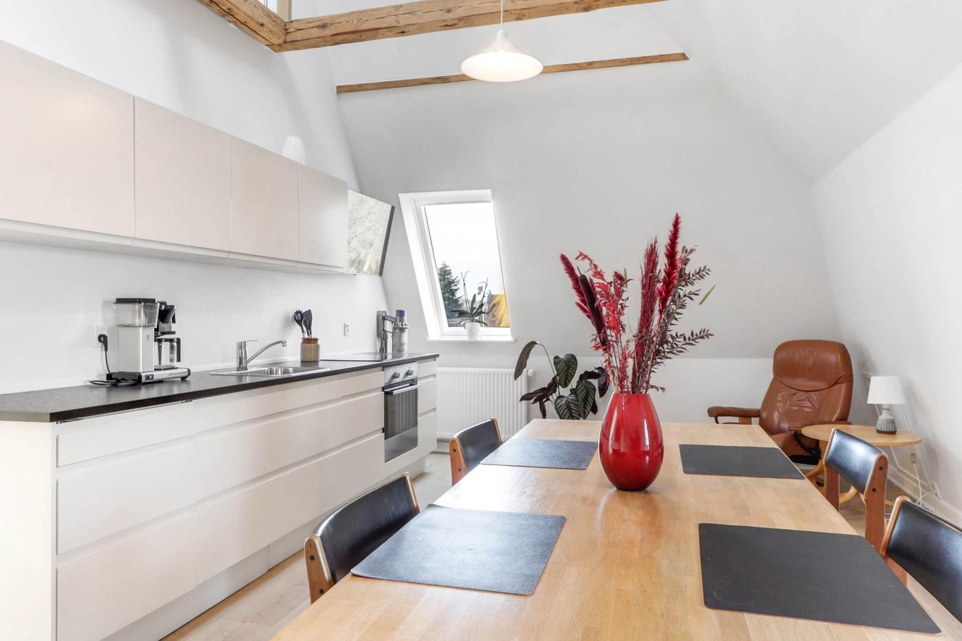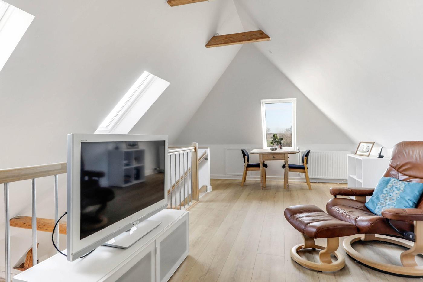 På 1. sal er der indrettet flot lejlighed. 1. salen er indrettet med repos, separat kontor, fordelergang med separat badeværelse med brus, separat toilet, flot køkken/alrum med fritlagte hanebånd og trappe til hems, hvor der er indrettet stue. Herudover stort soveværelse samt walk-in closet. Fra køkken/alrummet er der udgang til stor vestvendt tagterrasse med trappe ned til den bagvedliggende have. Lejligheden er moderniseret for 2-3 år siden.