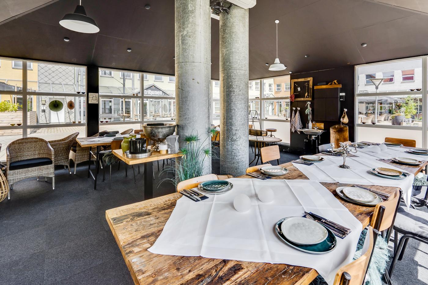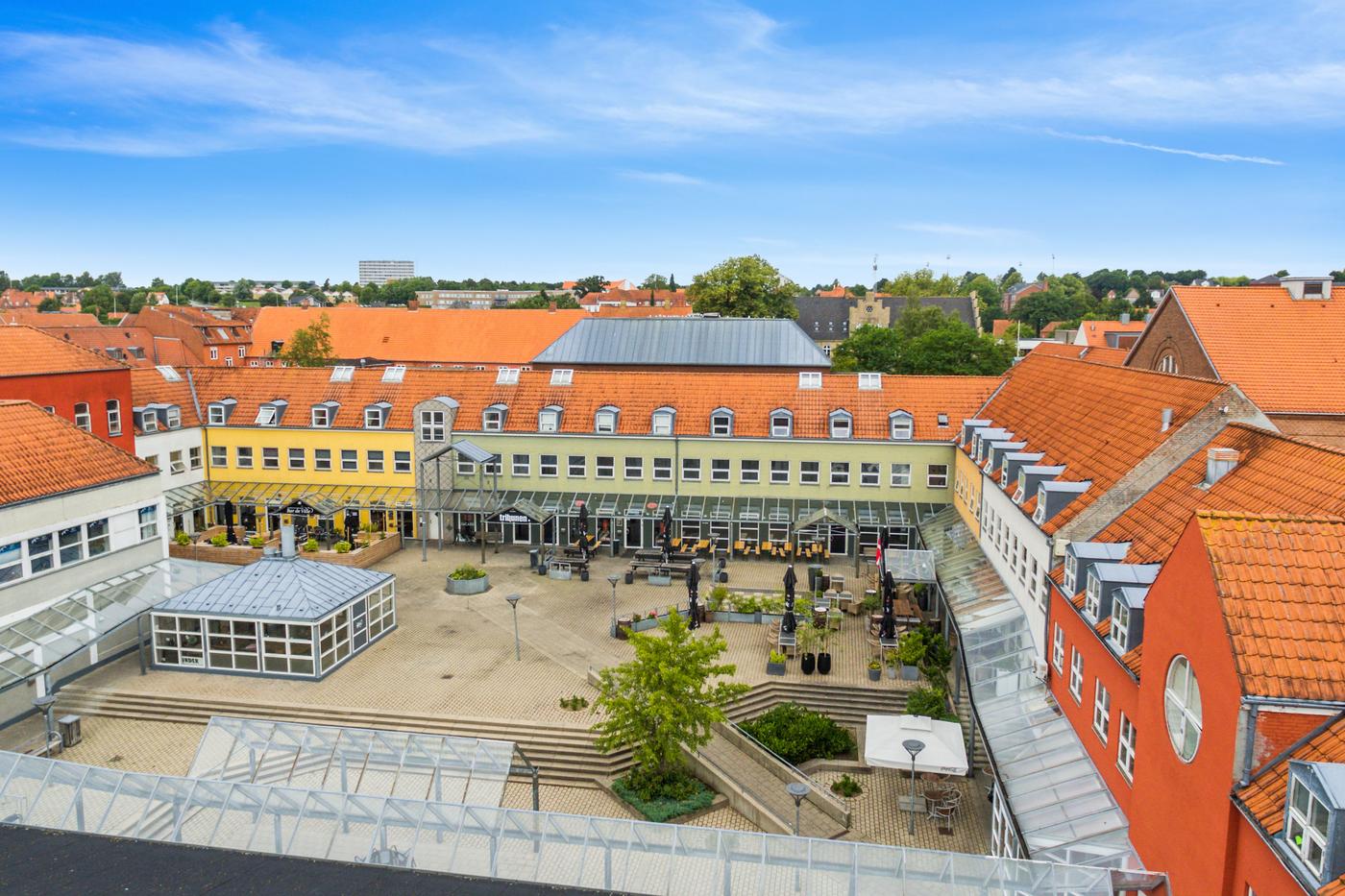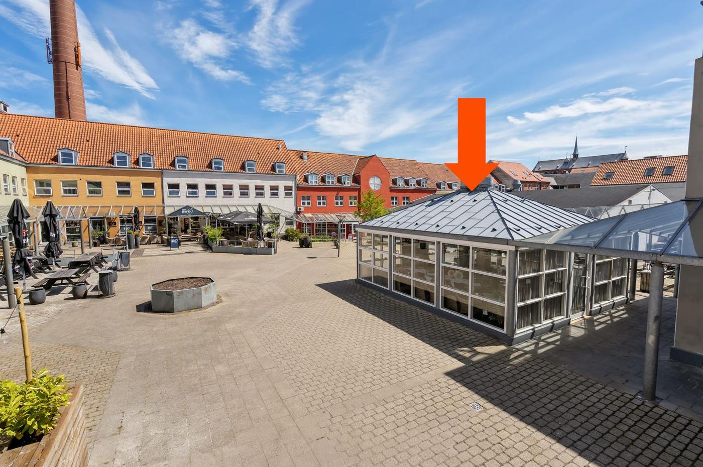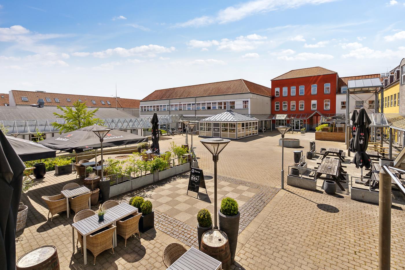 Der er et spændende og hyggeligt gårdmiljø hvor cafeerne har udeservering hvilket bidrager til en utrolig hyggelig stemning på den åbne plads.