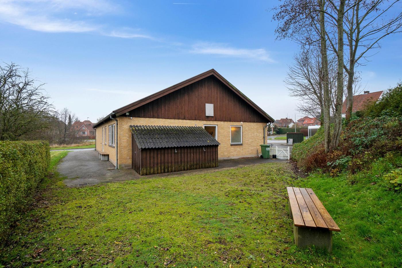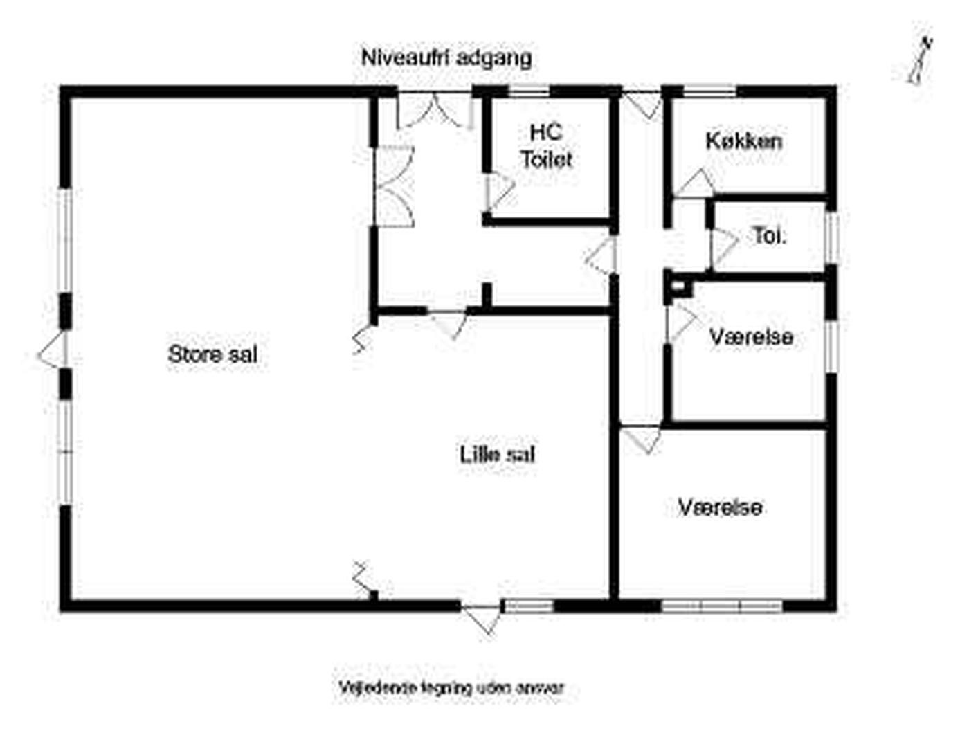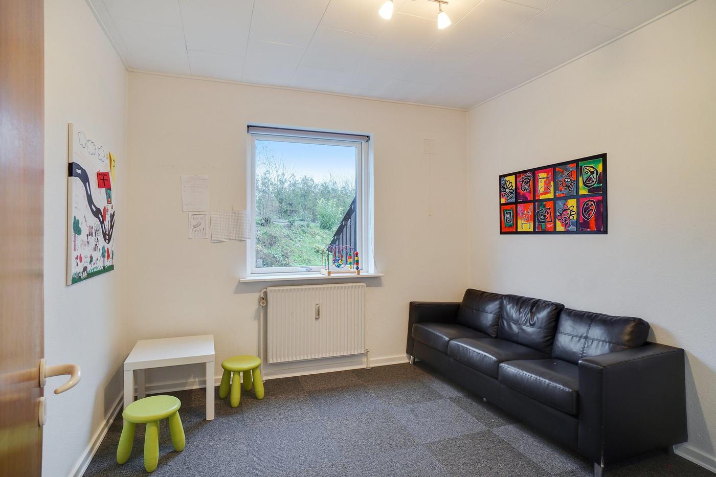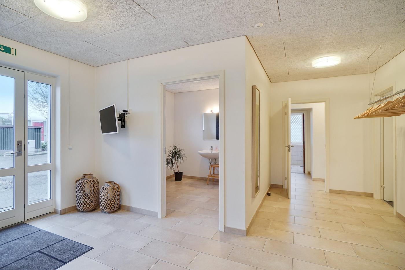 Indretningen er med indgang fra asfalteret parkeringsareal til lys entre med handicaptoilet og garderobe, herfra adgang til stor lys sal, som er ideel til foredrag, showroom eller et åbent kontormiljø, fra entreen er der endvidere adgang til den tidligere beboelsesdel, som er med egen indgang, fordelergang, køkken, toilet og to værelser/kontor. Derudover findes der kælder på 40 m², hvor der er adgang til via udvendige trappe