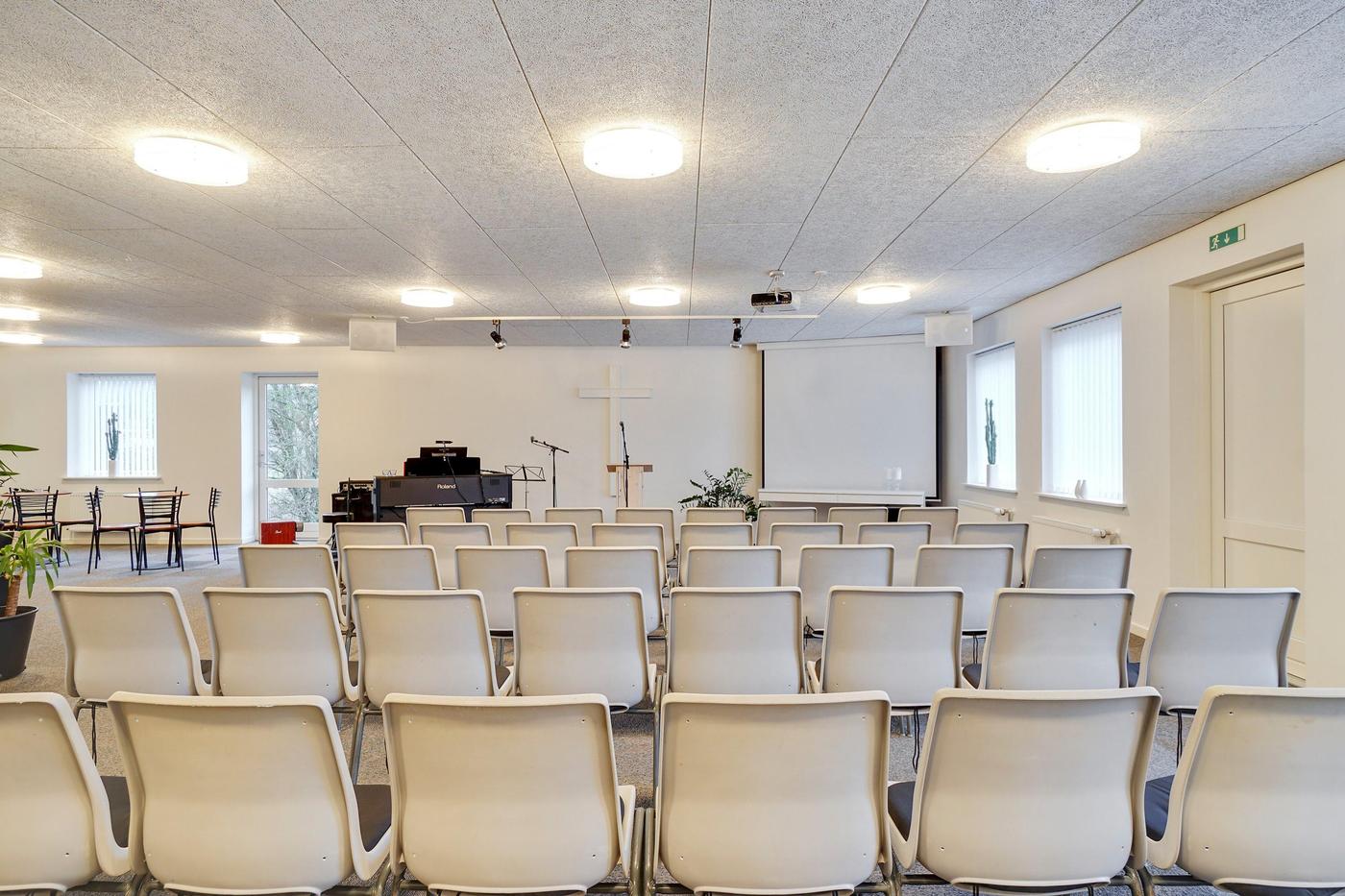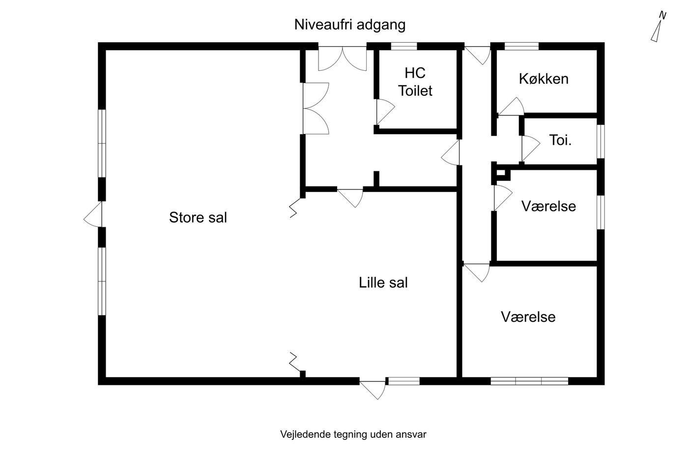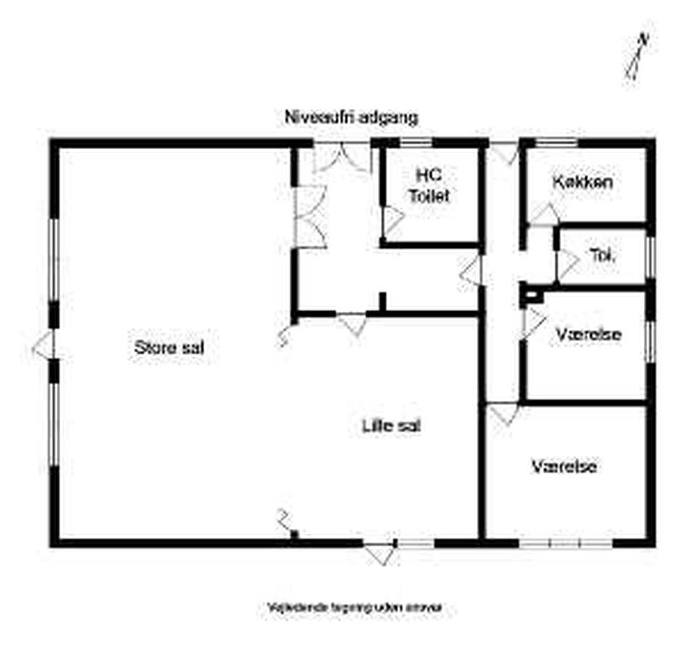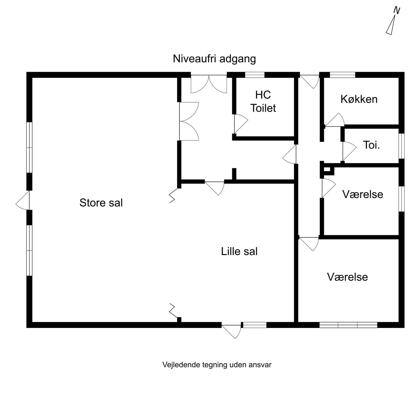 Indretningen er med indgang fra asfalteret parkeringsareal til lys entre med handicaptoilet og garderobe, herfra adgang til stor lys sal, som er ideel til foredrag, showroom eller et åbent kontormiljø, fra entreen er der endvidere adgang til den tidligere beboelsesdel, som er med egen indgang, fordelergang, køkken, toilet og to værelser/kontor. Derudover findes der kælder på 40 m², hvor der er adgang til via udvendige trappe