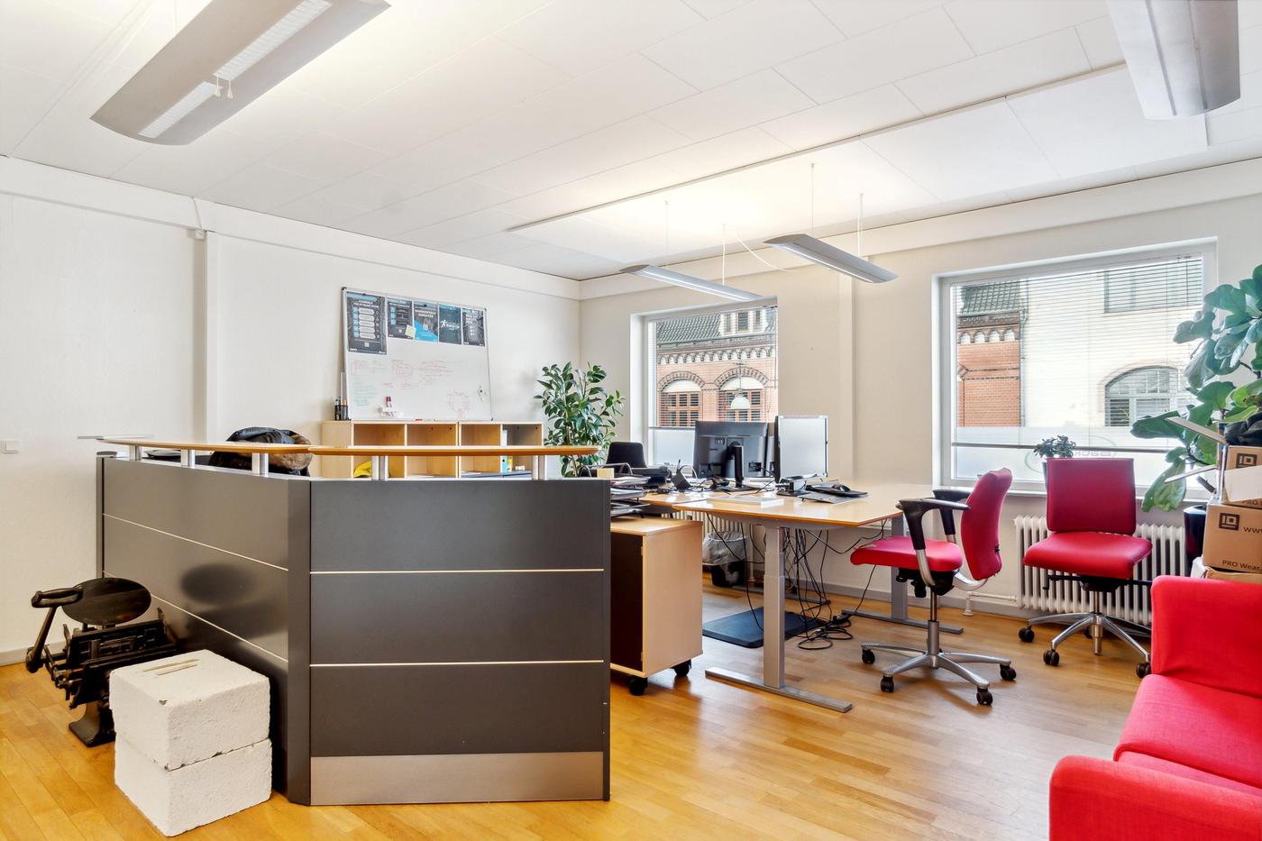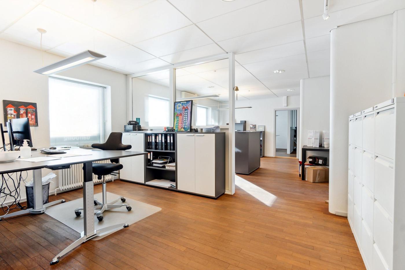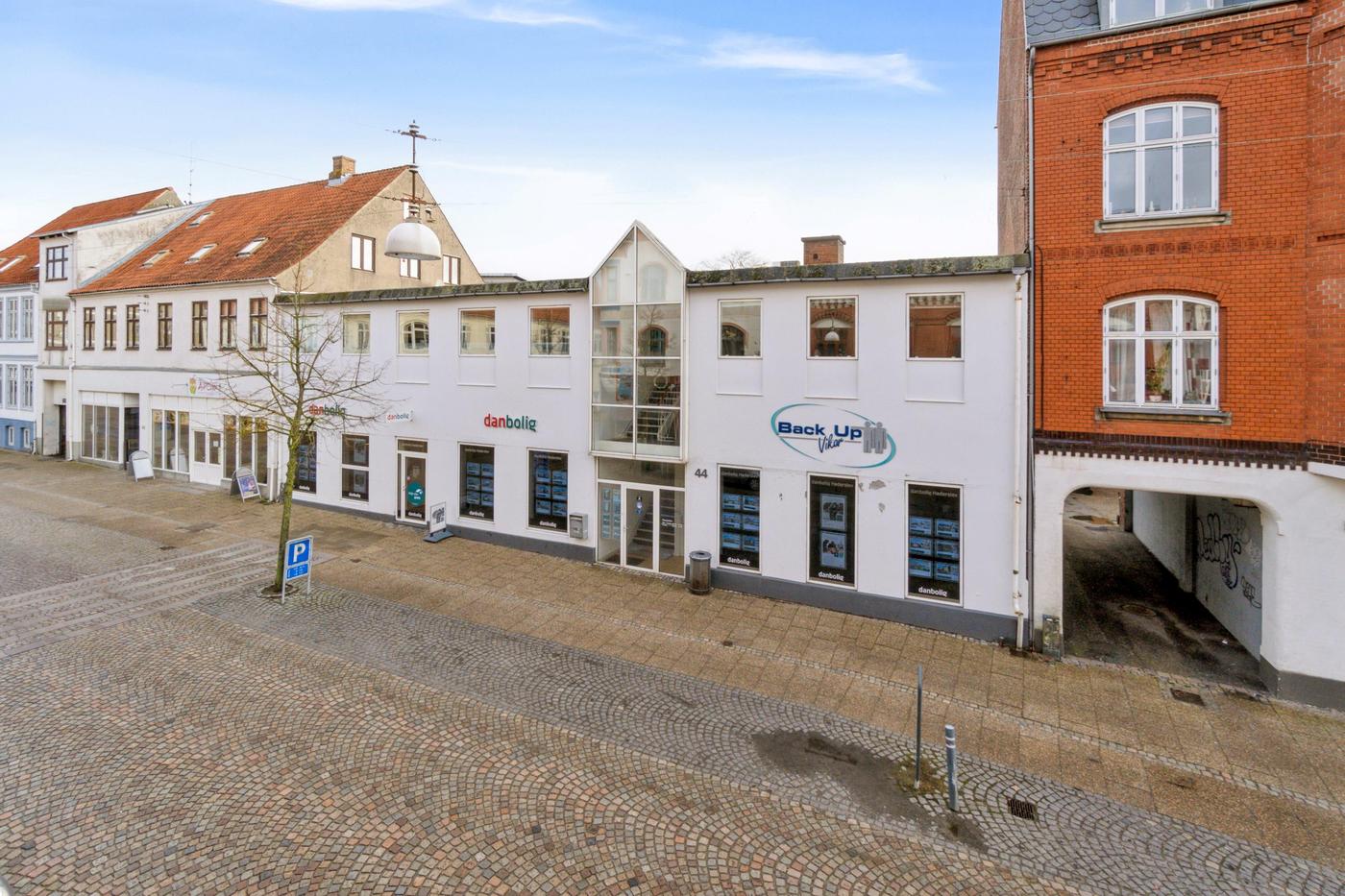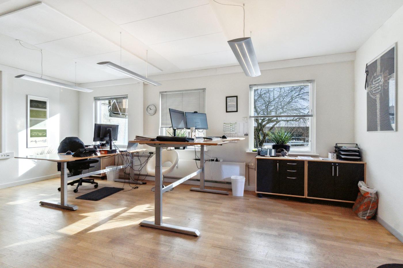 Ejendommen er opdelt i 2 erhvervsenheder, begge enheder er på 269 m² og er i stueplan udlejet til ejendomsmæglerforretning, som har været lejer i ejendommen siden 2015, 1. sal er fri til købers disponering pr. 01.01.2024. Begge lejemål fremstår i pæn stand og med et godt naturligt lysindfald fra både øst og vest. Der er fin kælder på 90 m², hvor der er arkivrum.