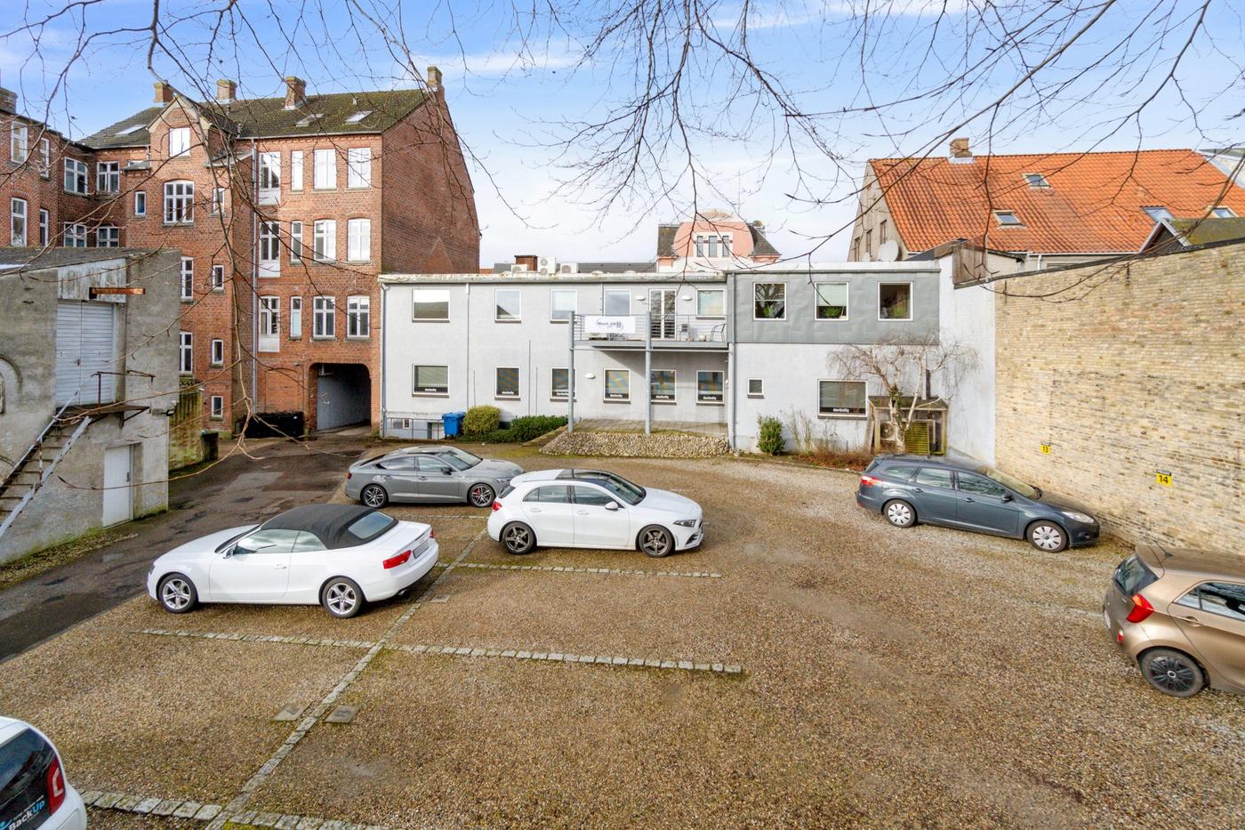 Det unikke store grundstykke midt i byen er på i alt 2.040 m² og foruden bygningen mod Nørregade, findes der på grunden stort parkeringsareal, 2 garage bygninger, den ene med 12 pladser og den anden med 6 pladser. Derudover er der værksted/lager på 215 m² i grundplan, som i dag benyttes af ejeren, og som er fri til købers disposition ved overtagelse.