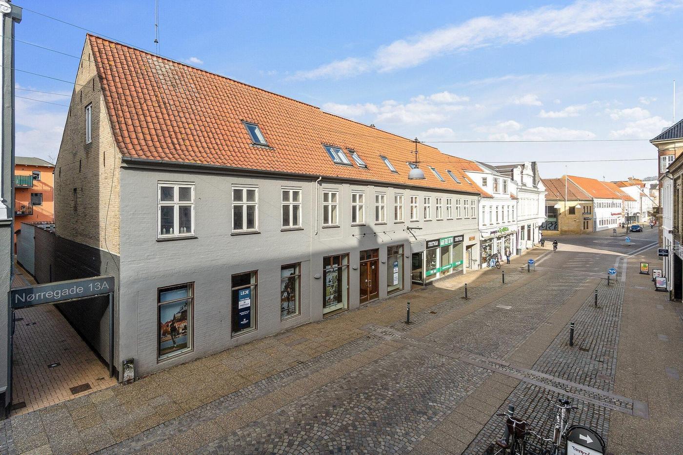 Nørregade er en aktiv handelsgade med butikker, banker, restauration mv. Gaden ender ved torvet og domkirken og løber parallelt med gågaden.
