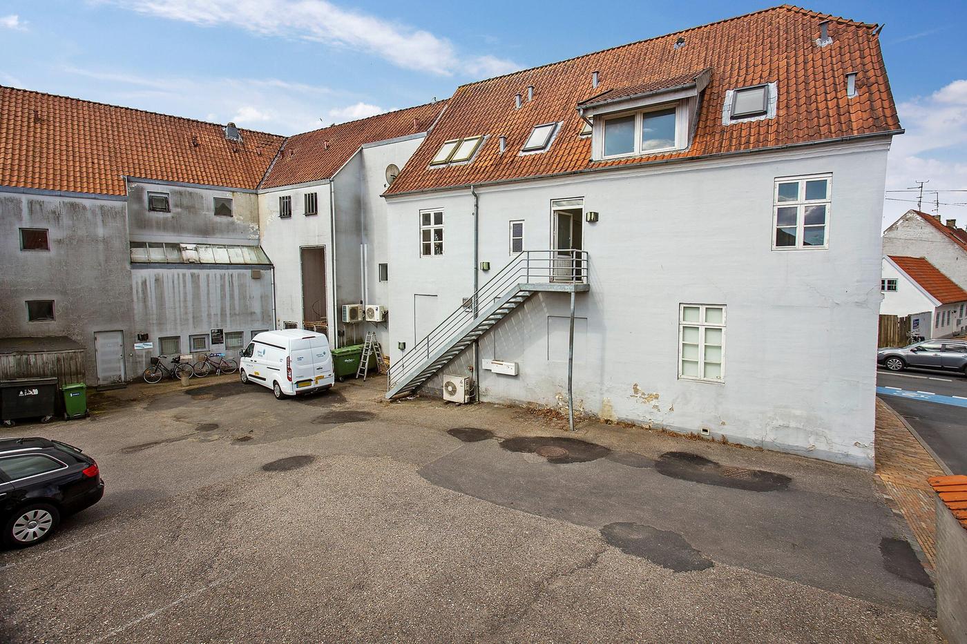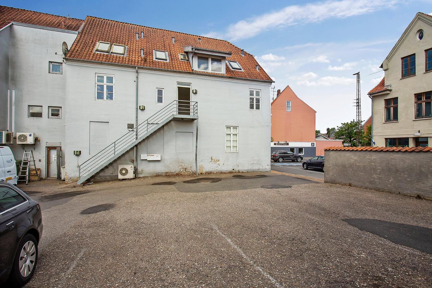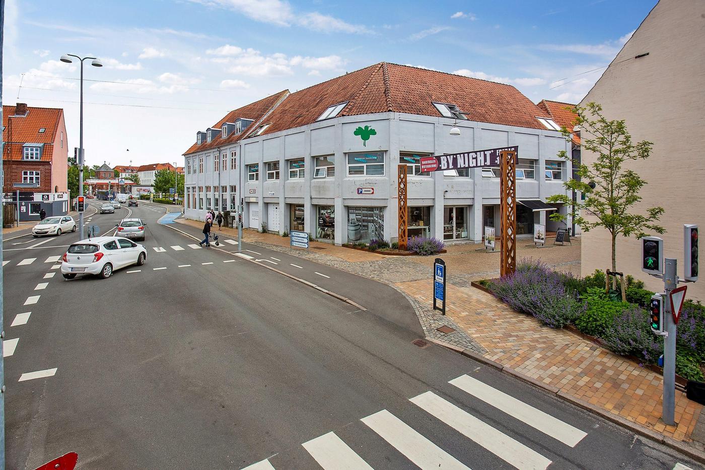 Markant ejendom beliggende ud til et af Haderslevs mest befærdede lyskryds og for enden af Haderslevs hyggelige gågade. Ejendommen har en god bred butiksfacade både mod gågaden og til den meget befærdede indfaldsvej til centrum. Ejendommen indeholder to erhvervslejemål og syv boliglejemål. Ét af boliglejemålene er på 131 m2, de resterende er mellem 48 m2 og 54 m2. Det ene erhvervslejemål er beliggende i stueplan, hvortil der kommer meget anvendelig kælder. Butikken har gode udstillingsvinduer til både gågade og til Bredgade. Lejemålet henvender sig f.eks. til specialbutik, liberal erhverv, restaurant og cafe. 1. sal er udlejet til Haderslev tandklinik, som har været i lejemålet siden 1980. Haderslev er en god og attraktiv handelsby med et stort udbud af specialbutikker og butikskæder. På denne del af gågaden ses der flere åbninger af restauranter og liberalt erhverv i de nærtliggende ejendomme. Der er mulighed for parkering i baggården til både lejere og kunder, og ejendommen ligger desuden tæt på offentlig parkering ved Meny og Haderslev Dam. Ejendommen er bygget i solide materialer og let at vedligeholde.