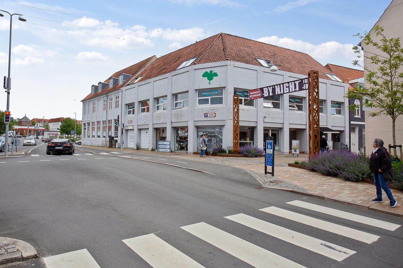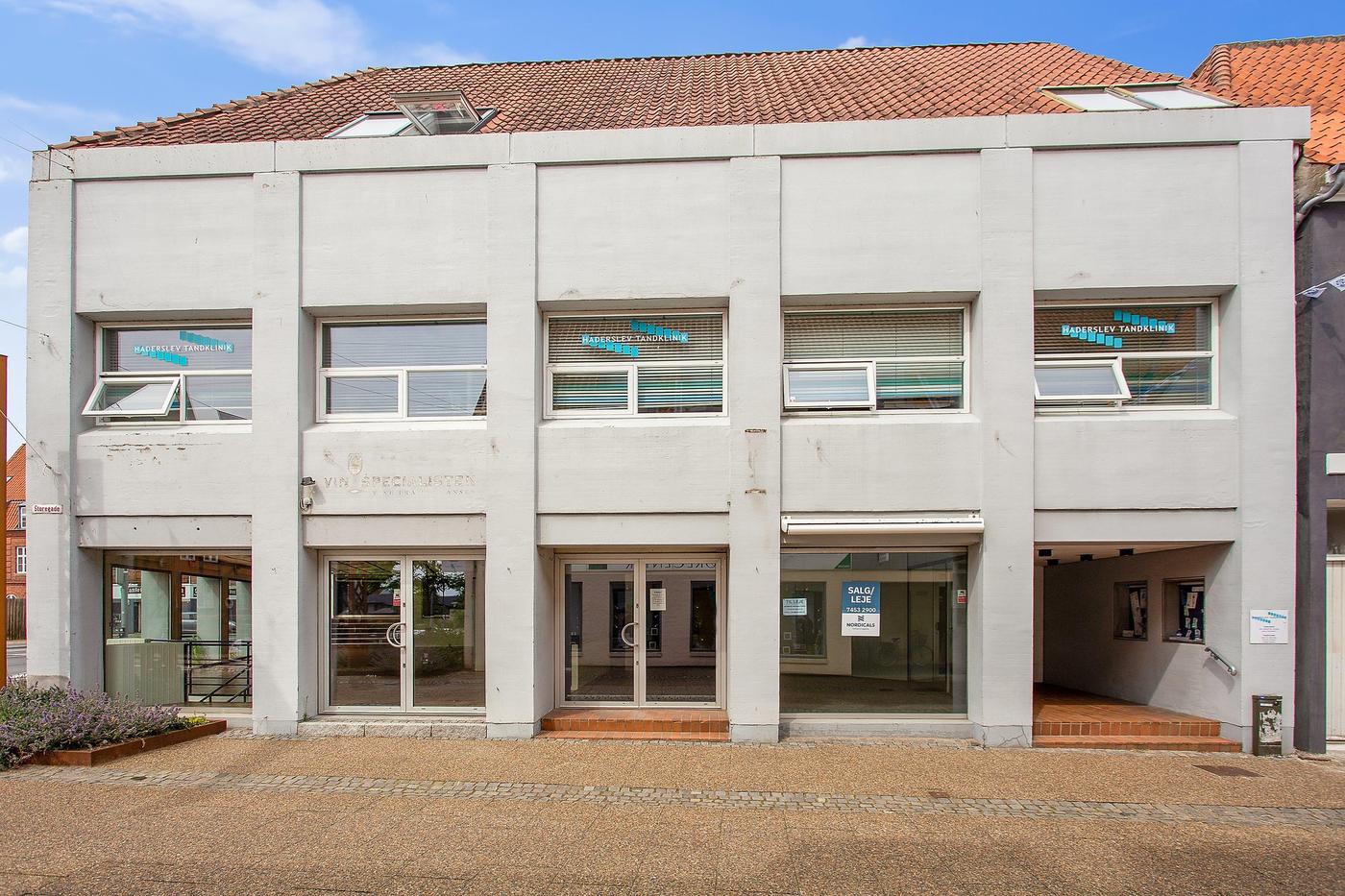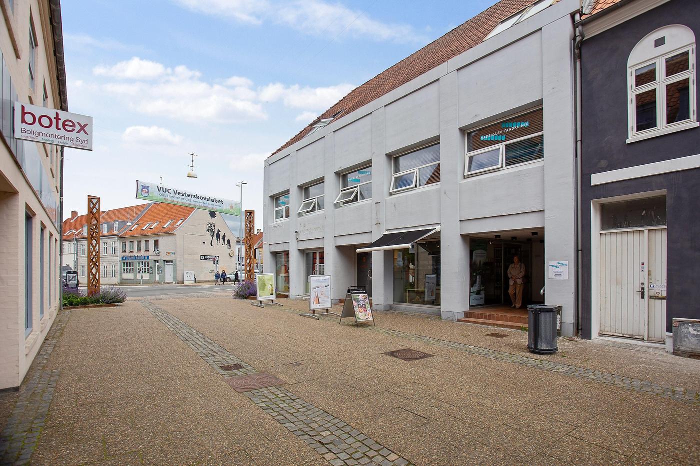 I starten af gågaden og ud til et af de mest trafikerede kryds i Haderslev, ligger dette erhvervslejemål, som i mange år har været vinbutik, med tilhørende smagslokale i kælderen.