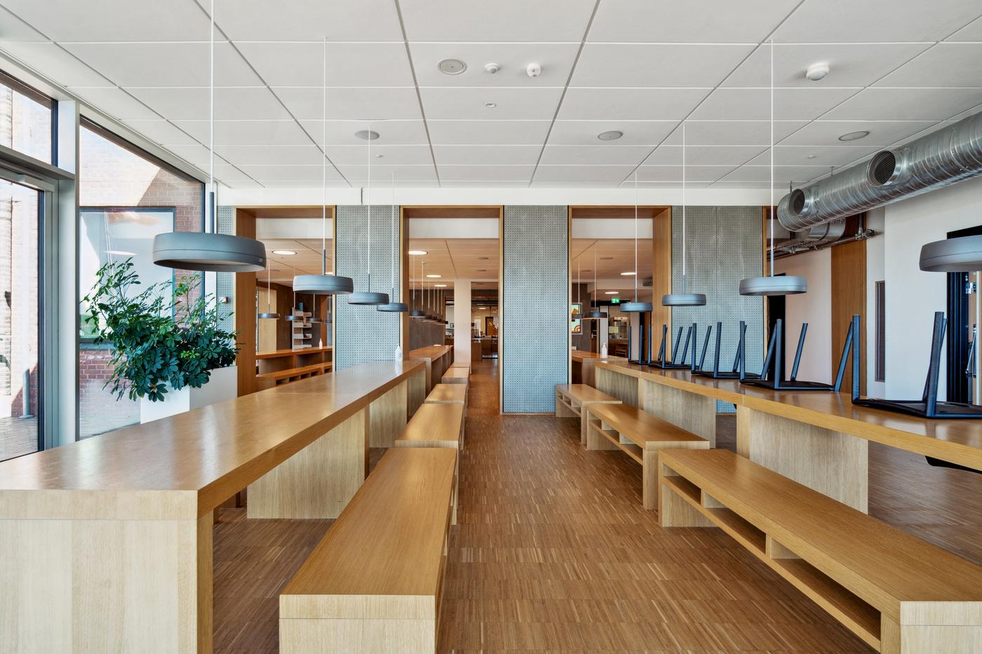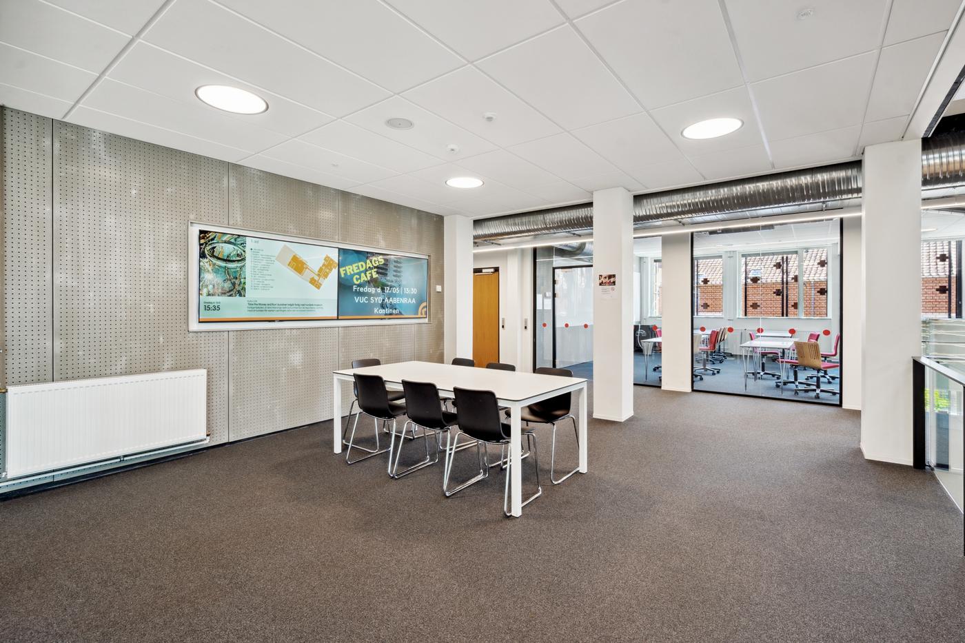 Indvendigt er VUC Syd Aabenraa designet med fokus på fleksibilitet og åbenhed. De rummelige og lyse lokaler er indrettet med moderne møbler, der muliggør forskellige konfigurationer til undervisning og gruppearbejde. Den centrale atrium fungerer som bygningens hjerte, hvor store vinduespartier tillader naturligt lys at strømme ind, hvilket skaber en varm og indbydende atmosfære. Biblioteket og studieområderne tilbyder en rolig og indbydende oase,