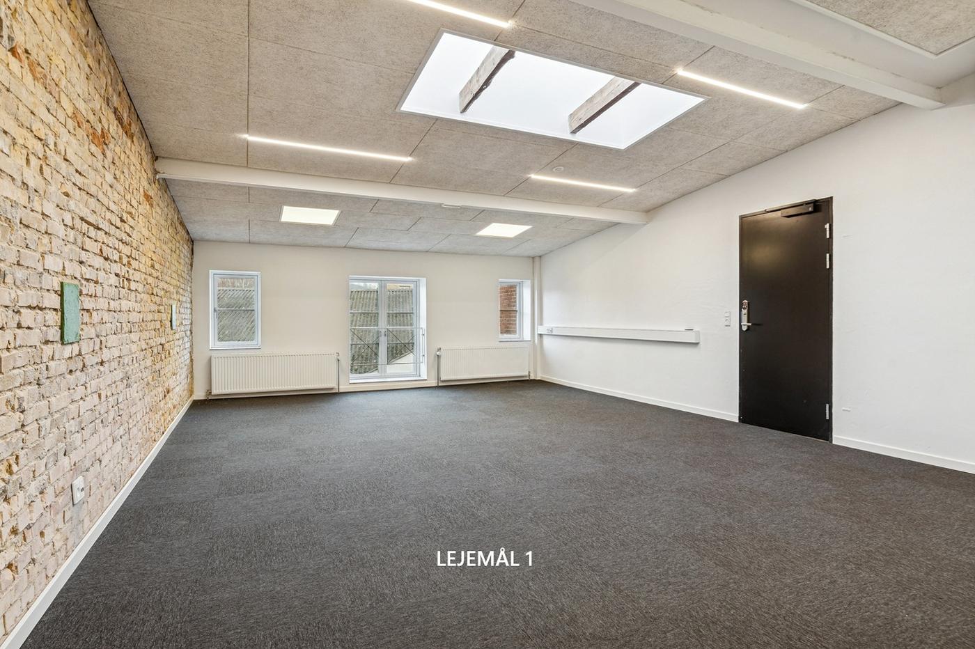 Der udbydes i alt to kontorlejemål i inspirerende omgivelser: Lejemål 1: Kontor på 45 m², som med tillagt vægtet fællesareal udgør et samlet lejemålsareal på 103 m². Lejemål 2: Kontor på 90 m², som sammen med tillagt vægtet fællesareal giver et samlet lejemålsareal på 189 m².