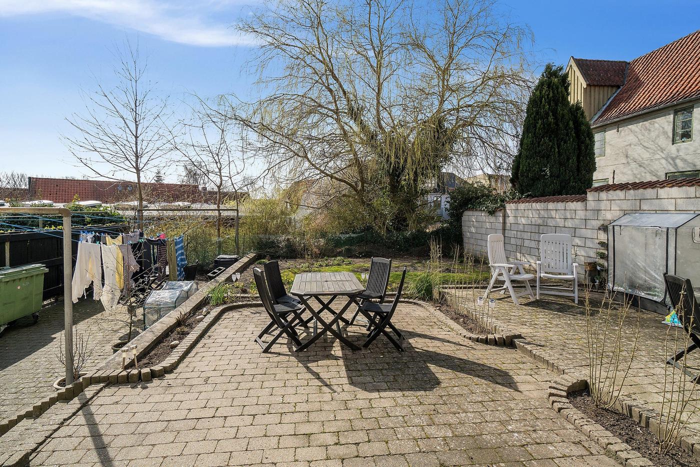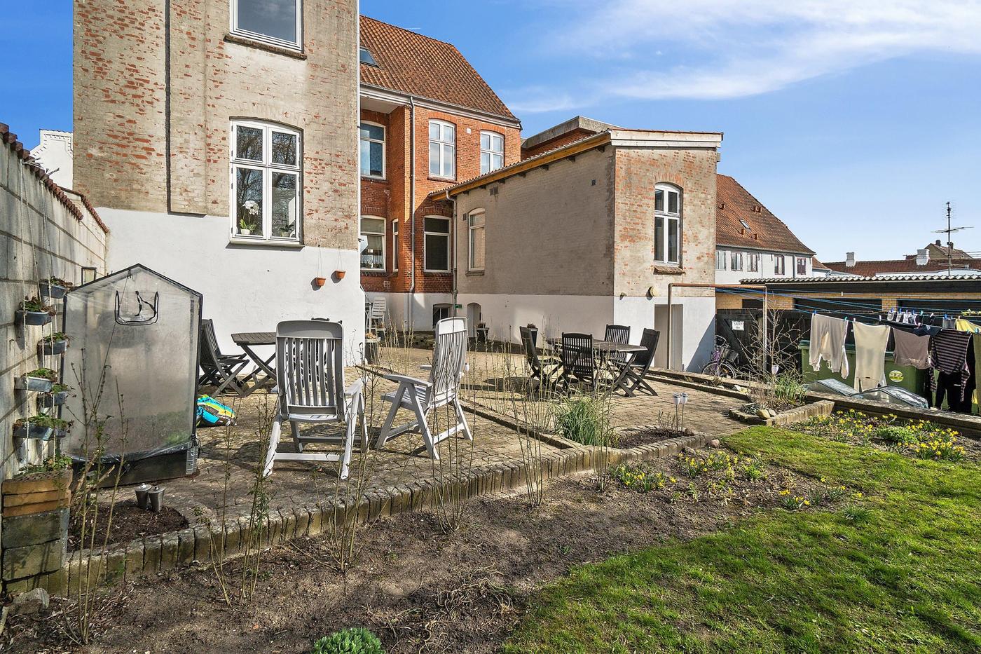 Bag ved ejendommen er der en gårdhave/terrasse der er flisebelagt og til fælles benyttelse. Grunden udgør alene 373 m2 og der er derfor minimalt vedligeholdelse.