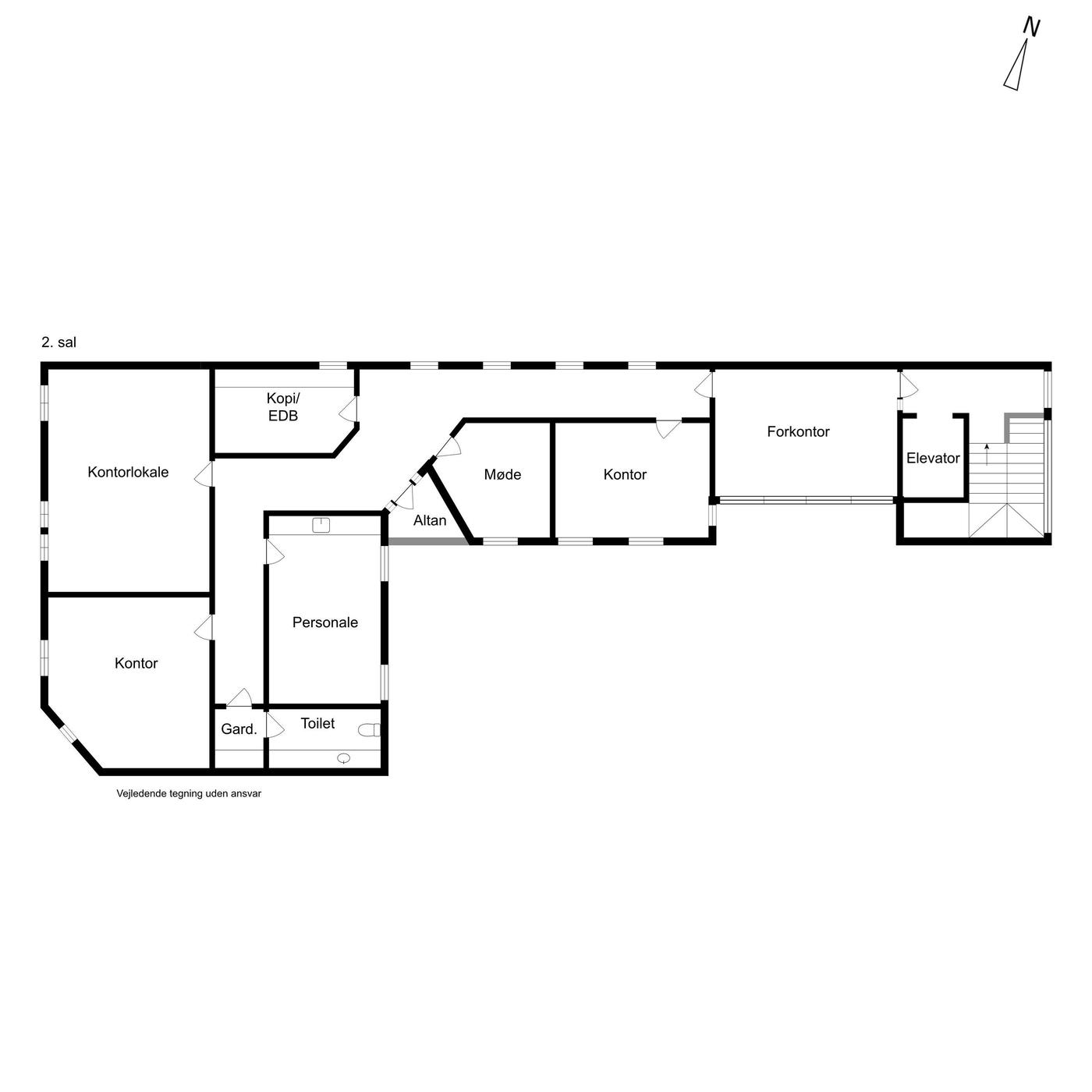 Indretningen er overvejende i lette konstruktioner, hvorfor indretningen nemt kan tilpasses lejers ønsker og behov. Den nuværende indretning er med såvel enkelt kontorer som fælles kontorer, undervisningslokaler, mødelokaler, reception-/modtagelsesrum og naturligvis toilet- og køkkenforhold. Der er et super godt lysindfald i alle rum.