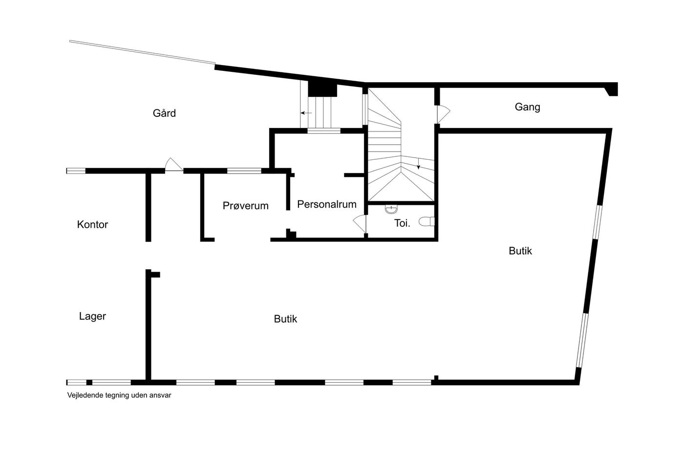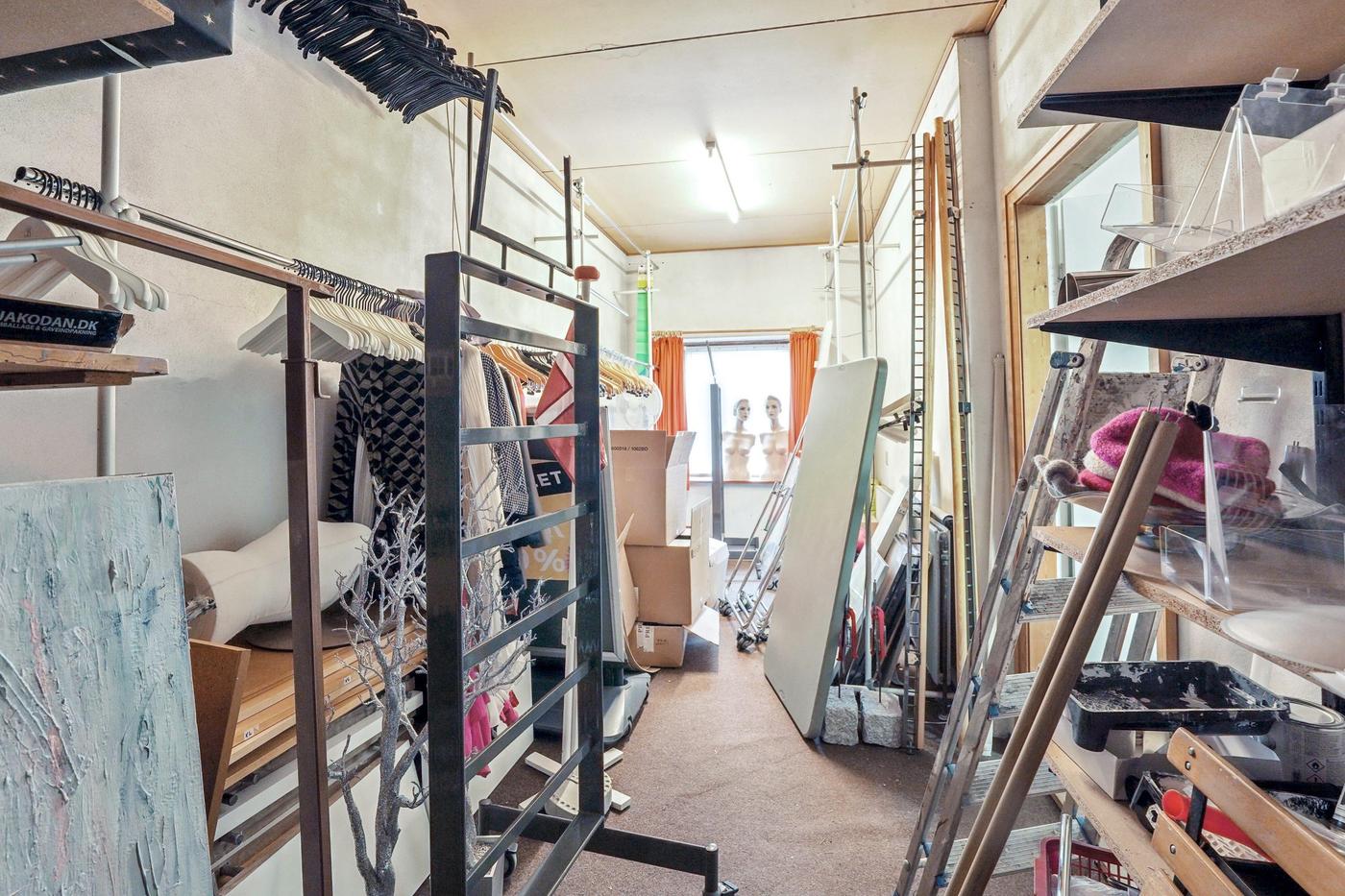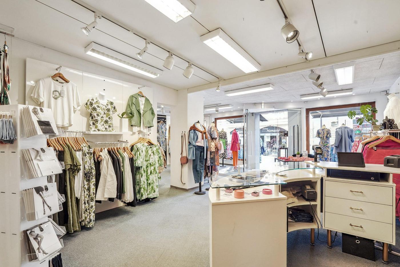 Der er 2 store facadevinduer til udstilling og indgang med glasdør. Butikken/salgsarealet er ét stort regulært lokale på 159 m². Bagerst i lokalet er der lagerfaciliteter samt kontor med udgang til baggård. Ydermere er der lager og personalerum med lille tekøkken og toilet.