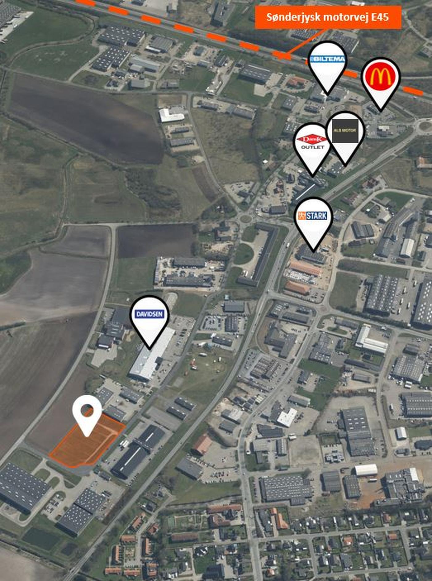 Meget velbeliggende erhvervsgrund i attraktivt område som fortsat udbygges. I området ligger virksomhederne bl.a. Davidsens Tømmerhandel, Harald Nyborg, Mercedes bilforretning, Biltema og T-hansen.