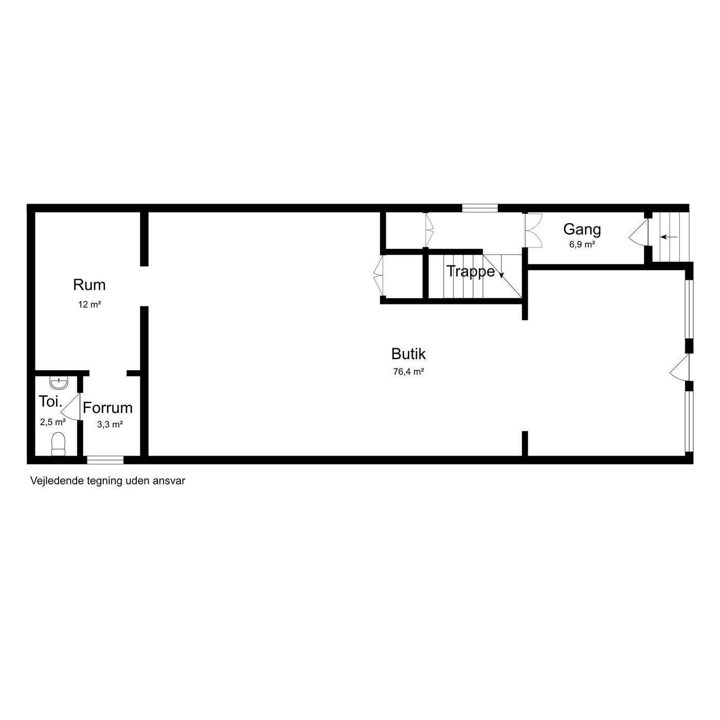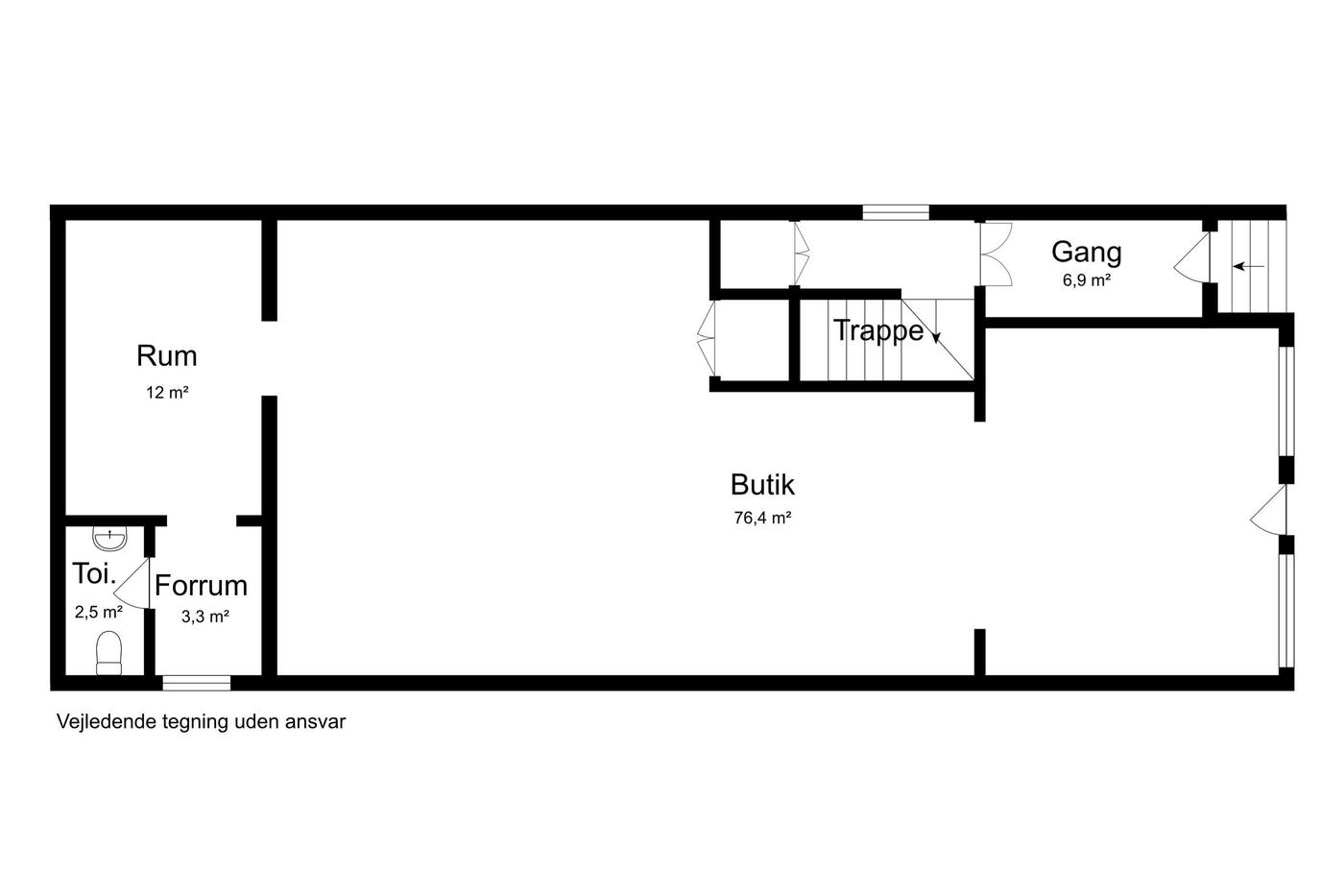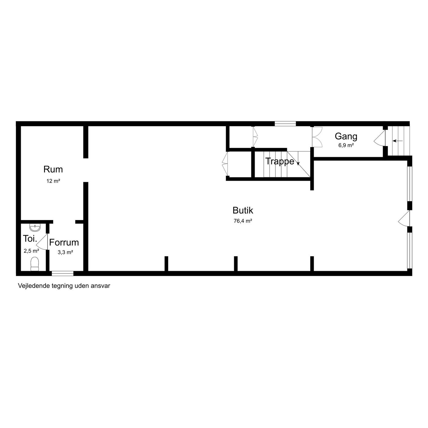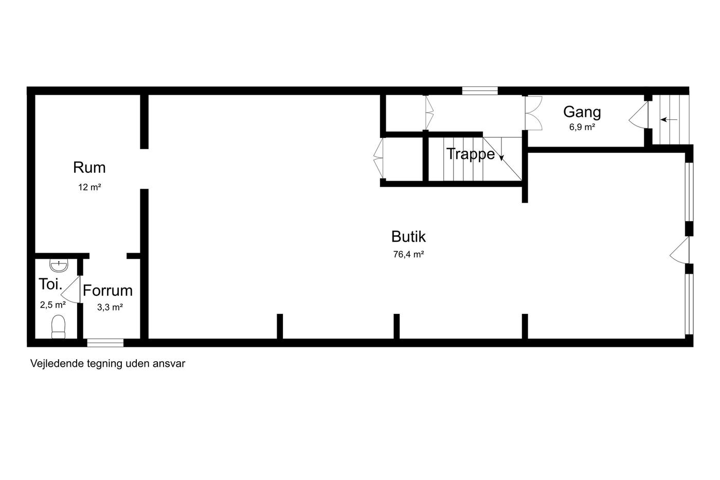 Indgang til lejemålet sker direkte fra gågaden til stort butikslokale, på hver side af døren er der store butiksvinduer som er helt ideel til udstilling og reklame. Fra butikken er personaleafdeling med køkken og toilet, også helt nyt. Lejemålet står pt. uden gulvbelægning og loftsplader, dette vil efter nærmere aftale blive færdiggjort inden indflytning.