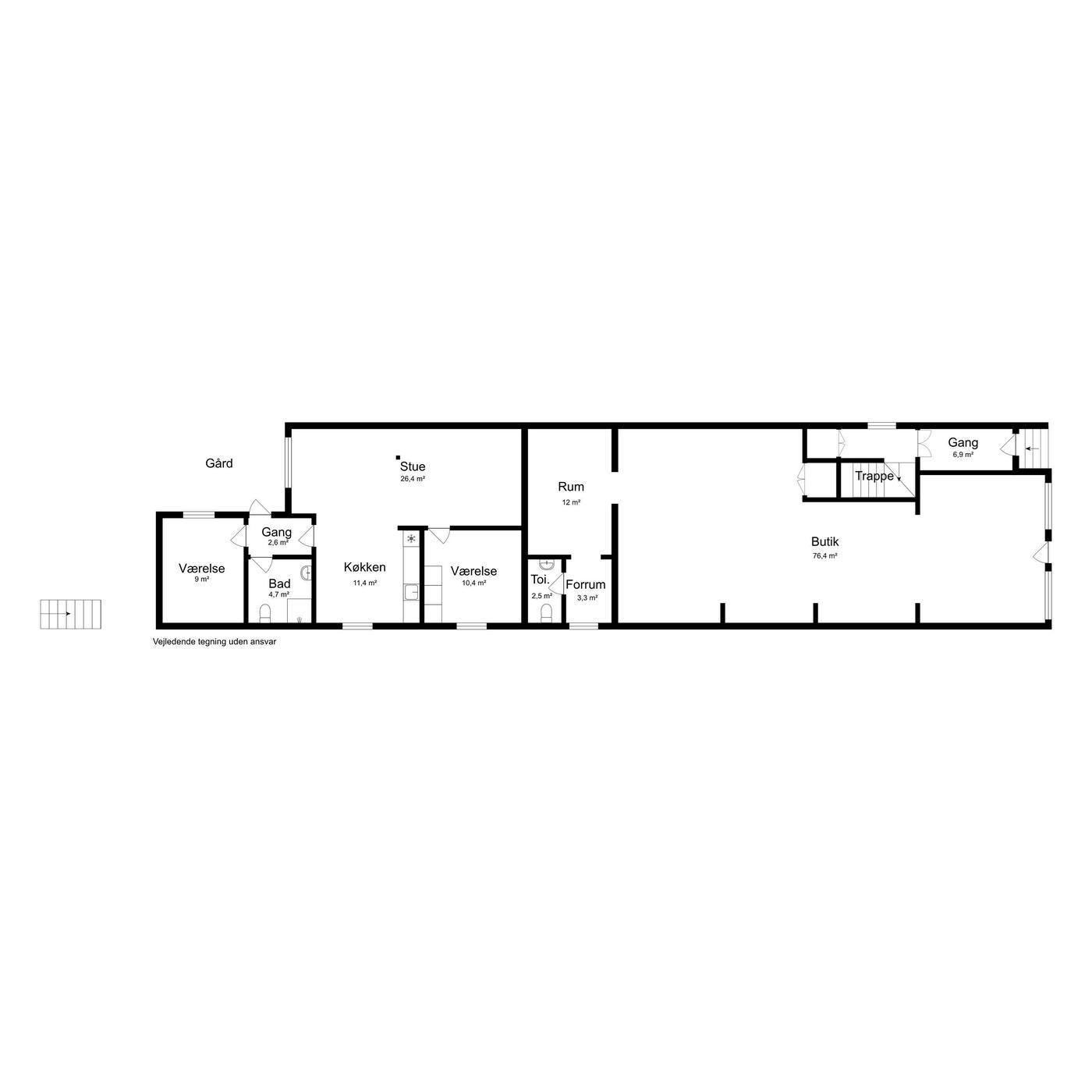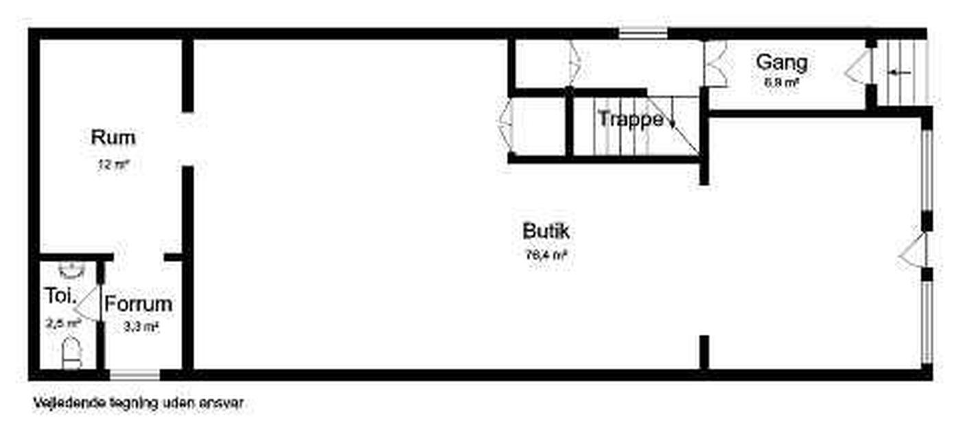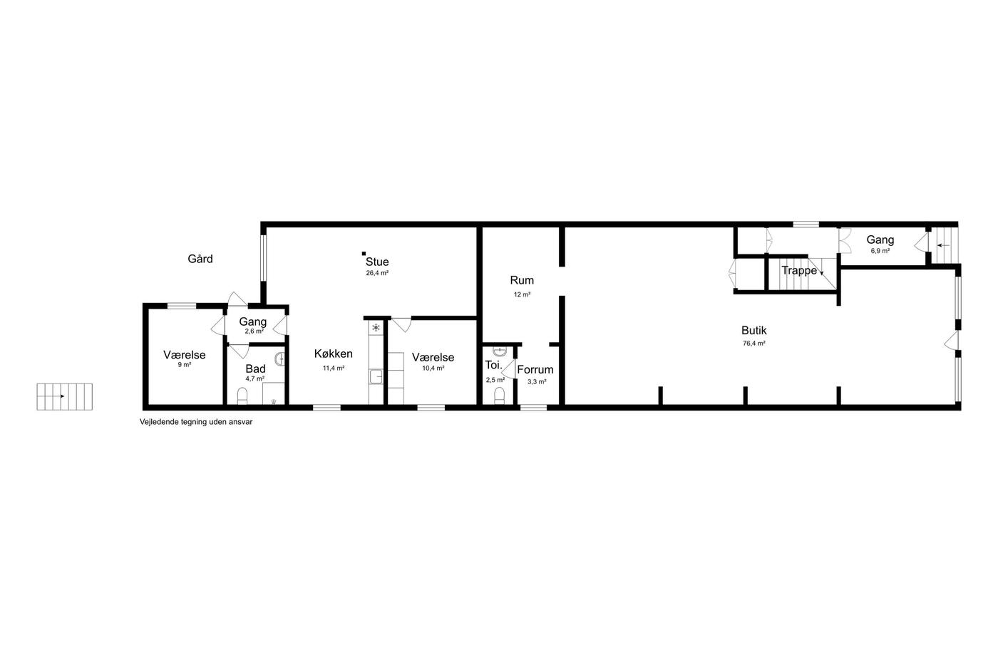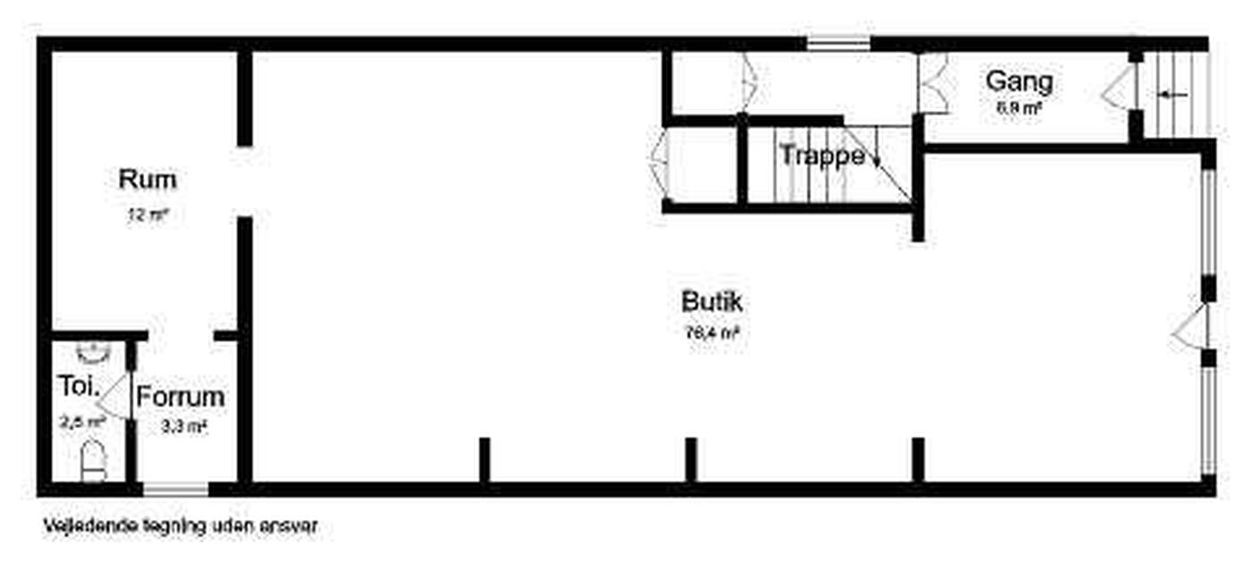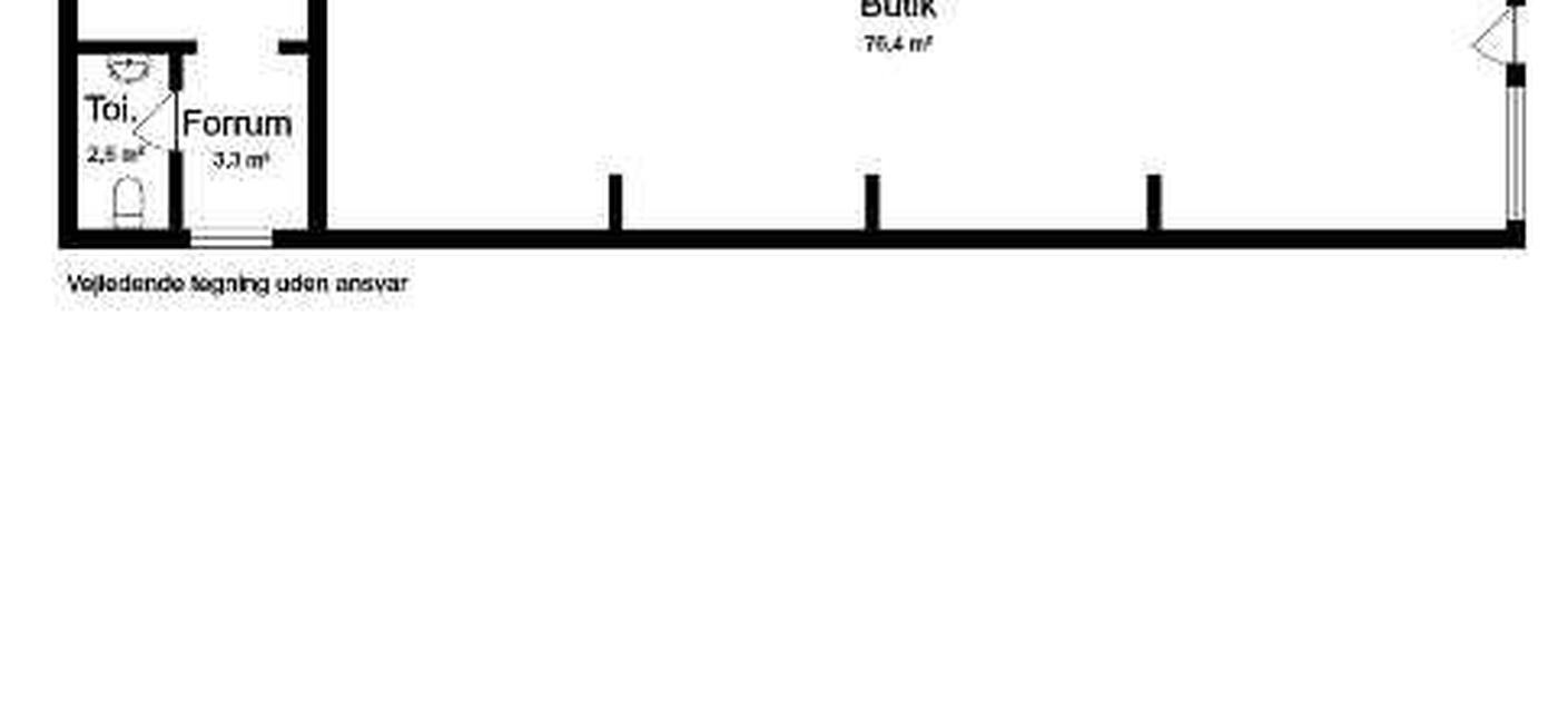 Indgang til lejemålet sker direkte fra gågaden til stort butikslokale, på hver side af døren er der store butiksvinduer som er helt ideel til udstilling og reklame. Fra butikken er personaleafdeling med køkken og toilet, også helt nyt. Lejemålet står pt. uden gulvbelægning og loftsplader, dette vil efter nærmere aftale blive færdiggjort inden indflytning.