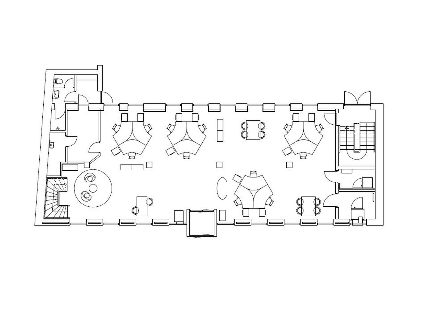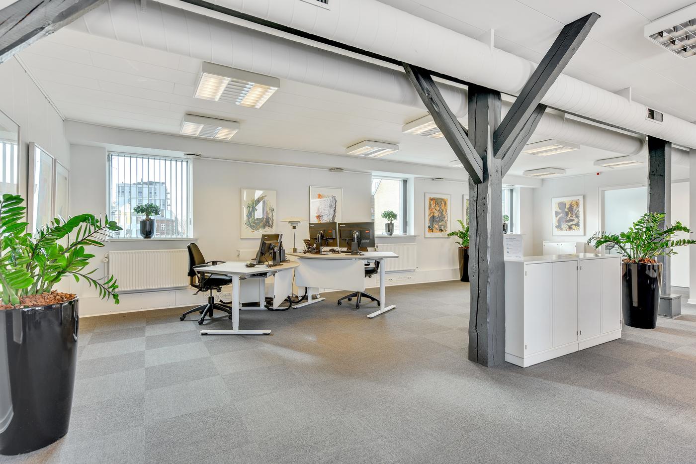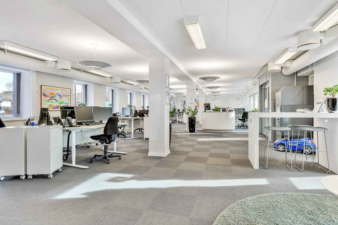 Stueplanen er indrettet med et lyst og åbent kontormiljø samt en trappe til første sal, hvor der findes yderligere kontorlokaler, mødelokaler og personalefaciliteter. Foran stueplanen er der anlagt private parkeringspladser, delvist beliggende på ejendommens egen grund.