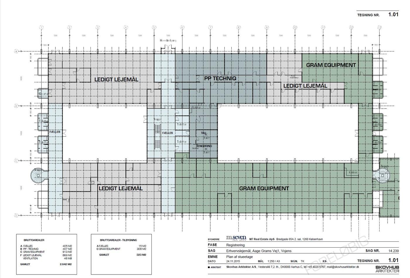 Hele administrationsbygningen er på i alt ca. 5.000 m². Bygningen har hovedindgang fra Aage Grams Vej, men også indgang fra arealet ud til produktionshallerne. Kontorlokalerne udlejes nymalet med nye gulve og lofter og hævet loftshøjde. Lejemålene varierer i størrelser, og der kan lejes lokaler fra 153 m² og opefter. Der er desuden muligheder for at leje ekstra m² i kælderen.