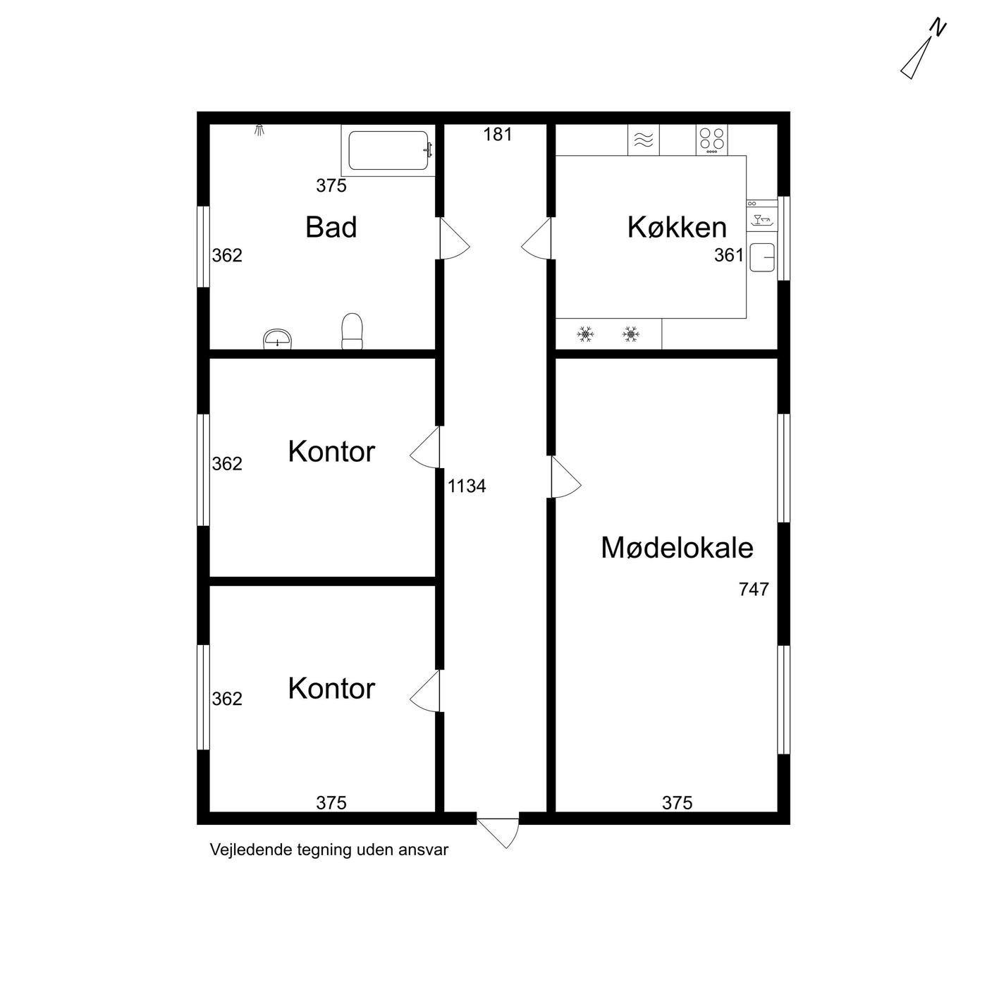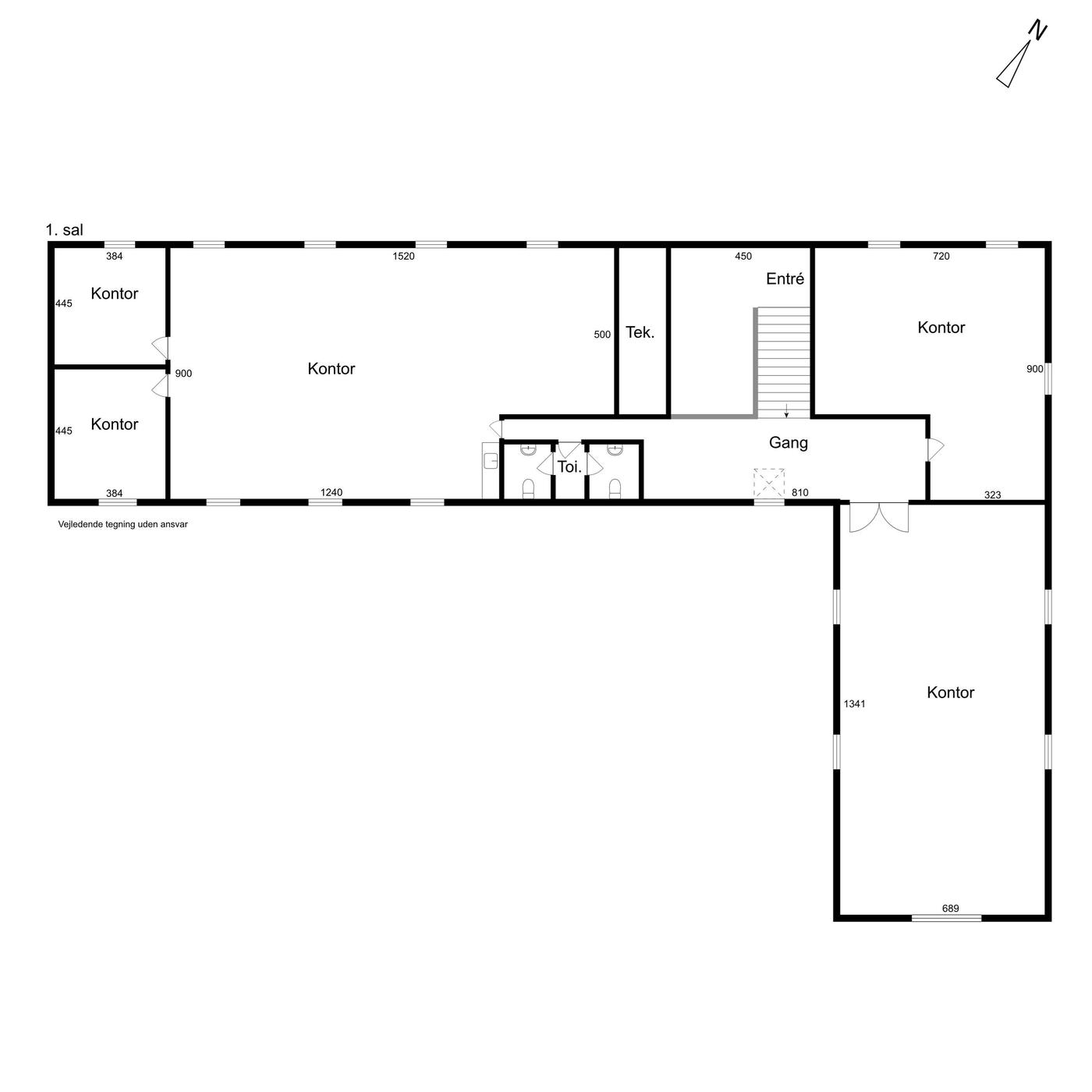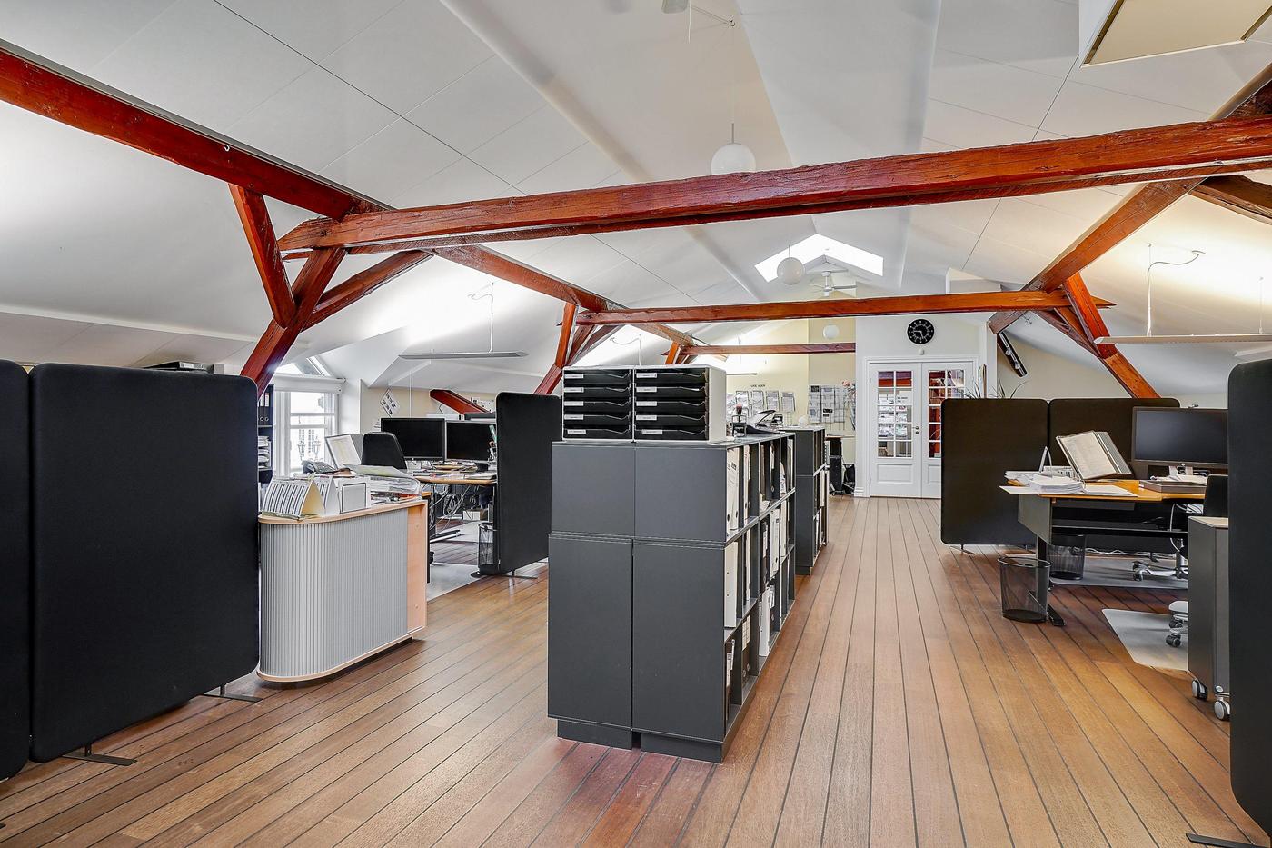 ¾ af 1. salen indeholder istandsatte kontorlokaler med egen indgang i stueplan. Lejemålet er med flotte mahognigulve lagt som skibsplankegulv med sorte fuger. Loftet er ført til kip med synlige bjælker fra konstruktionen. Vægge og lofter er udført i gipsplader og i tagryggen er der indlagt flere vinduespartier som giver lokalerne ekstra lysindfald.