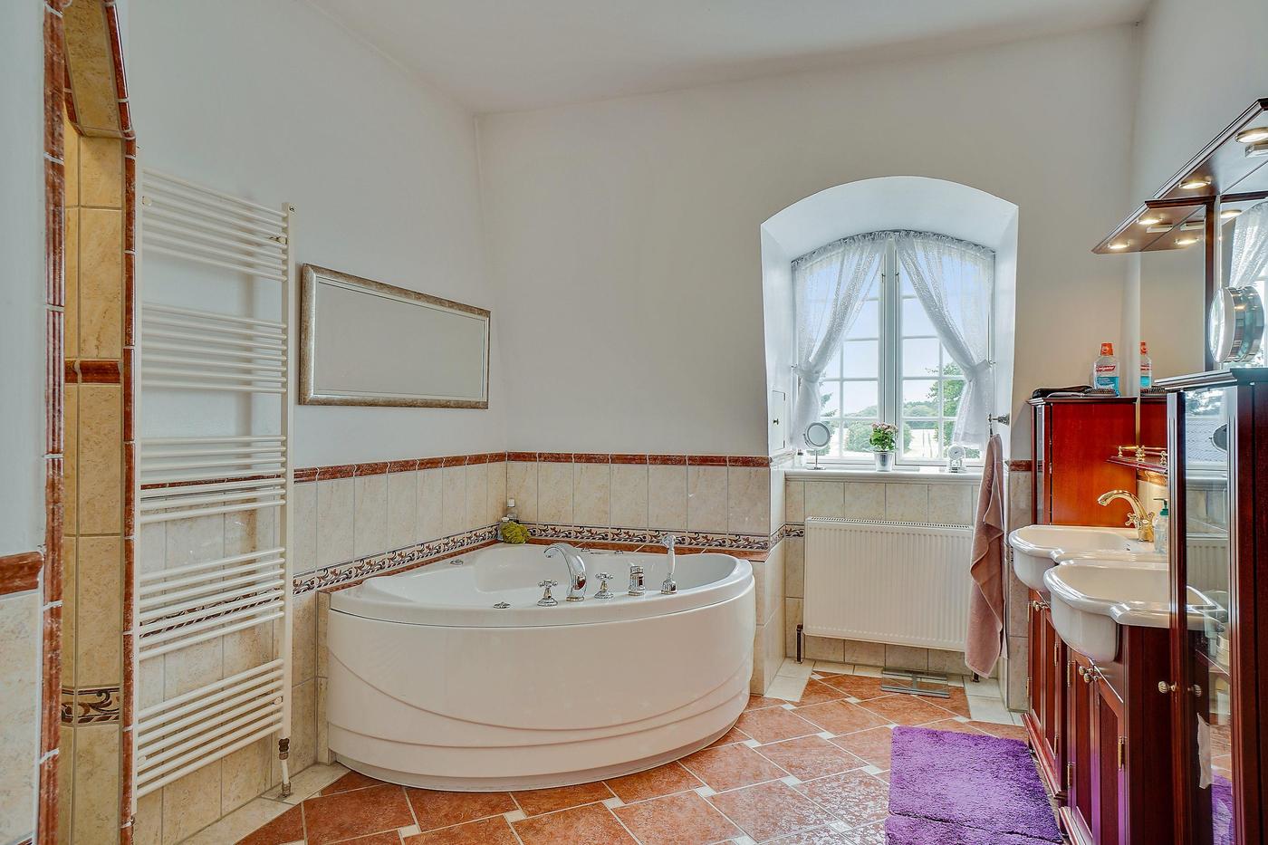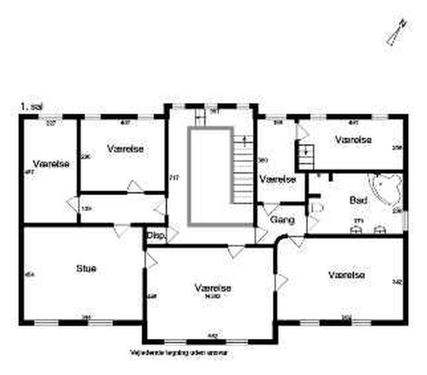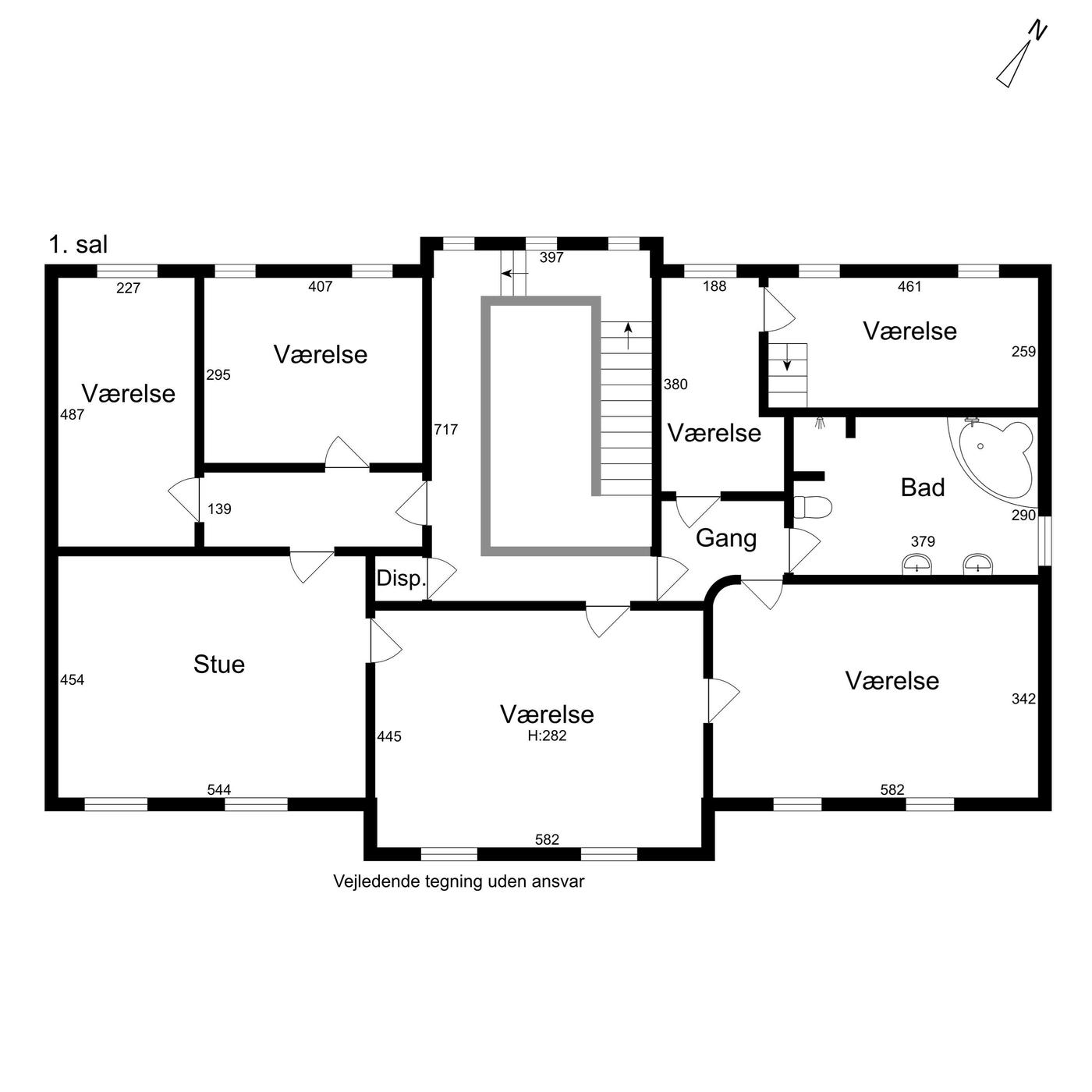 Fra hallen er der adgang til 1.salen via bredåbent trappe til repos/svalegang. Herfra er der adgang til 4 værelser, som enten er indrettet som soverum og/eller stue. Herudover stort og flot flisebelagt badeværelse med tilhørende spa.