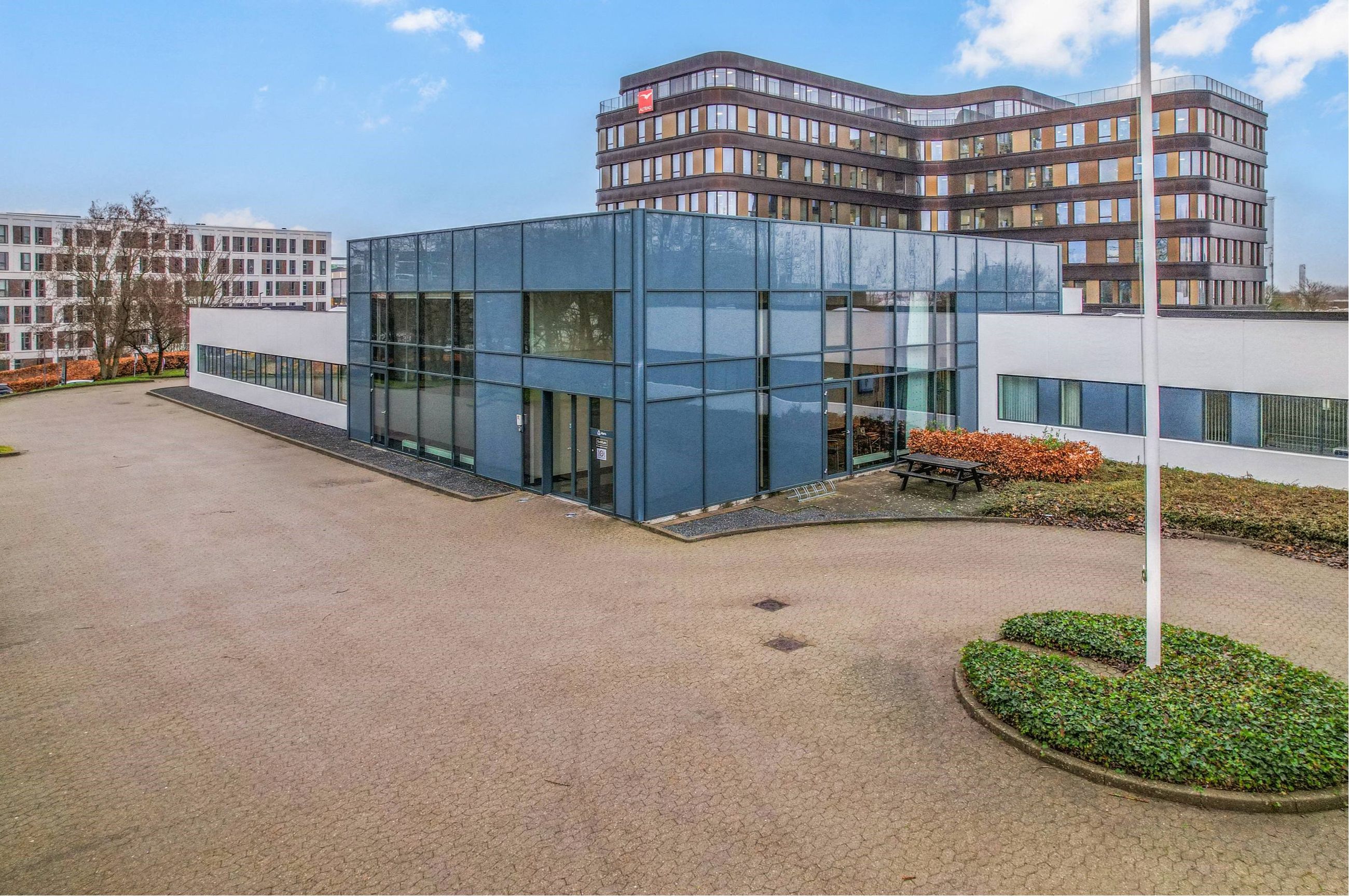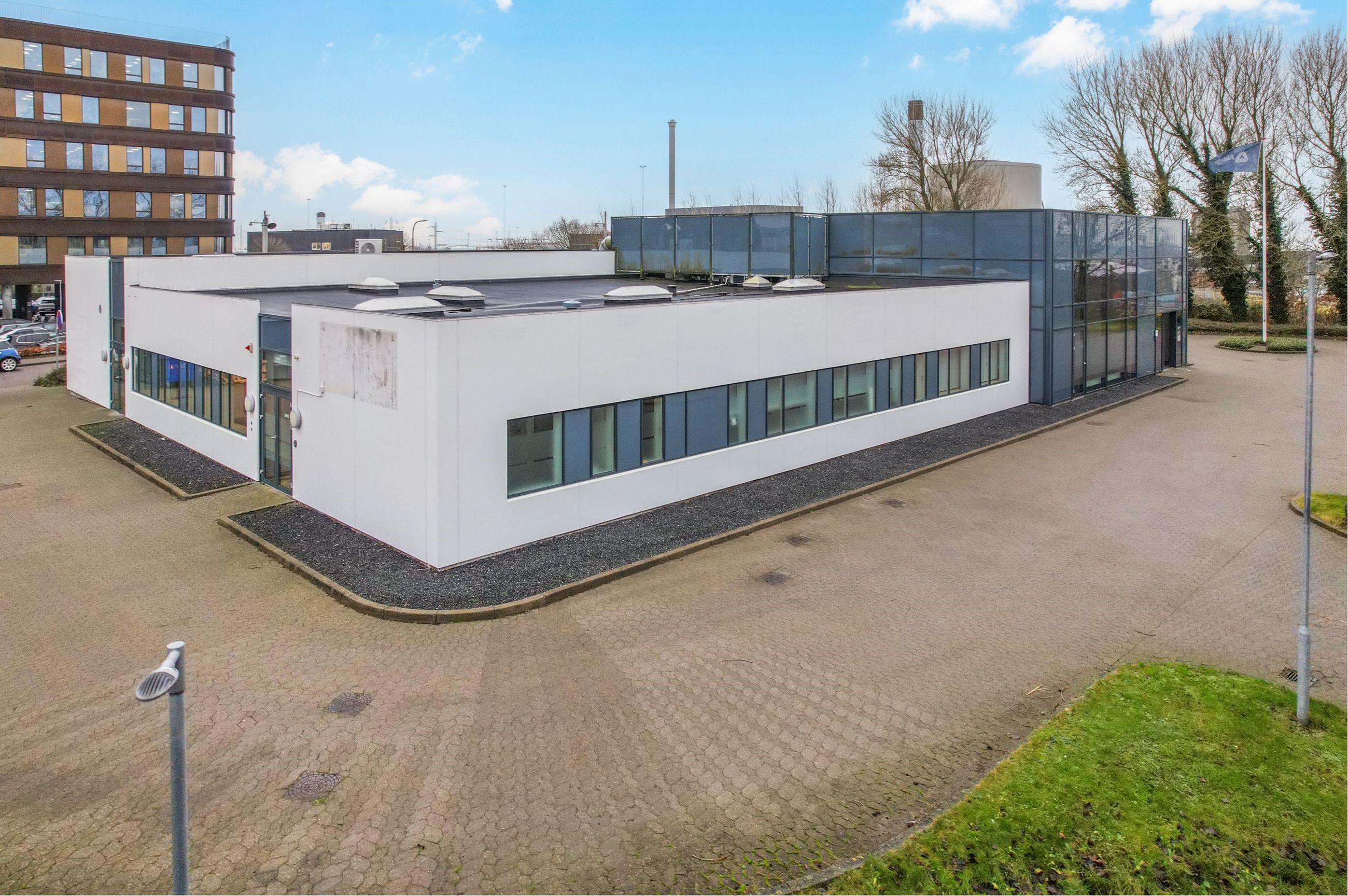 Beliggenhed: Ejendommen er beliggende på en grund der er tilbagetrukket, men tæt på både havnen og midtbyen. Der er hverken langt til Banegården, motorvejen, havnen eller centrum. Dette gør det nemt for ansatte og kunder at komme til denne lokation.