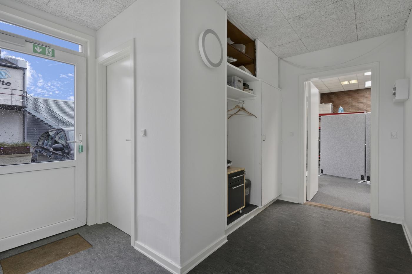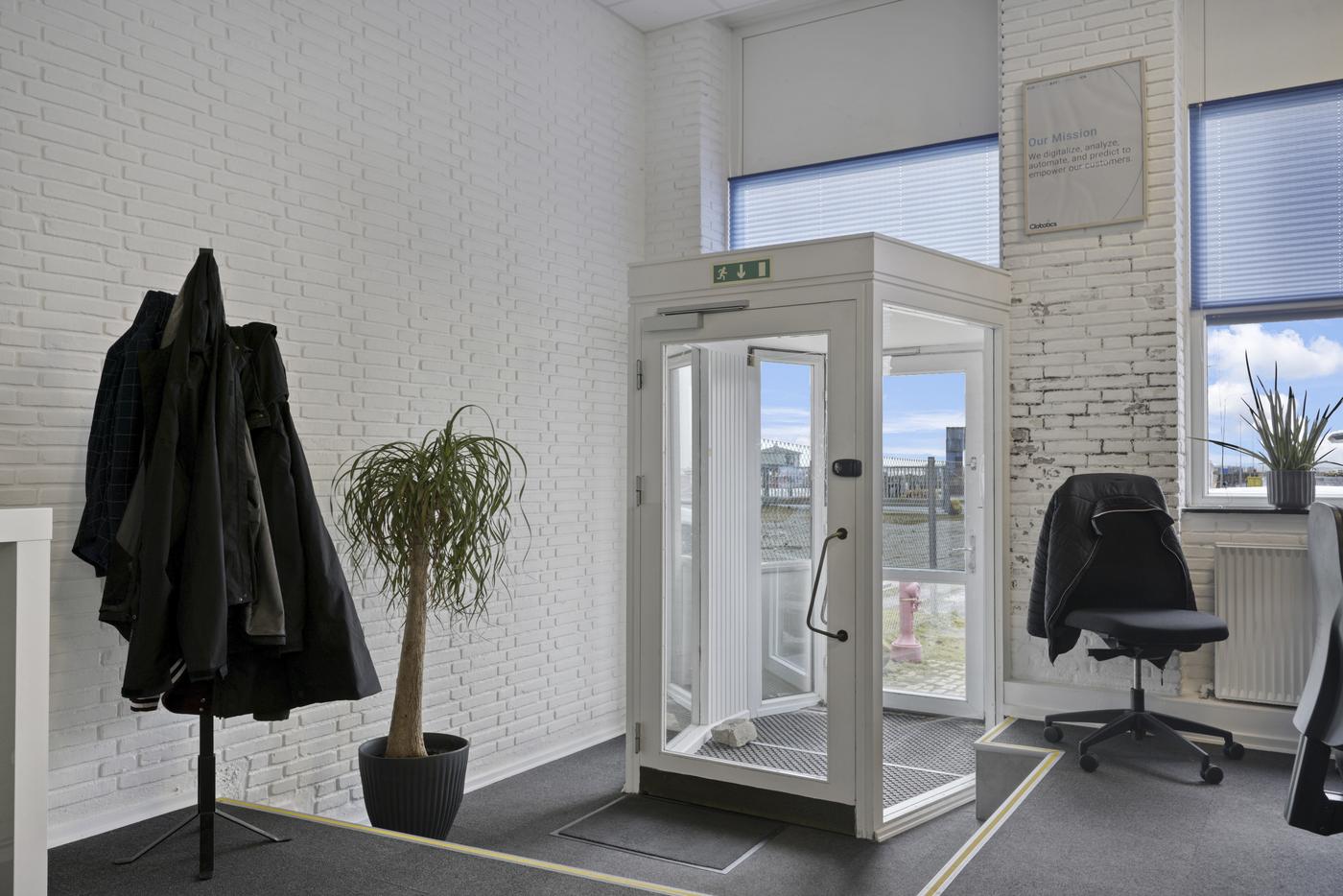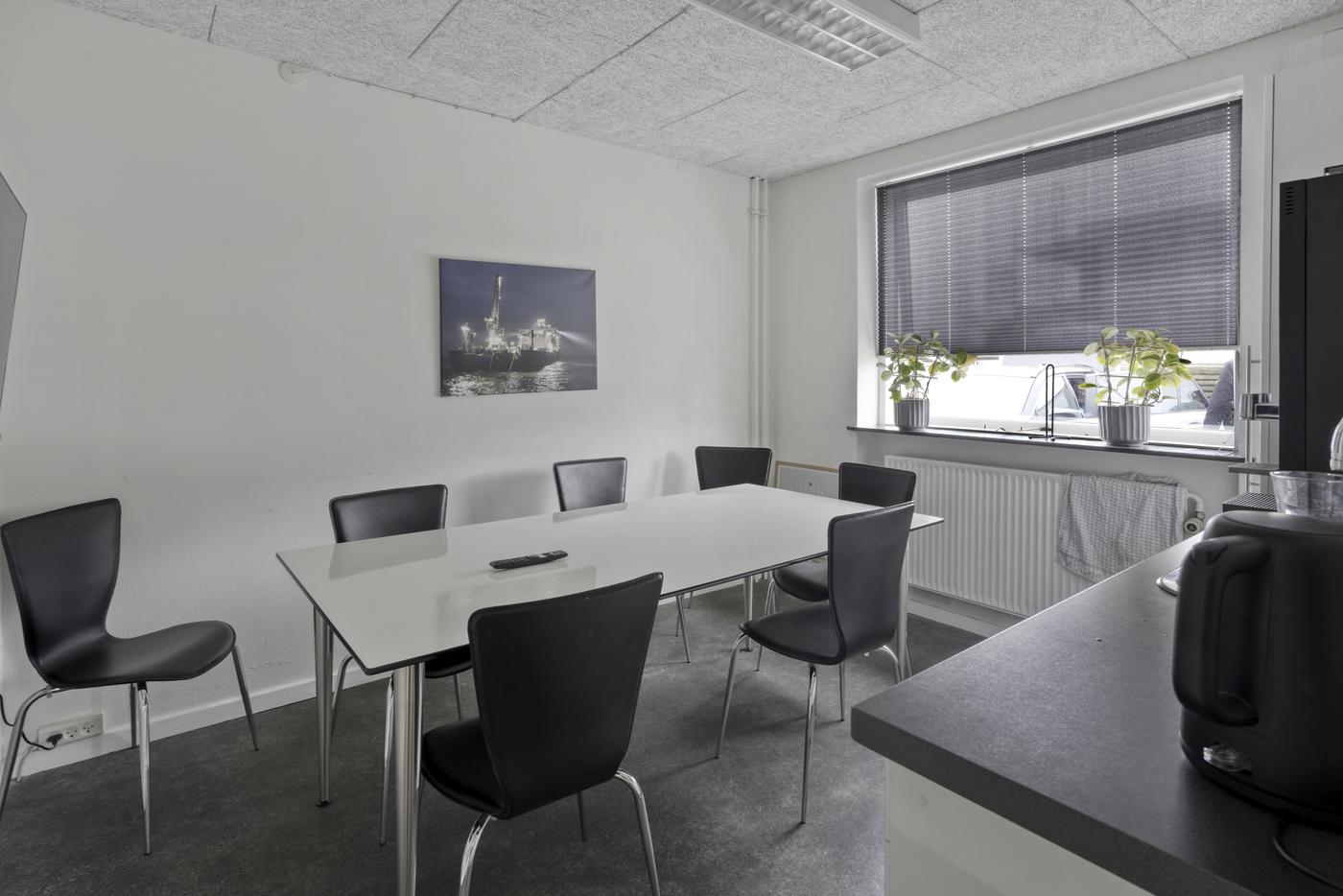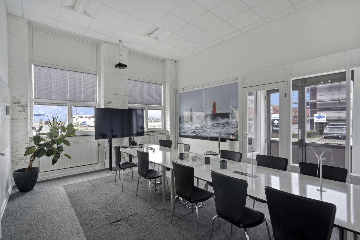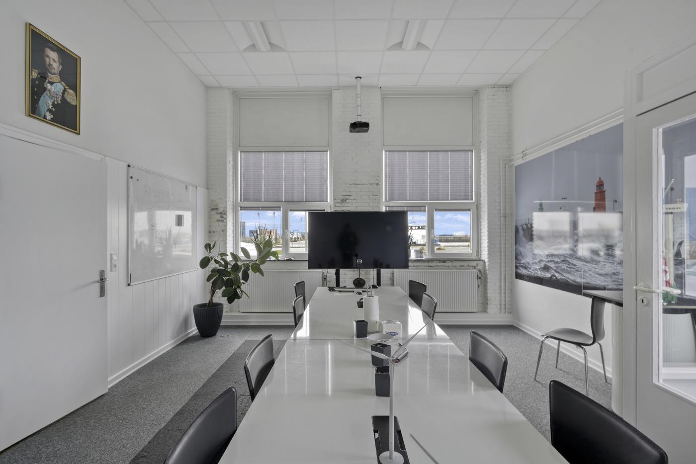 Indrettet med et pænt indgangsparti, som leder ind i det store fælles kontorlokale, som byder på et godt lysindfald og en fin udsigt til havnekajen. Udover dette er der også et større og lyst mødelokale, ligeså med udsigt til havnekajen. Lille fint frokostrum med et tekøkken.