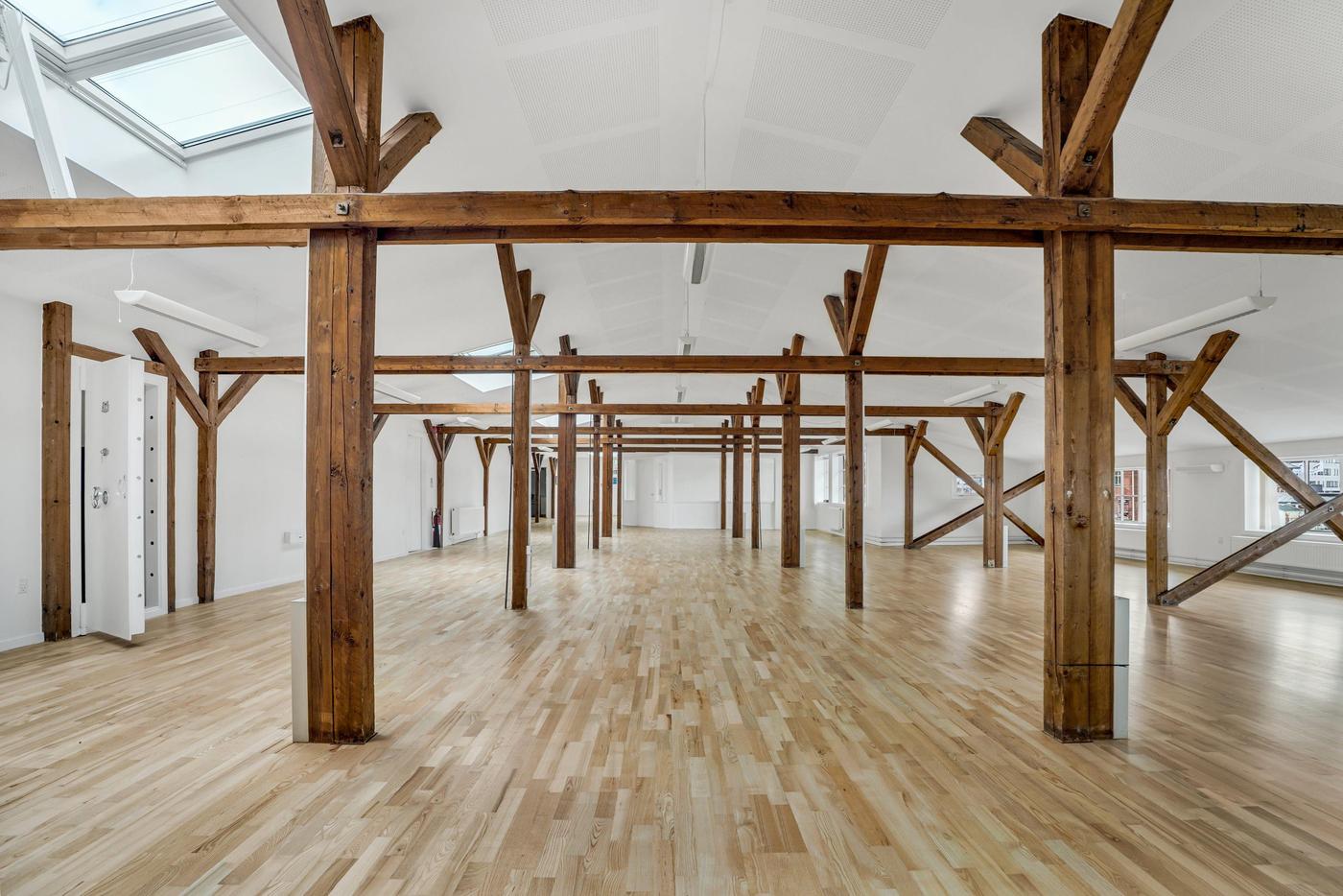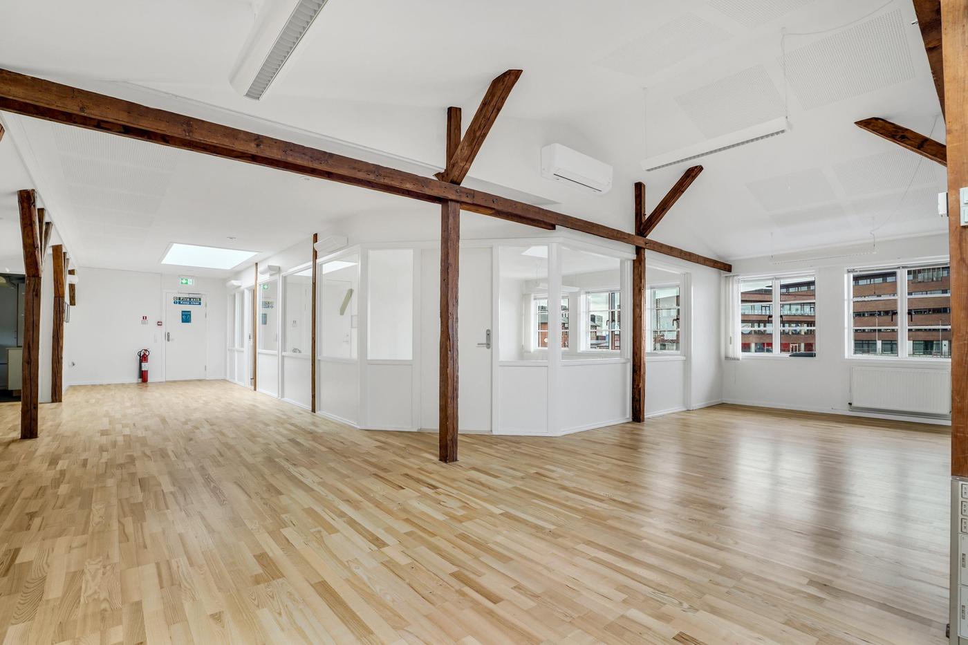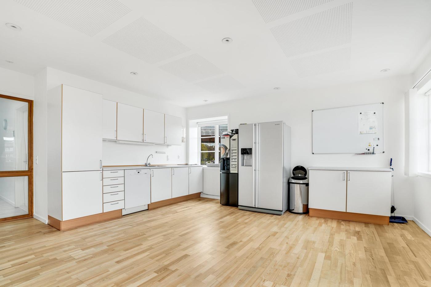 Lejemålet som ligger på 1. sal er indrettet med stort kontormiljø og reception, 2 chefkontorer med glaspartier, stor kantine med skydedør til konferencerum, garderobe, toiletter samt diverse arkiv og printerrum.