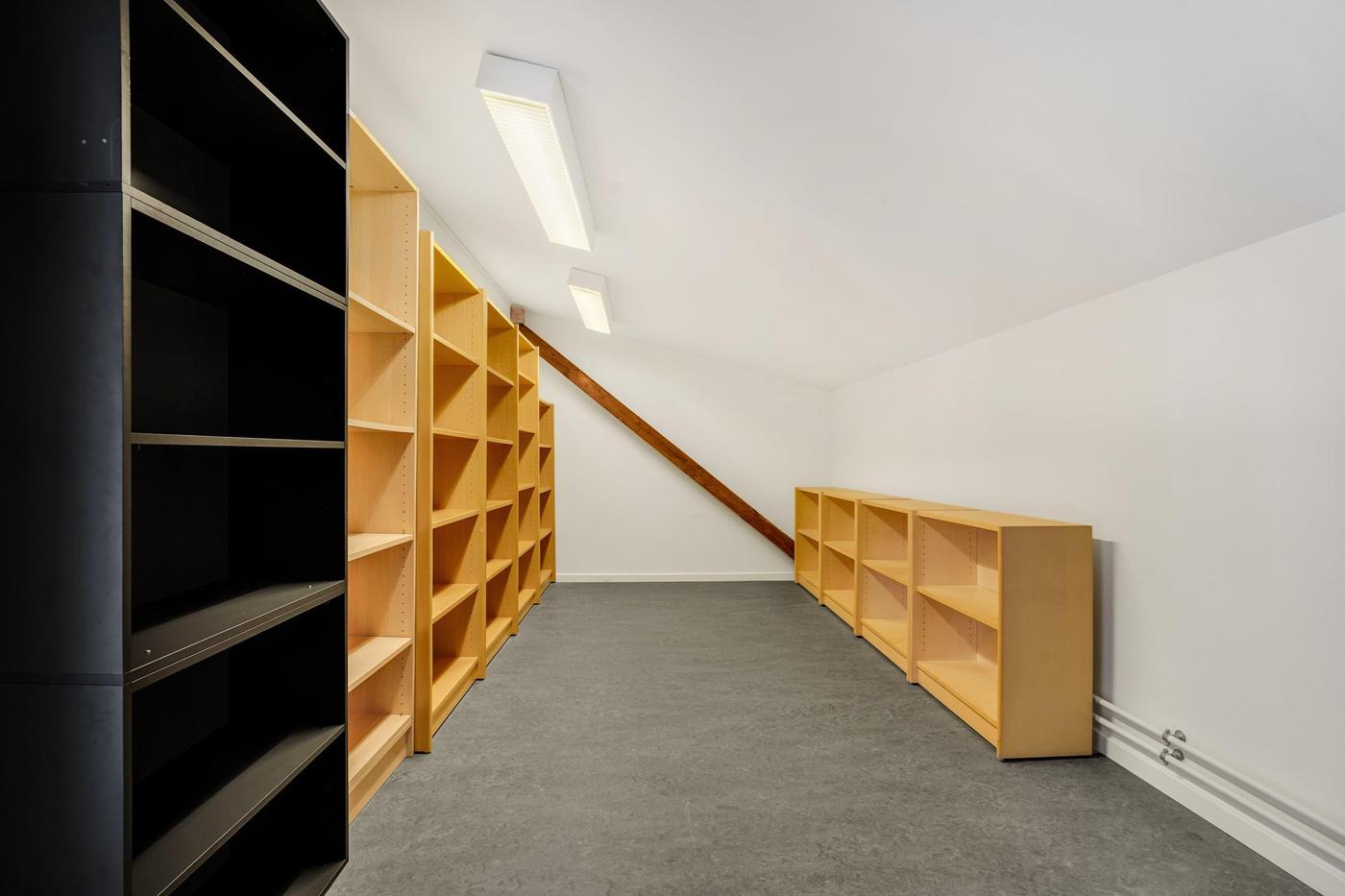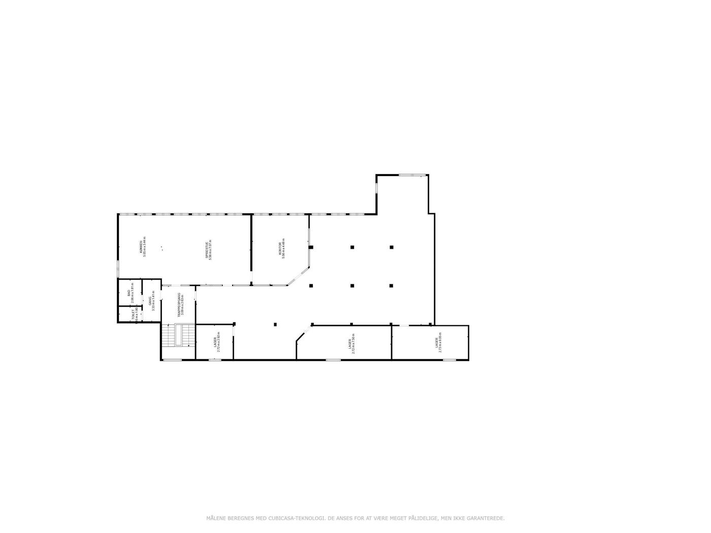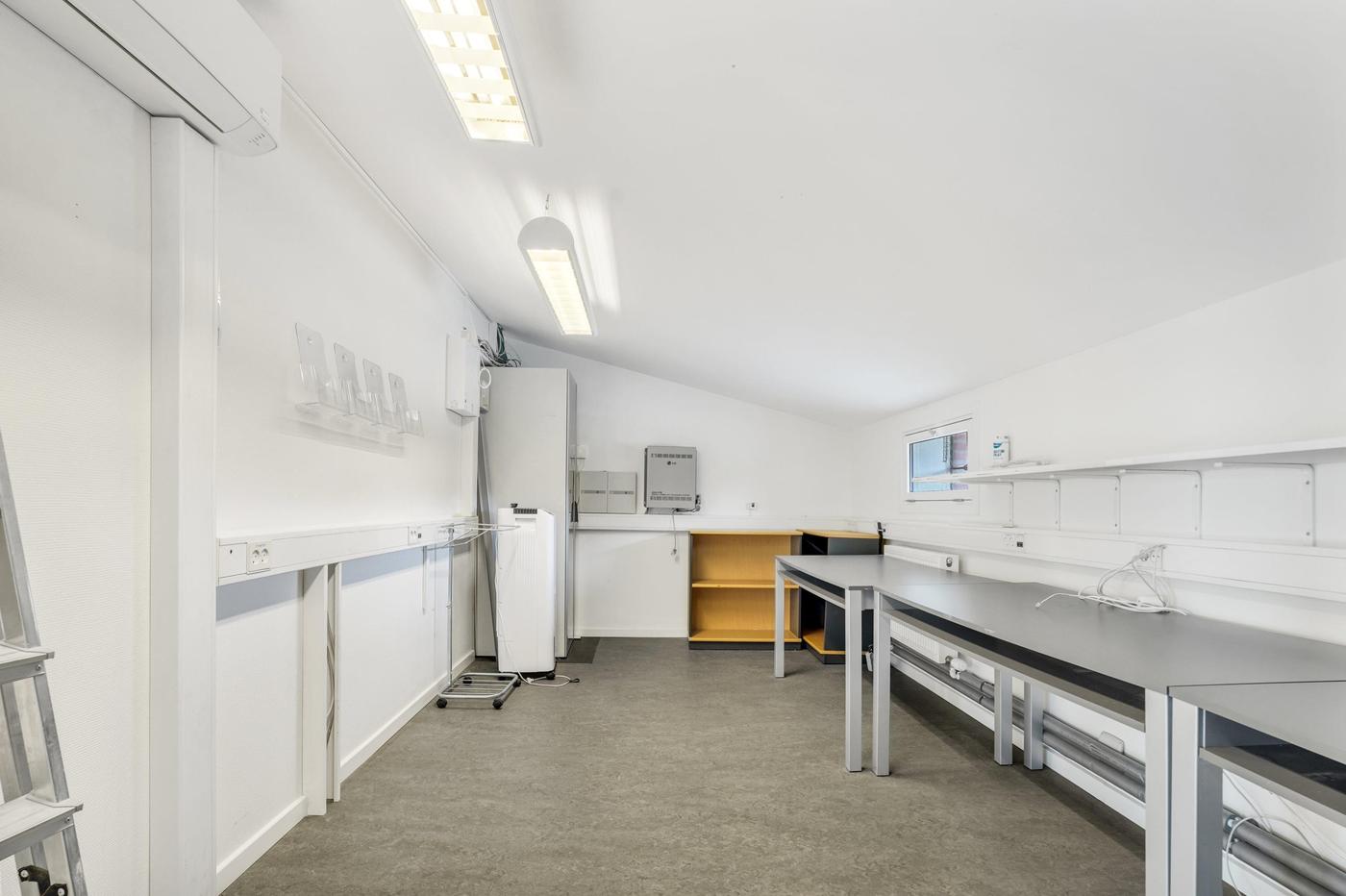 Lejemålet som ligger på 1. sal er indrettet med stort kontormiljø og reception, 2 chefkontorer med glaspartier, stor kantine med skydedør til konferencerum, garderobe, toiletter samt diverse arkiv og printerrum.