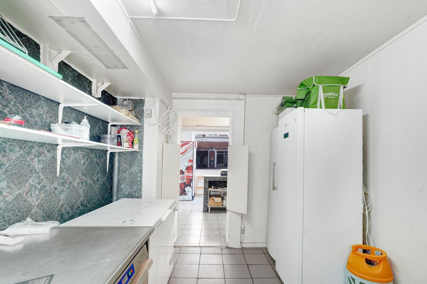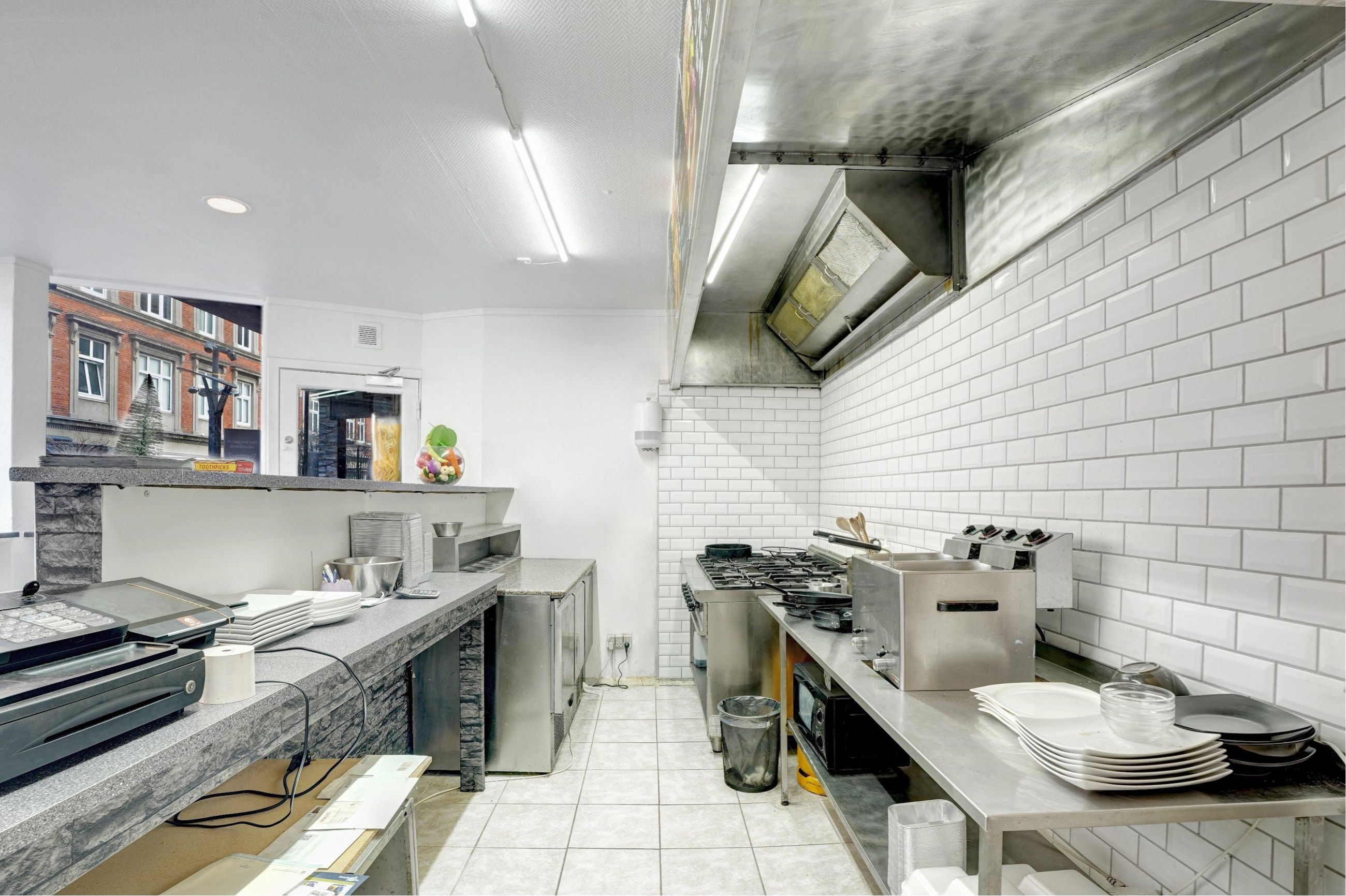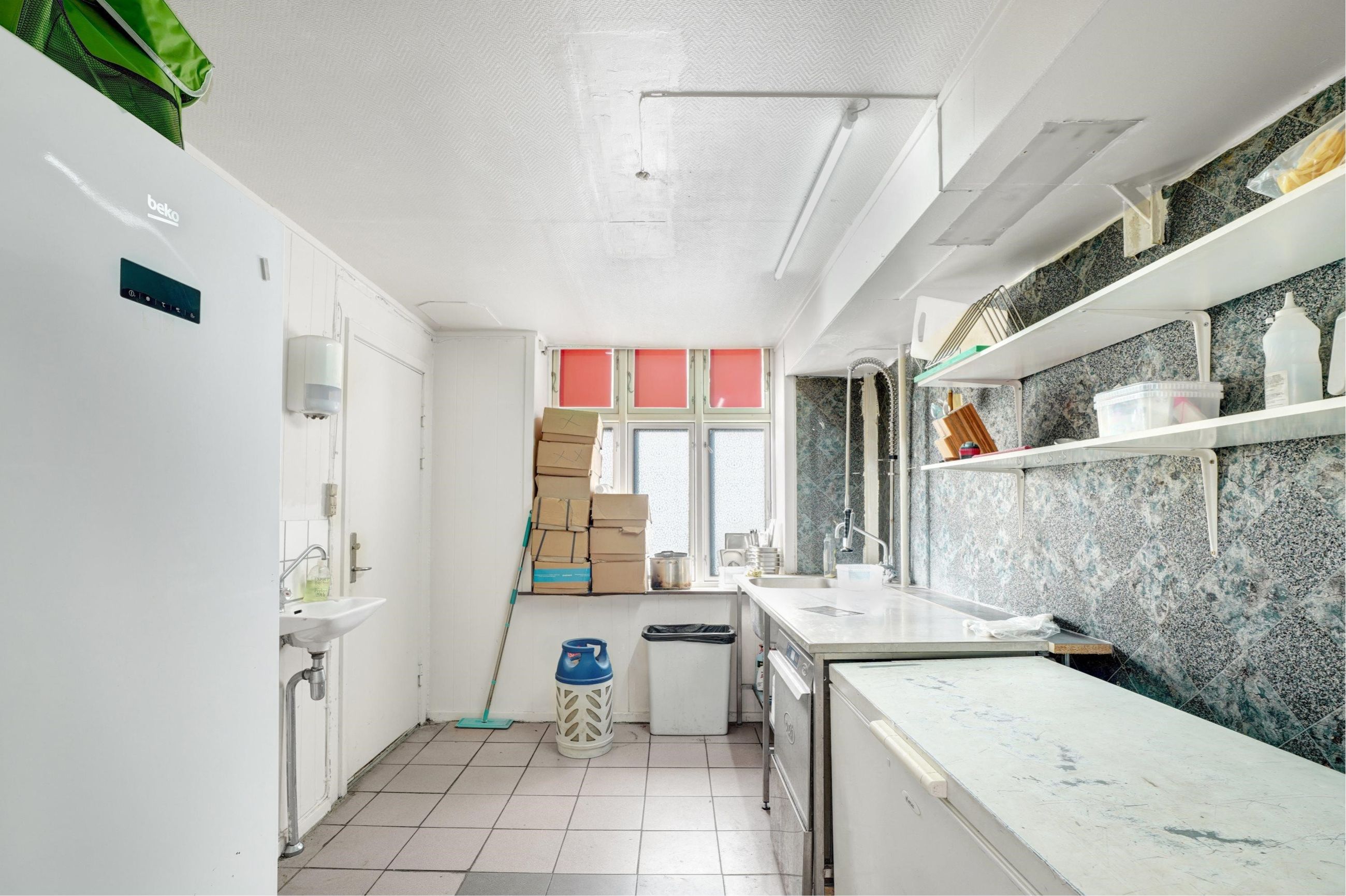 Beskrivelse: Lejemålet fordeler sig på 60 m² består af et forlokale, indrettet med køkken samt plads til betjening og afhentning. Der er mulighed for at indrette med f.eks. barstole til ventende gæster. Derudover findes et baglokale med bl.a. køleskab og opvaskemaskine, og god plads til opbevaring. Tilhørende findes et 100 m² kælderrum, hvor der bl.a. er personaletoilet.